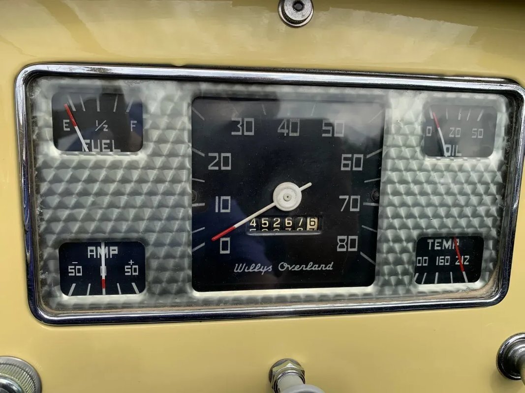 A two-spoke steering wheel with a chrome horn ring fronts a steel dash that is equipped with chrome trim. Centrally-mounted instrumentation consists of an 80-mph speedometer and gauges for fuel level, oil pressure, amperage, and coolant temperature. The five-digit odometer shows 45k miles. Total mileage is unknown.