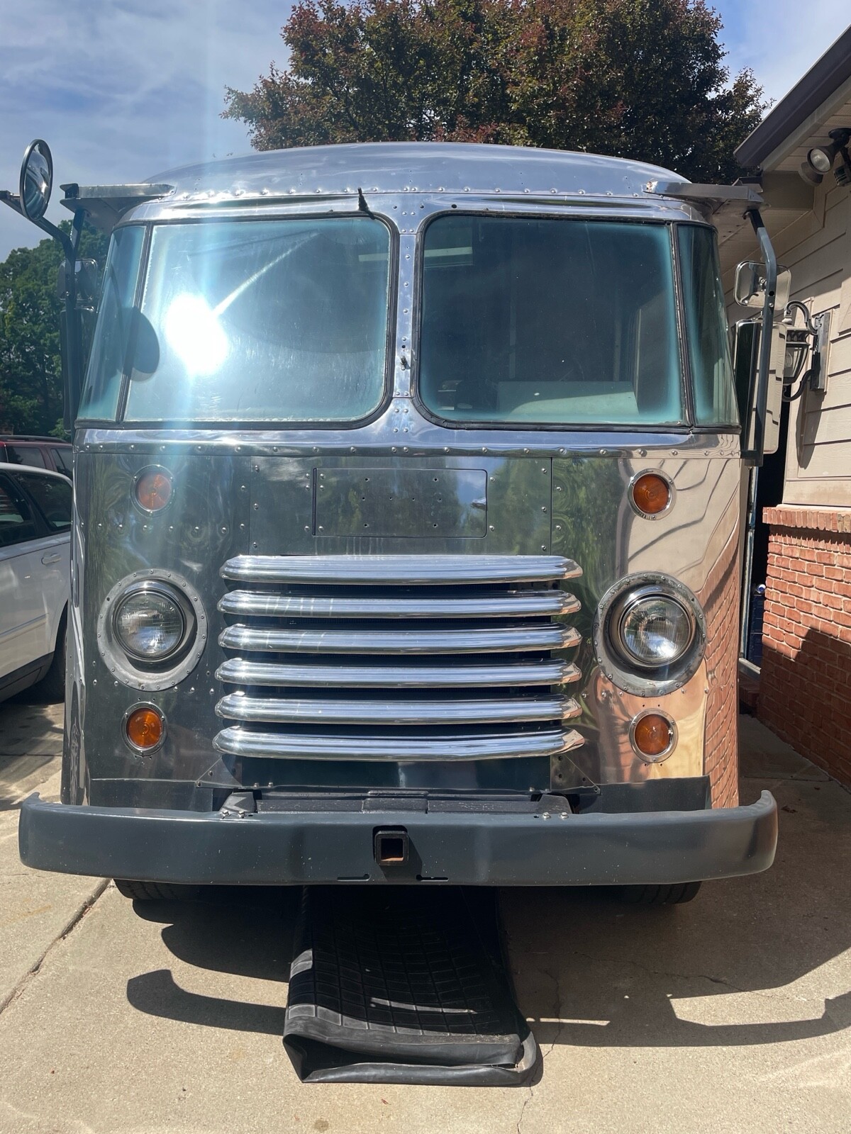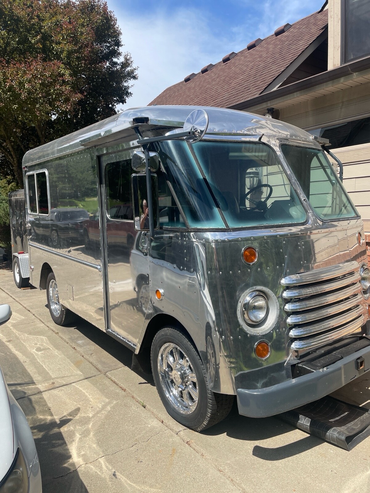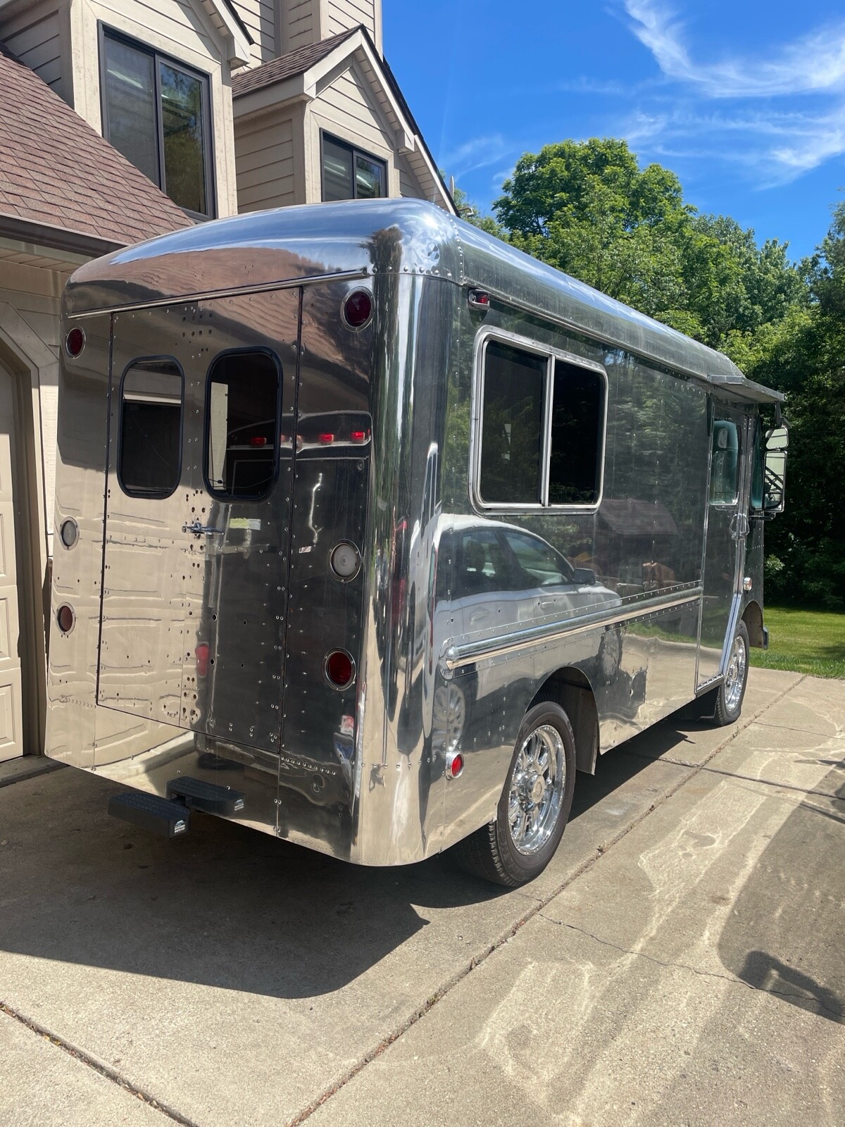 Grumman Olson built aluminum airplanes during the war. After the war, they got into building trucks. This truck looks like a delivery truck, but it’s titled as a motorhome. It’s an aluminum body and it’s been polished to look like chrome.