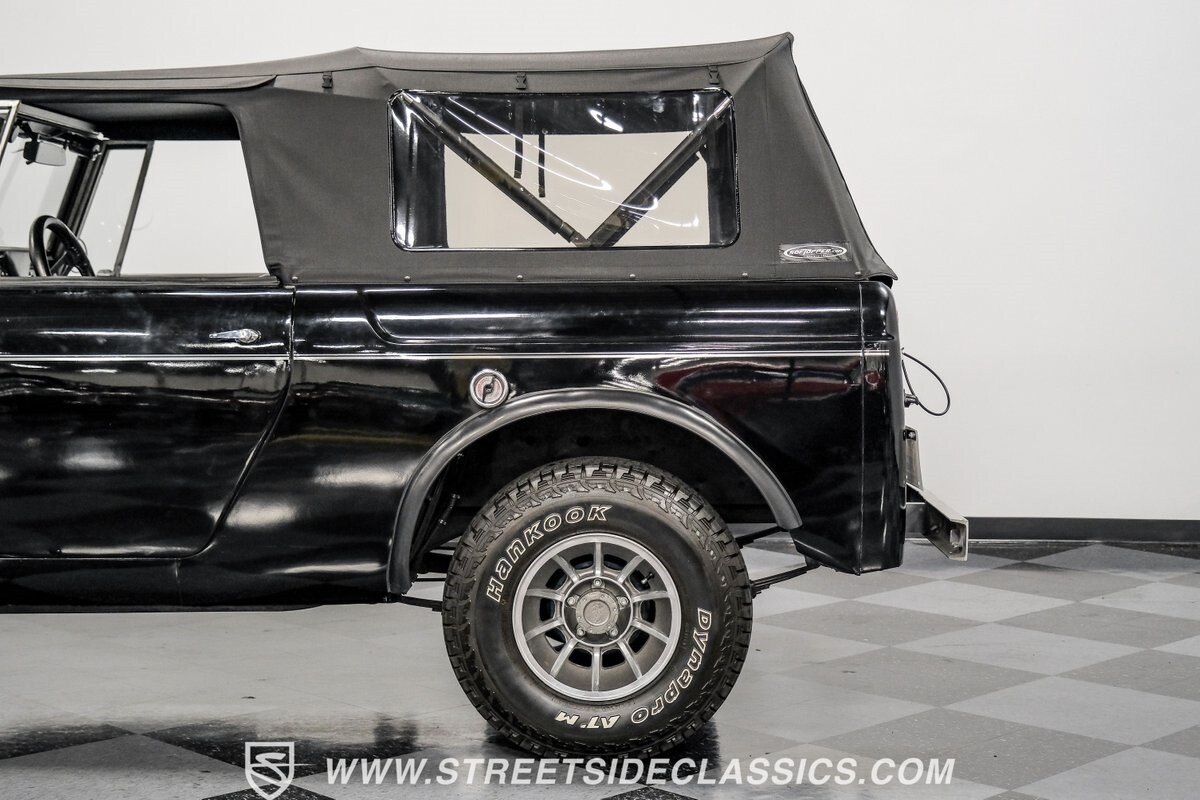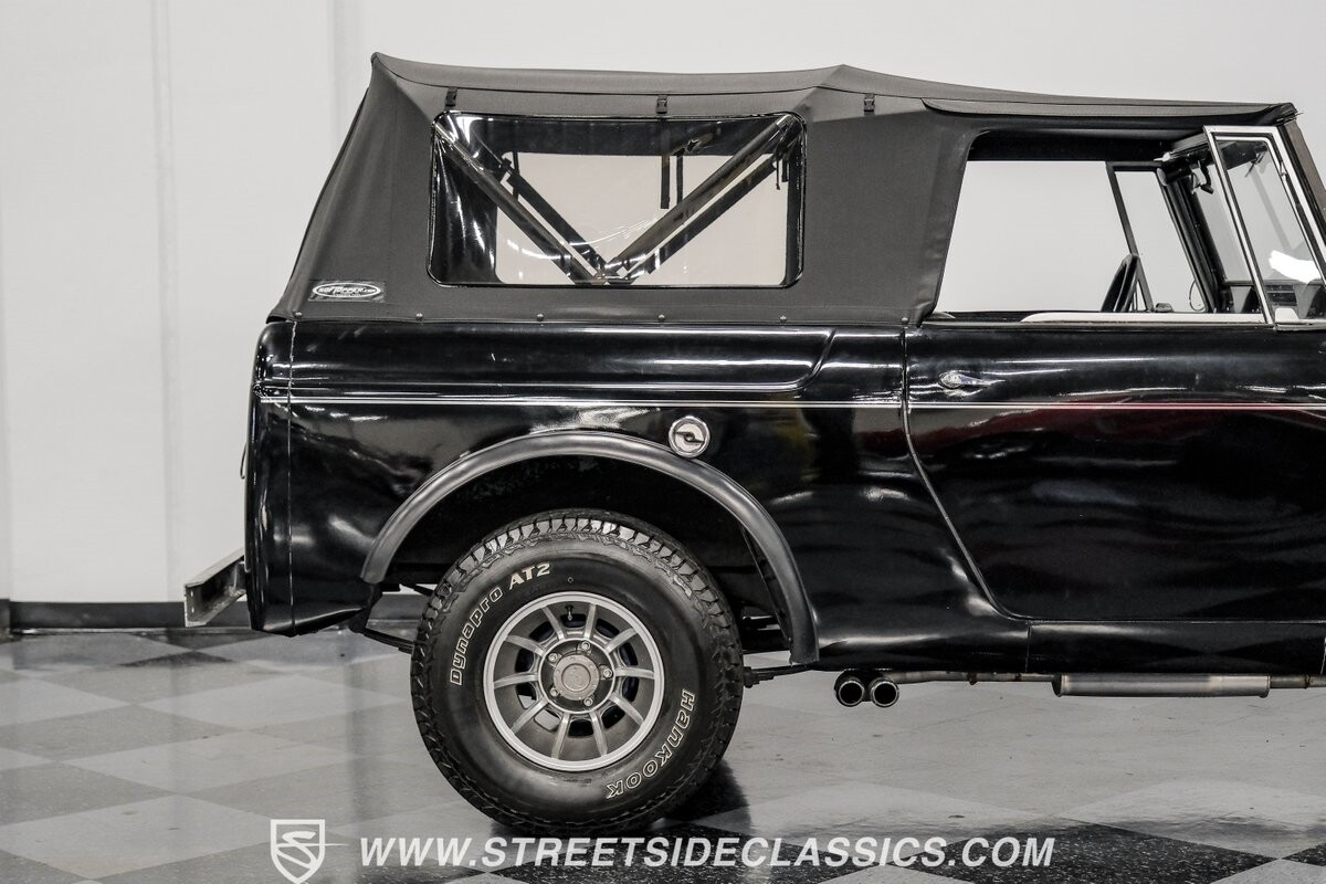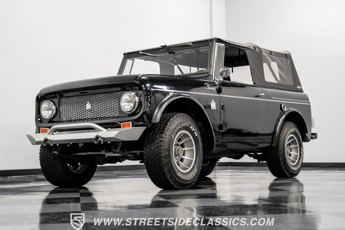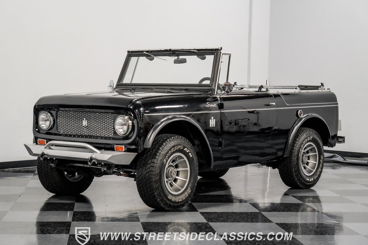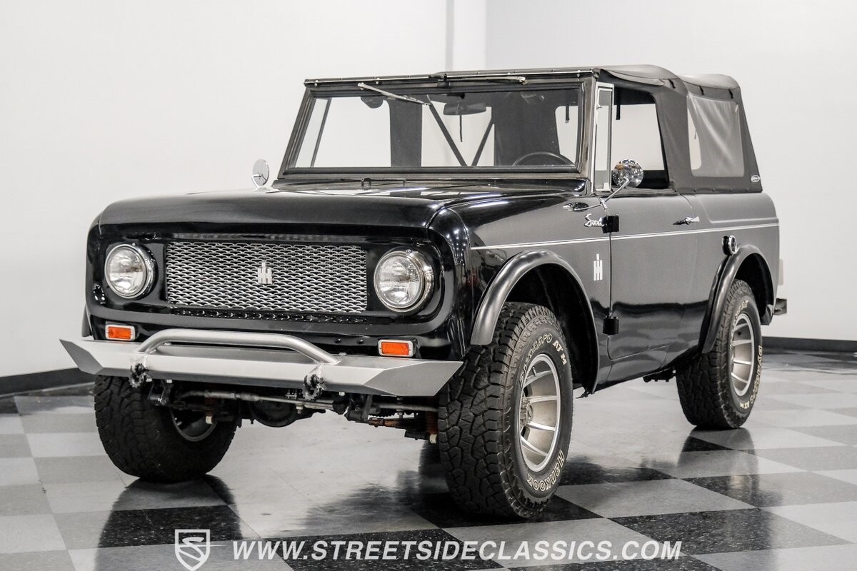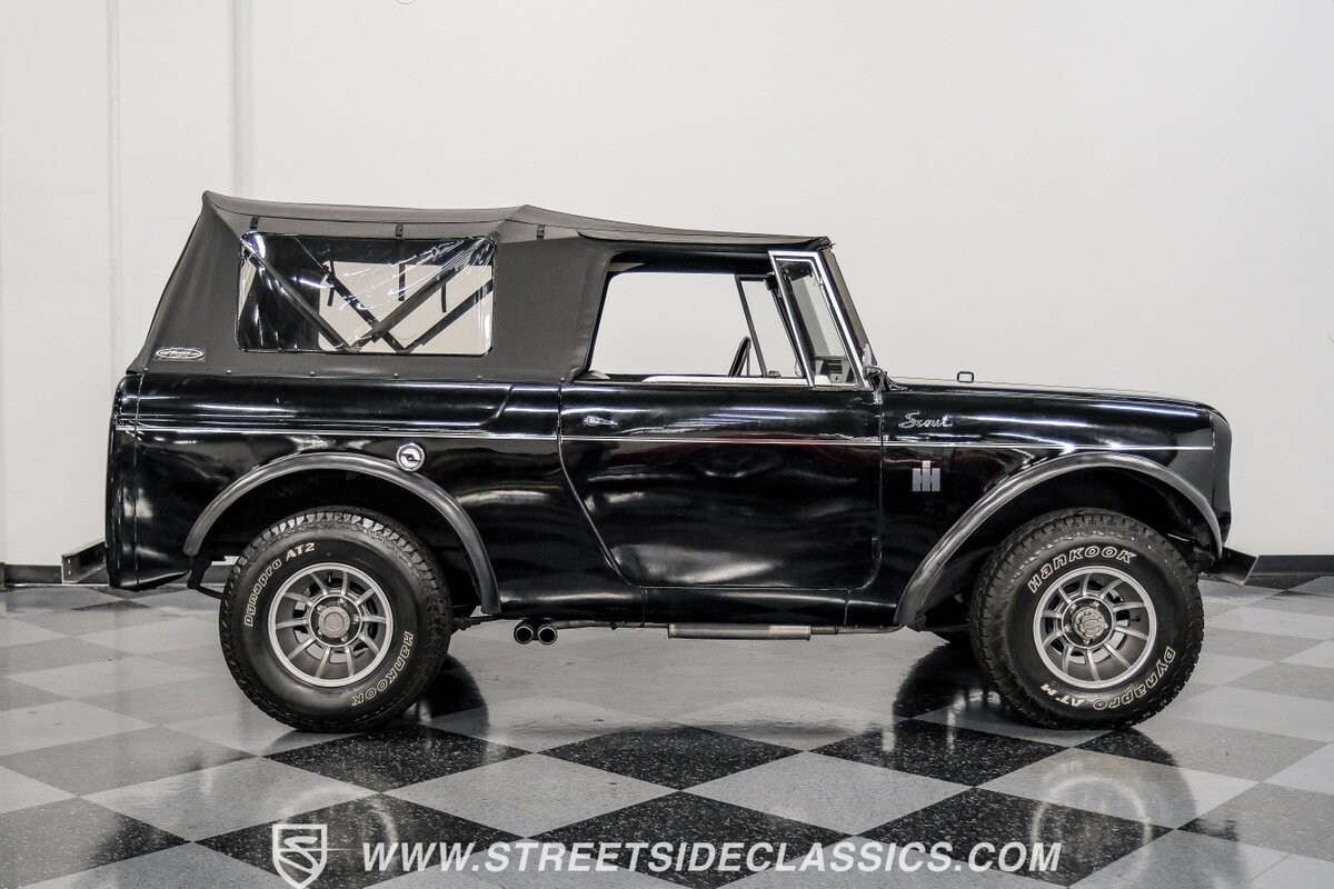Venturing into the wild, this 1963 International Scout 80 4X4 stands as a monument to American adventure and off-road exploration. Cloaked in imposing black paint, its body is a testament to rugged beauty and functional design. The Hankook Dynapro AT2 tires, sized at 31X10.50R15, are ready to tackle any terrain, mounted on Billet Specialties rims that blend durability with a touch of elegance. In a very desirable level of style choices that we don't usually see, you have a few options... The newer soft top can cover you and your cargo or friends on the rear bench seats while the hardtop gives you a cool short bed pickup profile. But probably the way most people will love this truck is as a full convertible with no roof at all. Your choice!