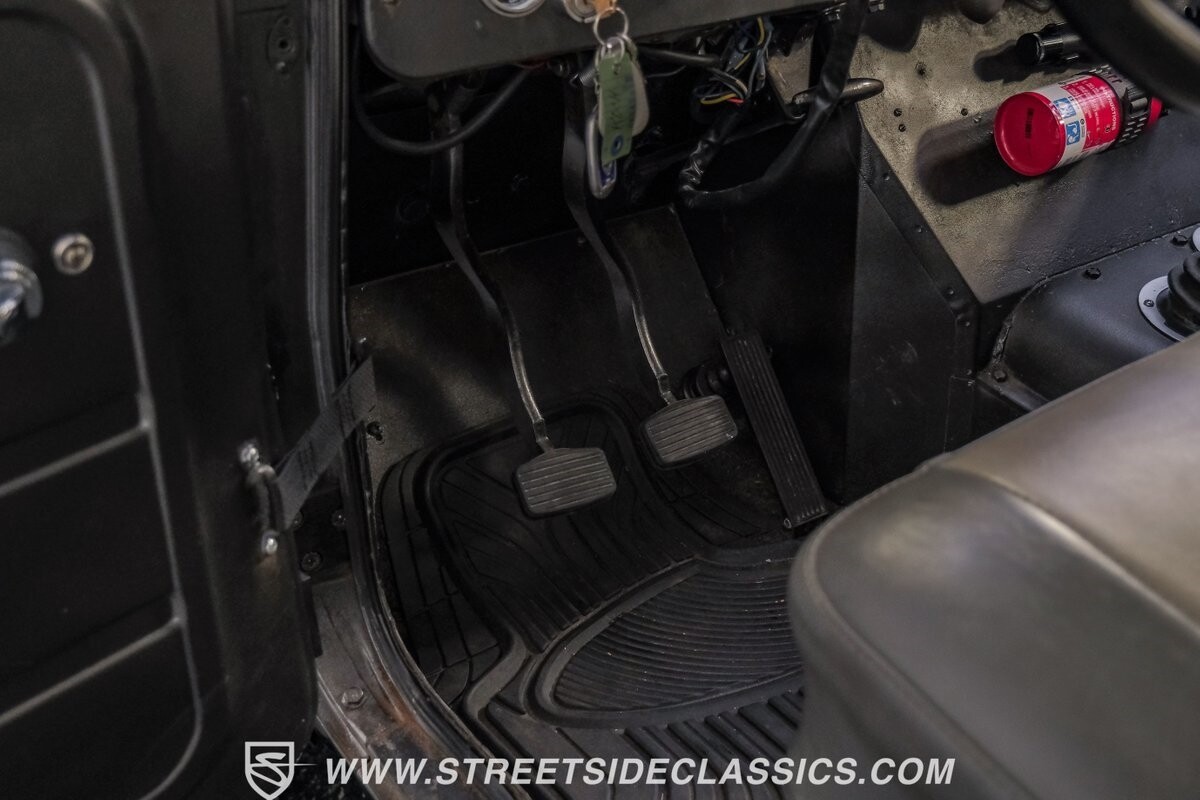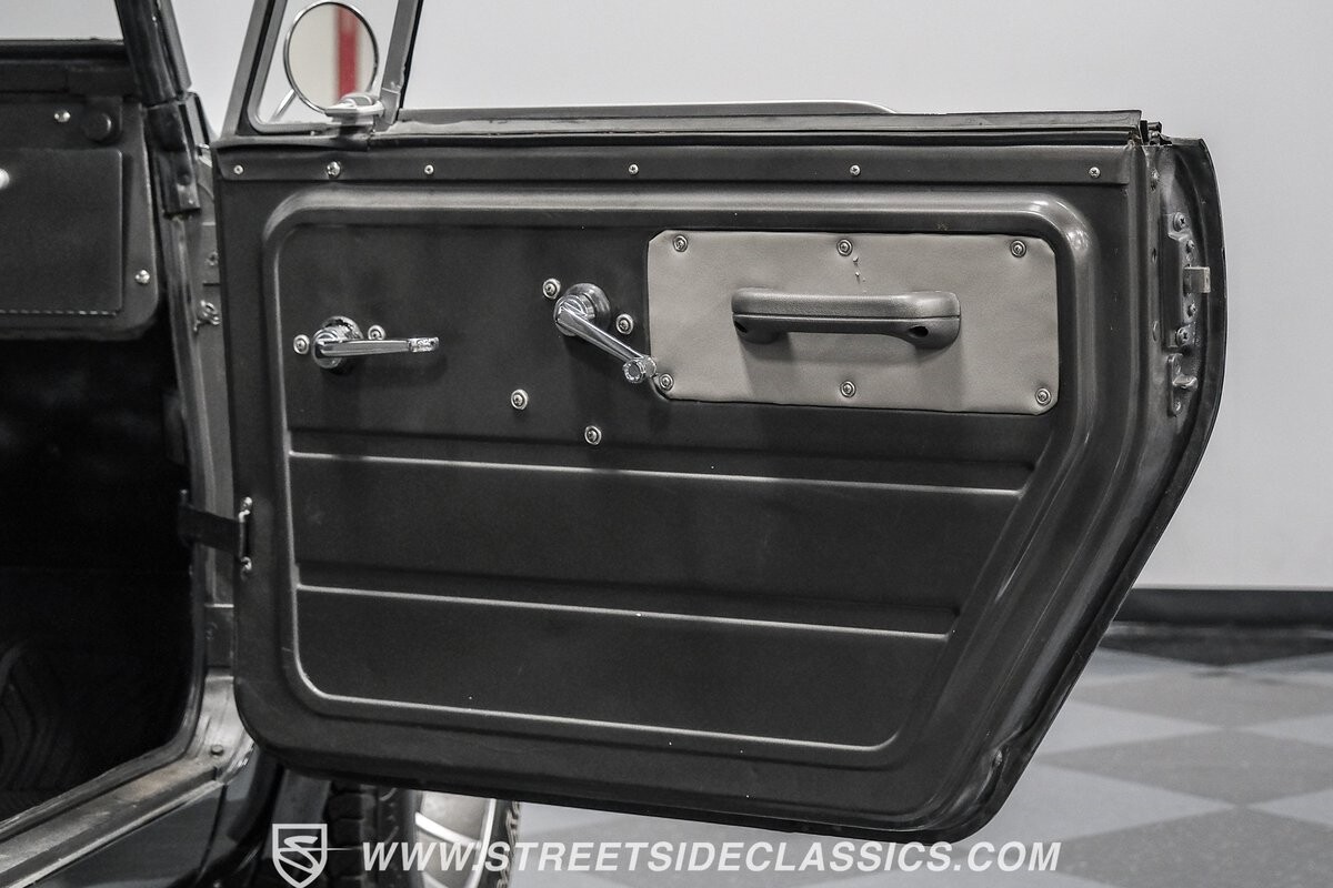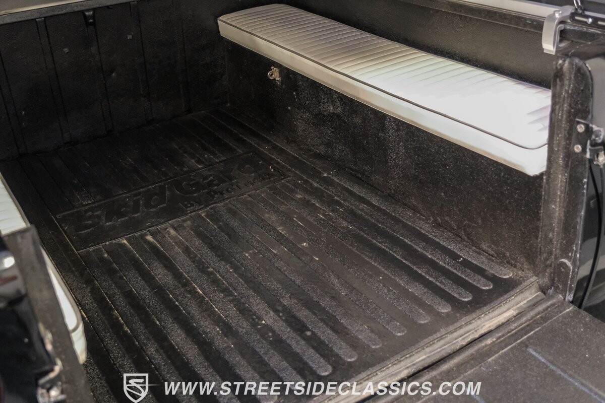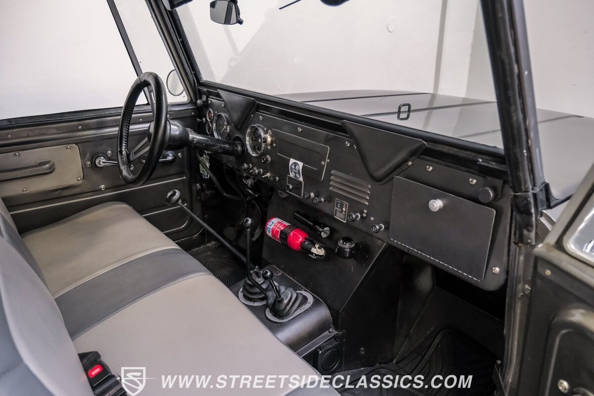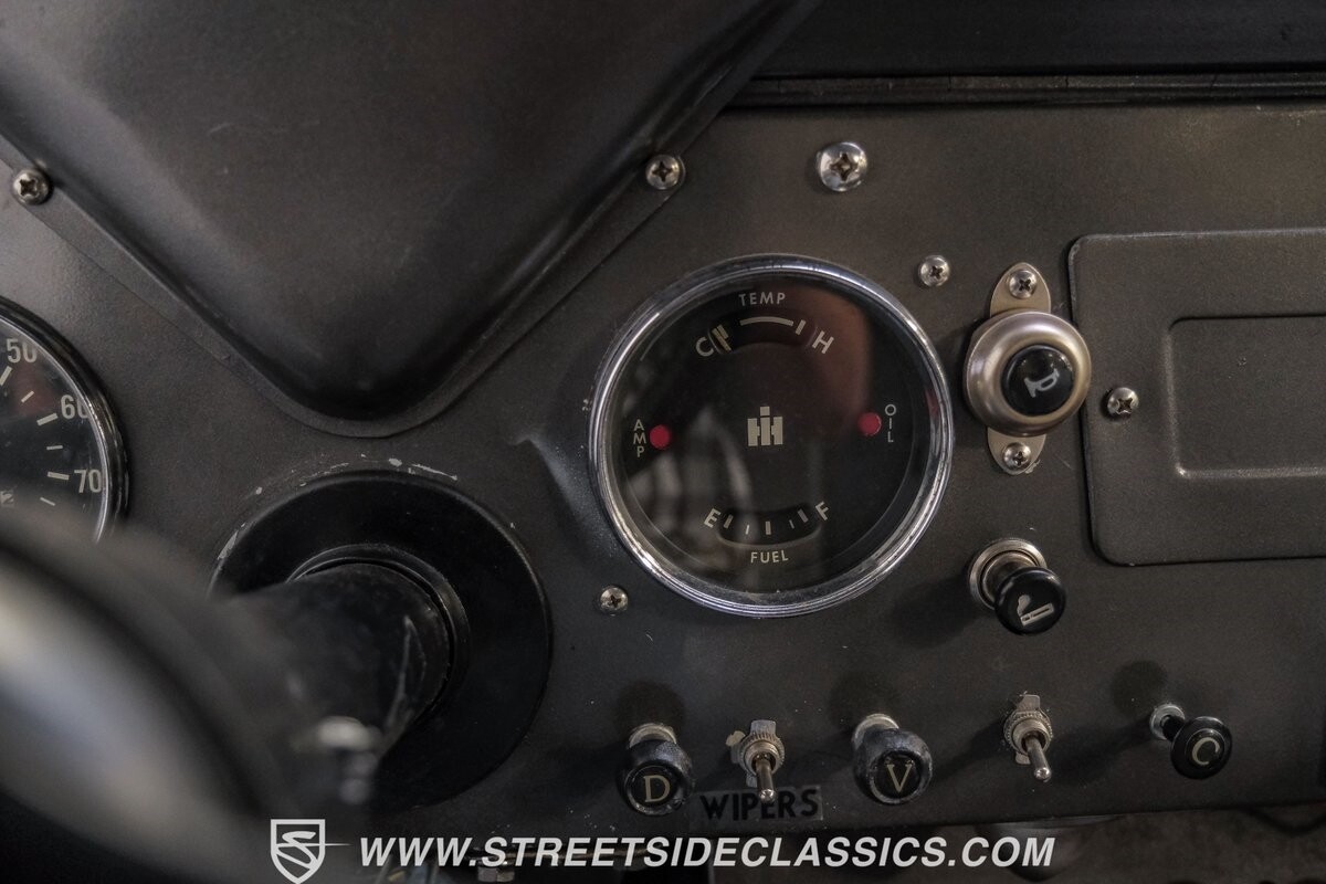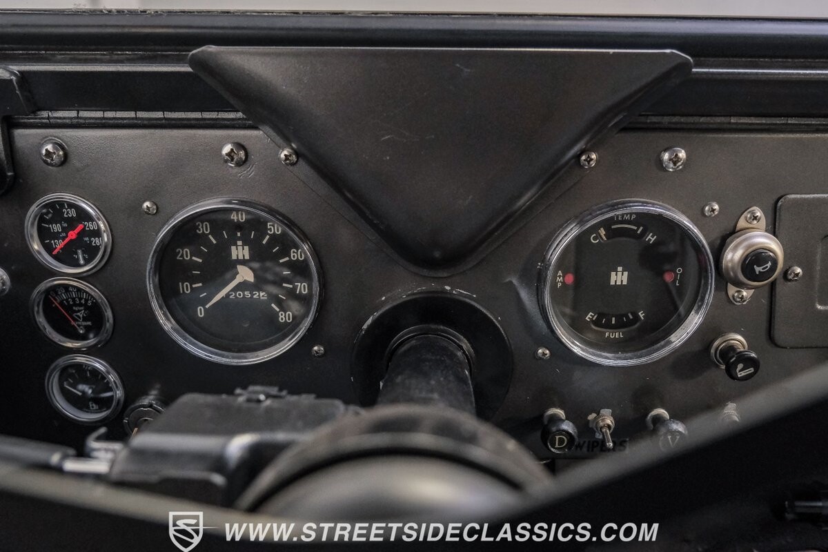 Inside, the spirit of adventure continues with a straightforward black vinyl interior. A front bench seat at the helm and custom cushioned rear side benches invite passengers to embrace the raw, tactile experience of off-roading. The metal door panels and spray-on bed liner underscore the Scout's utilitarian ethos, while aftermarket gauges keep the driver informed, a necessary nod to practicality amidst the untamed.