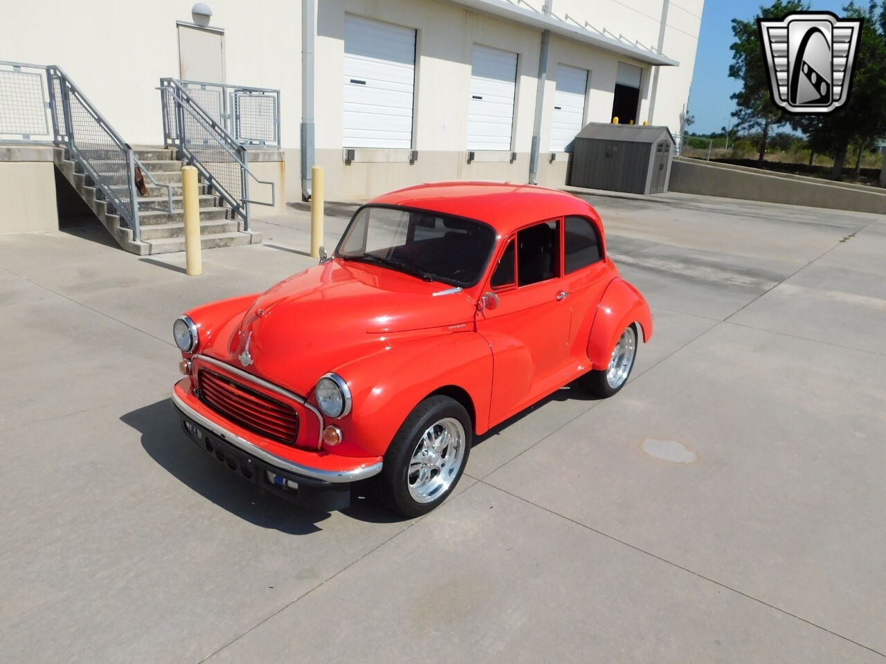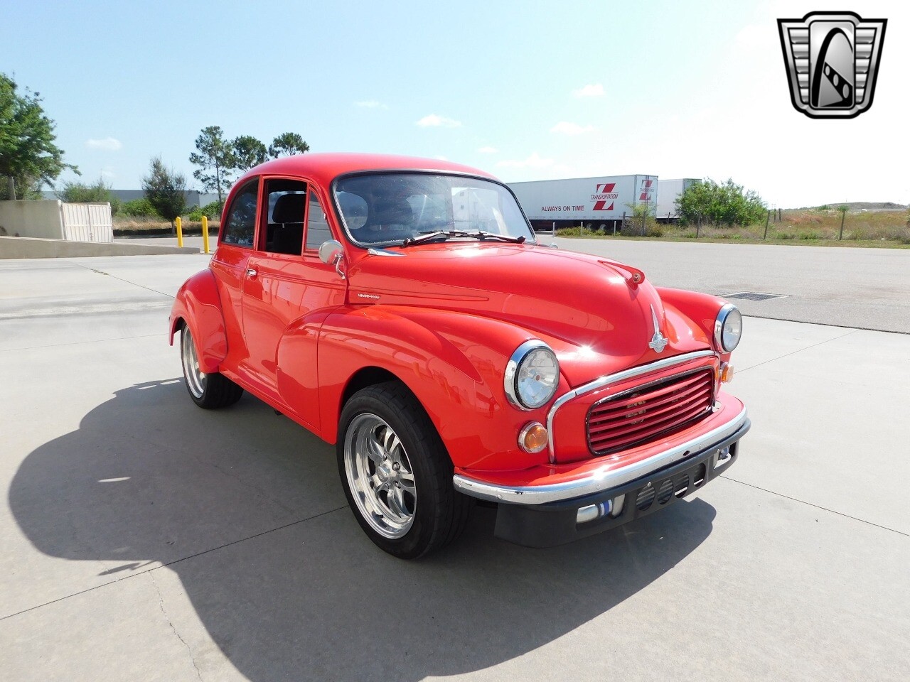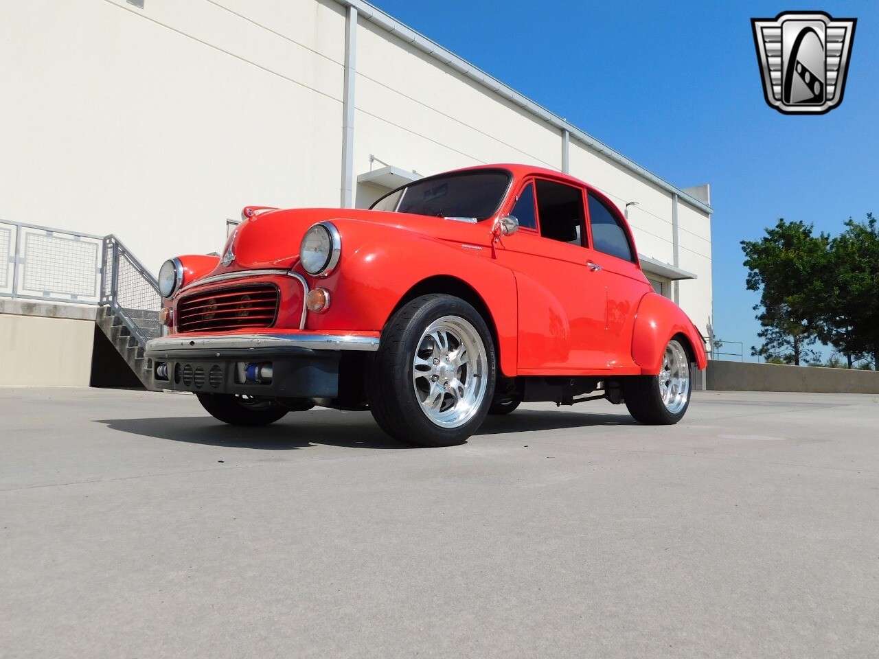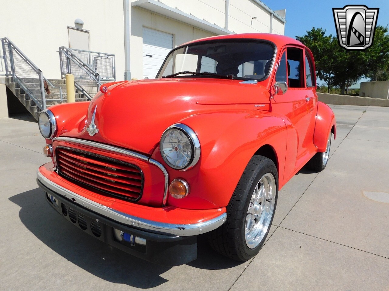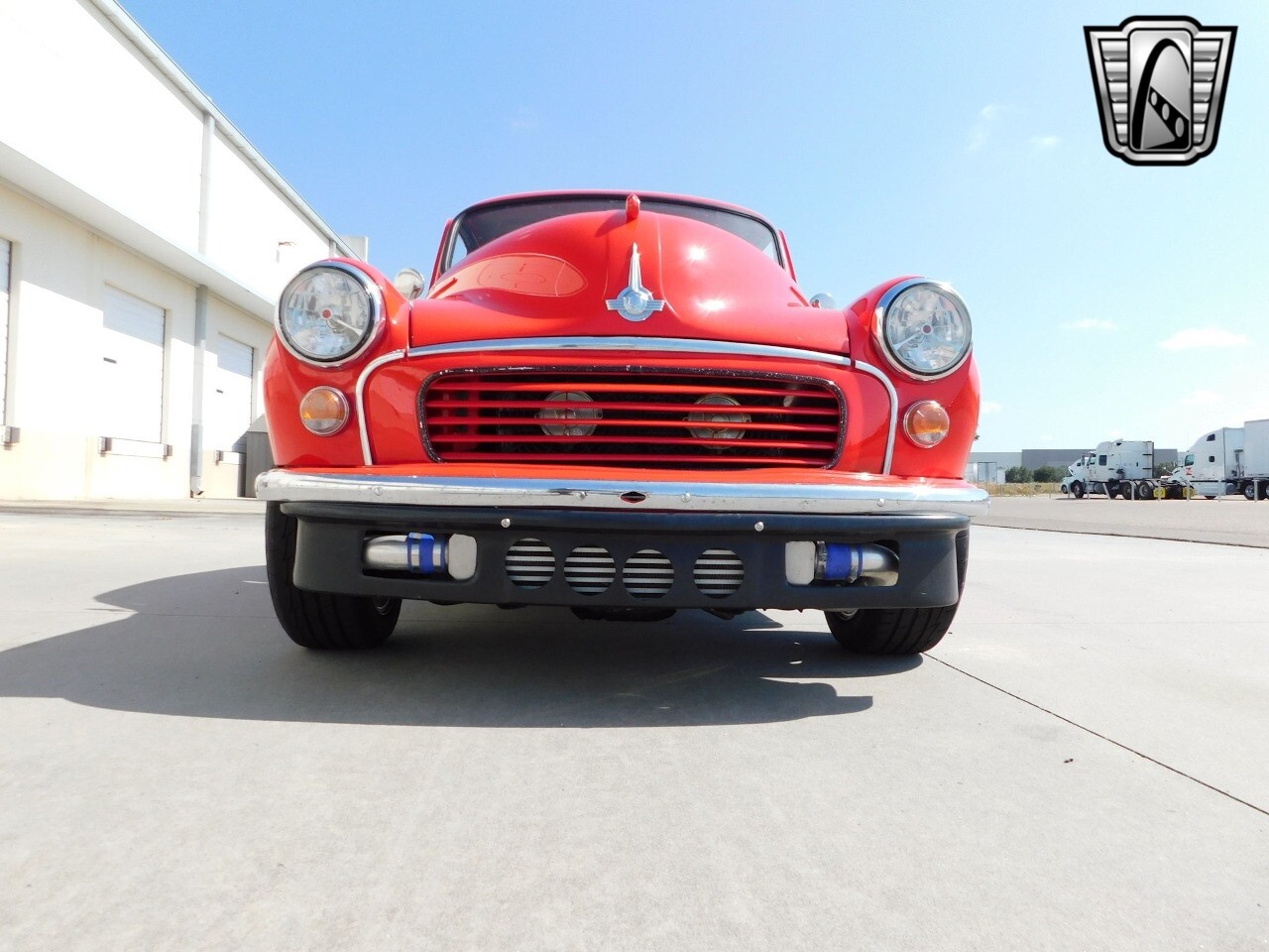 Gateway Classic Cars of Tampa is proud to present this Fast and Furious 1959 Morris Minor 1000! Anyone familiar with British automotive history knows the Morris was a staple of affordable motoring in the UK and it's former colonies. With over 1.5 million sold, the Minor was a sales success thanks to being compact practical and offering good value. No one would imagine a spend thrift's car as a hot rod, but that's what this Morris Minors' owner did. He saw the light compact body and rwd chassis and thought "I bet that'll make a for a fast ride". So he set off to make the Frankenstein monster of Frankenstein monsters! first the itty bitty 948cc 4 banger was tossed in the trash and a tuned, modern Mitsubishi 4G63, turbo engine from a 2008 EVO 8 was stuffed between the fenders. The 400hp hp is harnessed by 5 speed manual from a 3rd Gen RX7, that sends power to a 9" Ford axle with 3.73 gears! Under the body a 85 Datsun 750 mini-truck chassis serves provides the chassis while the suspension was fortified with a Mustang II front end and coil-overs shocks at all four corners. Disk brakes yank this thing to a stop front and rear. Staggered Chip Foose wheels wrapped in sticky rubber keep this Turbo powered go-kart sunny side up, and cold AC, racing seats, and power windows ensure you're safe and comfy during the ride. This 1959 Morris is a riot! You definitely won't see yourself coming or going with this ride. Make this red rocket yours today!.