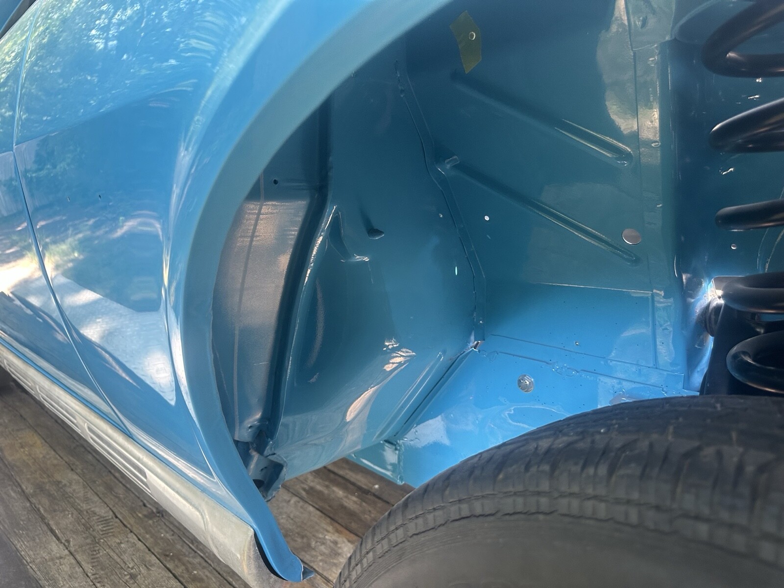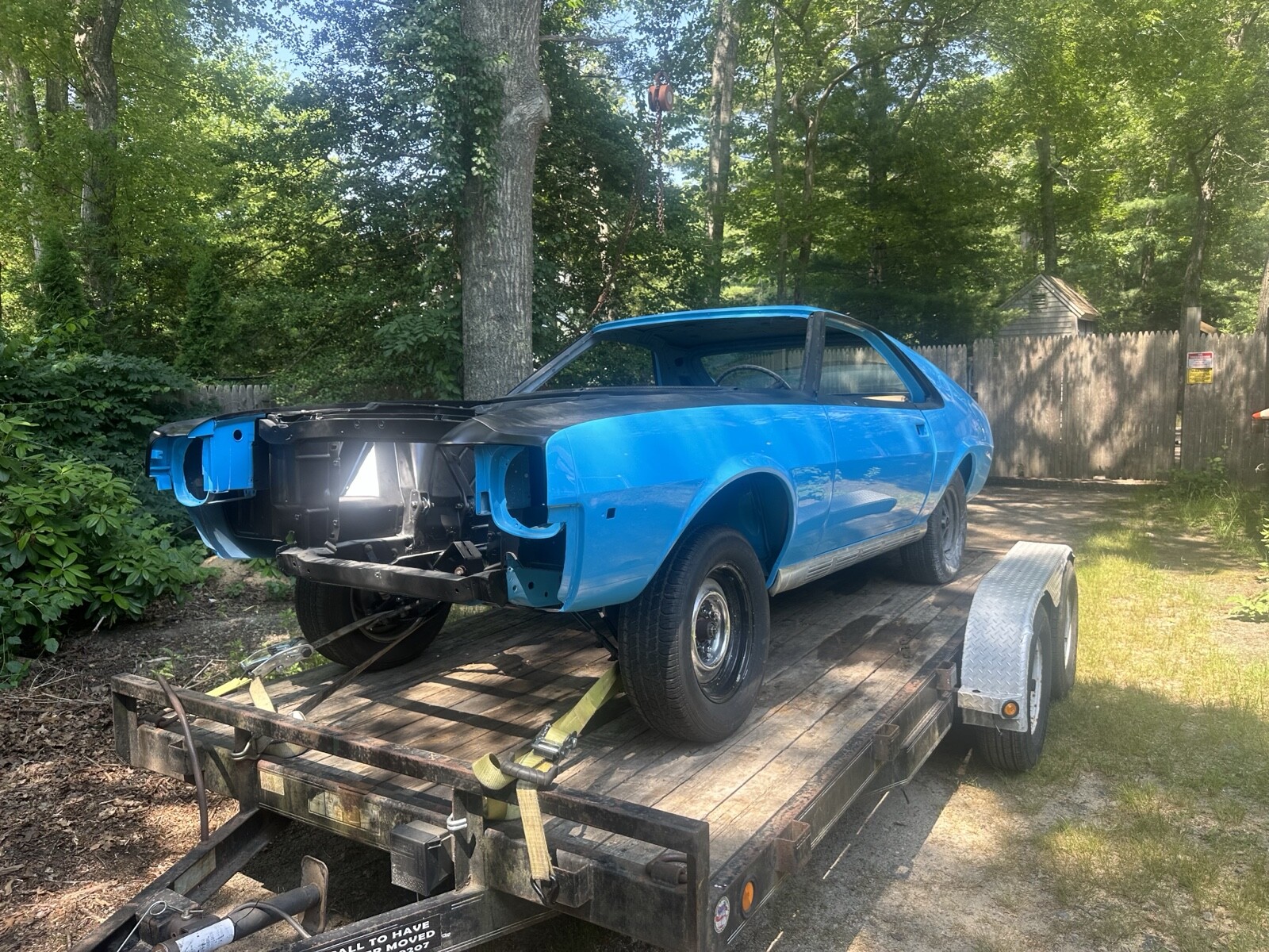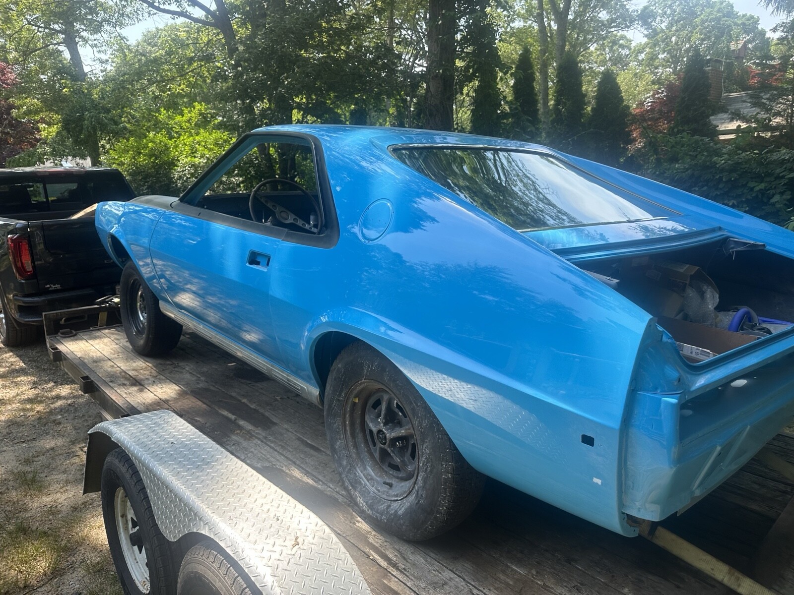 Complete blue AMC AMX body in solid condition with minimal rust.