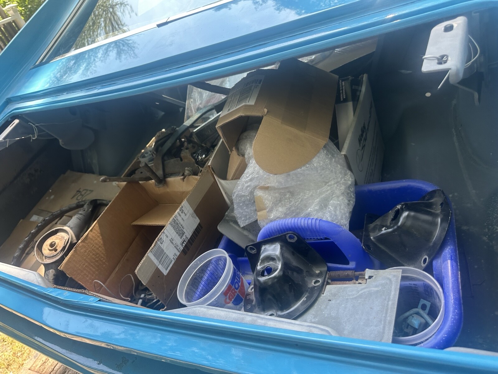 Large collection of parts including trim pieces, engine components, and miscellaneous restoration parts (see photo).