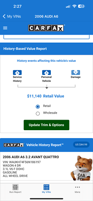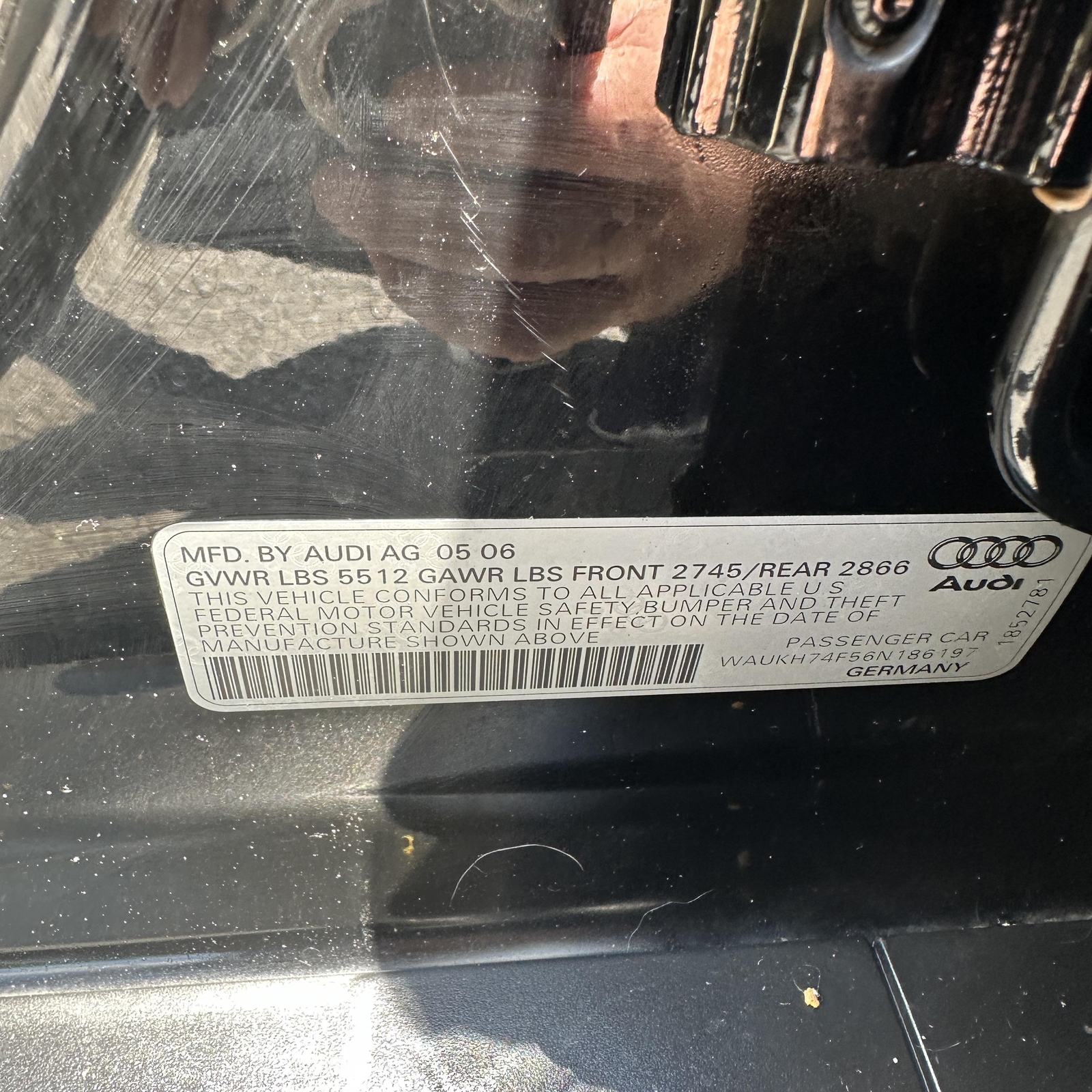 "PLEASE SCROLL TO BOTTOM OF LISTING AND CLICK "SEE FULL ITEM DESCRIPTION" TO VIEW ALL 50+ PHOTOS!!!" "I WILL HELP YOU ARRANGE SHIPPING AND WILL MATCH OR BEAT YOUR QUOTE" UP FOR OUR NEXT SALE IS THIS VERY NICE 2006 AUDI A6 QUATTRO 3.2L AWD STATION WAGON WITH VERY LOW 68K MILES, ACCIDENT FREE, FULLY SERVICED PER CLEAN CARFAX, EXTRA CLEAN, NON SMOKER, POWER LEATHER SEATS, SUNROFF AND PRICED TO SELL!!! THIS CAR IS OVERALL IN GOOD CONDITION INSIDE AND OUT. THE EXTERIOR SHOWS NO MAJOR DENTS, DINGS OR SCRATCHES. THE INTERIOR ALSO SHOWS NO SIGNS OF ABUSE, (SEE ALL PICTURES FOR MORE DETAILS.) THE ENGINE RUNS STRONG AND THE TRANSMISSION IS SMOOTH. THE CAR WILL BE A STEAL, SO CALL ME TODAY IF YOU LIKE TO MAKE A DEAL267-828-0272 THANK YOU SERGE! Please keep in mind you are bidding on a pre-owned vehicle. Everyday driving can cause minor chips, dings or scratches on a vehicle. Unless otherwise noted in our photos or description these items are minimal, but may exist in some cases. Our photos are designed to be a visual description of this vehicle, please look at them carefully and use them to make a confident decision to bid on our vehicle. Get a great vehicle at a great price!!! Bid Now! If you have any questions about this or any of my other auctions please feel free to contact me via e-mail at or you can call me at 267-828-0272 ask for Serge. Thank you for your interests and we look forward to hearing from you...