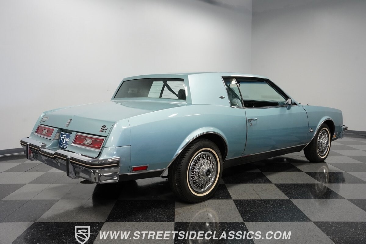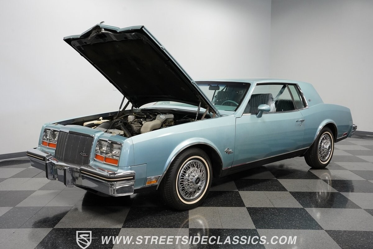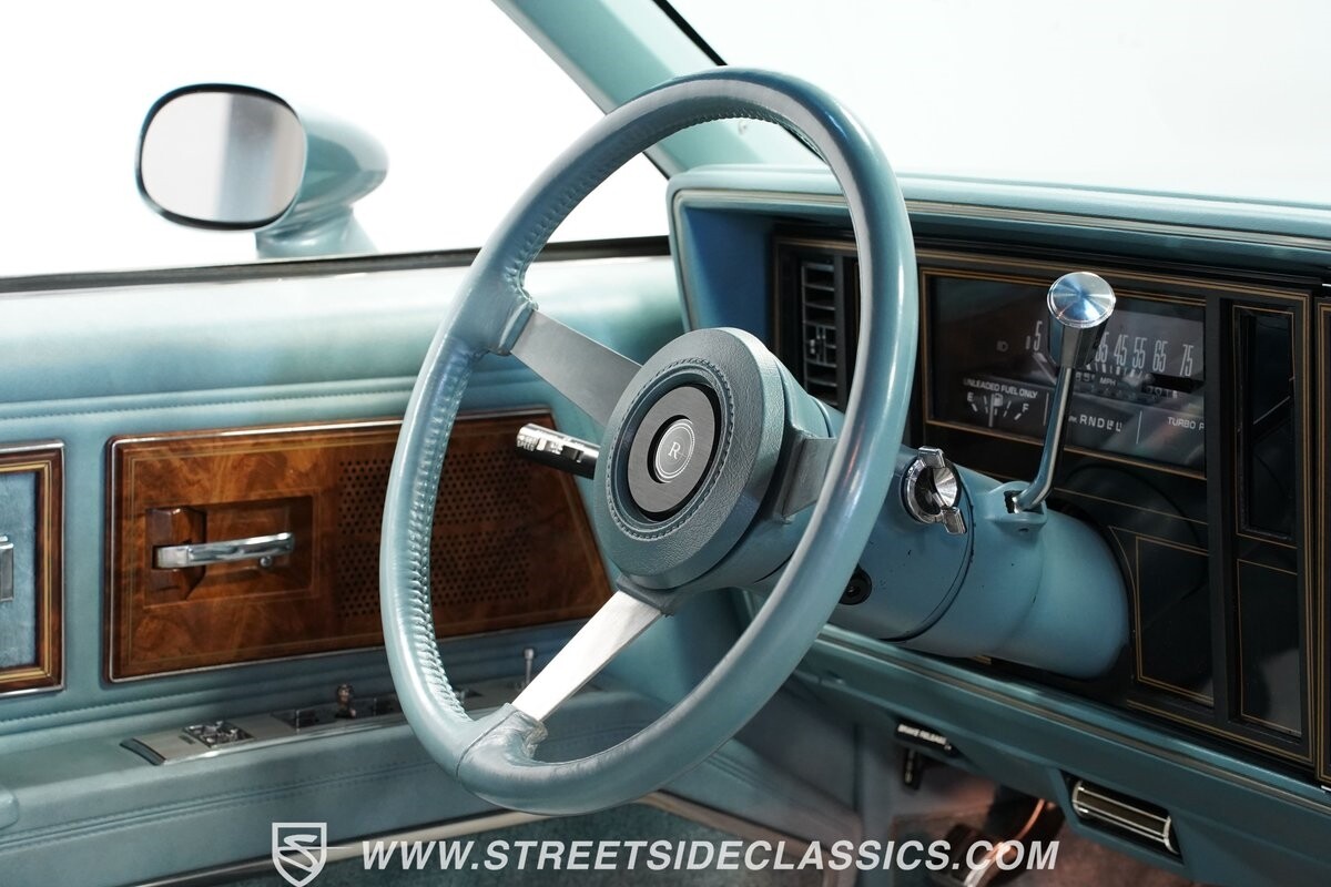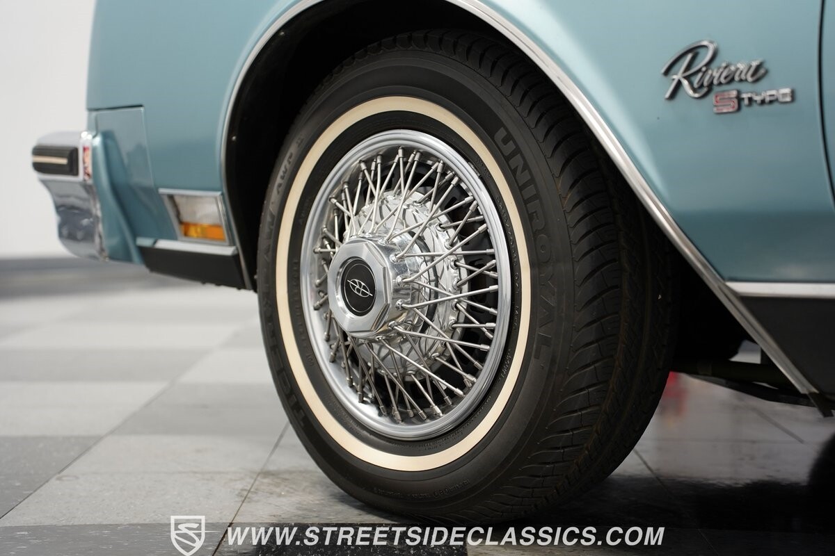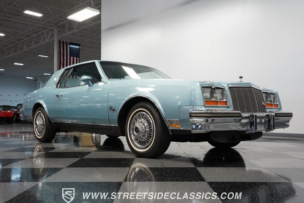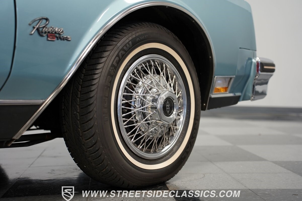 This 1979 Buick Riviera Turbo S Type, with a mere 8,858 believed-actual miles, exemplifies GM's luxury and performance engineering. The light blue metallic paint accentuates the coupe's sleek lines and distinctive Buick styling. The S Type package adds a performance edge with unique badging and spoked wheels fitted with 215/70R15 Tiger Paw tires featuring thin whitewalls, while the chrome trim shines with minimal flaws.