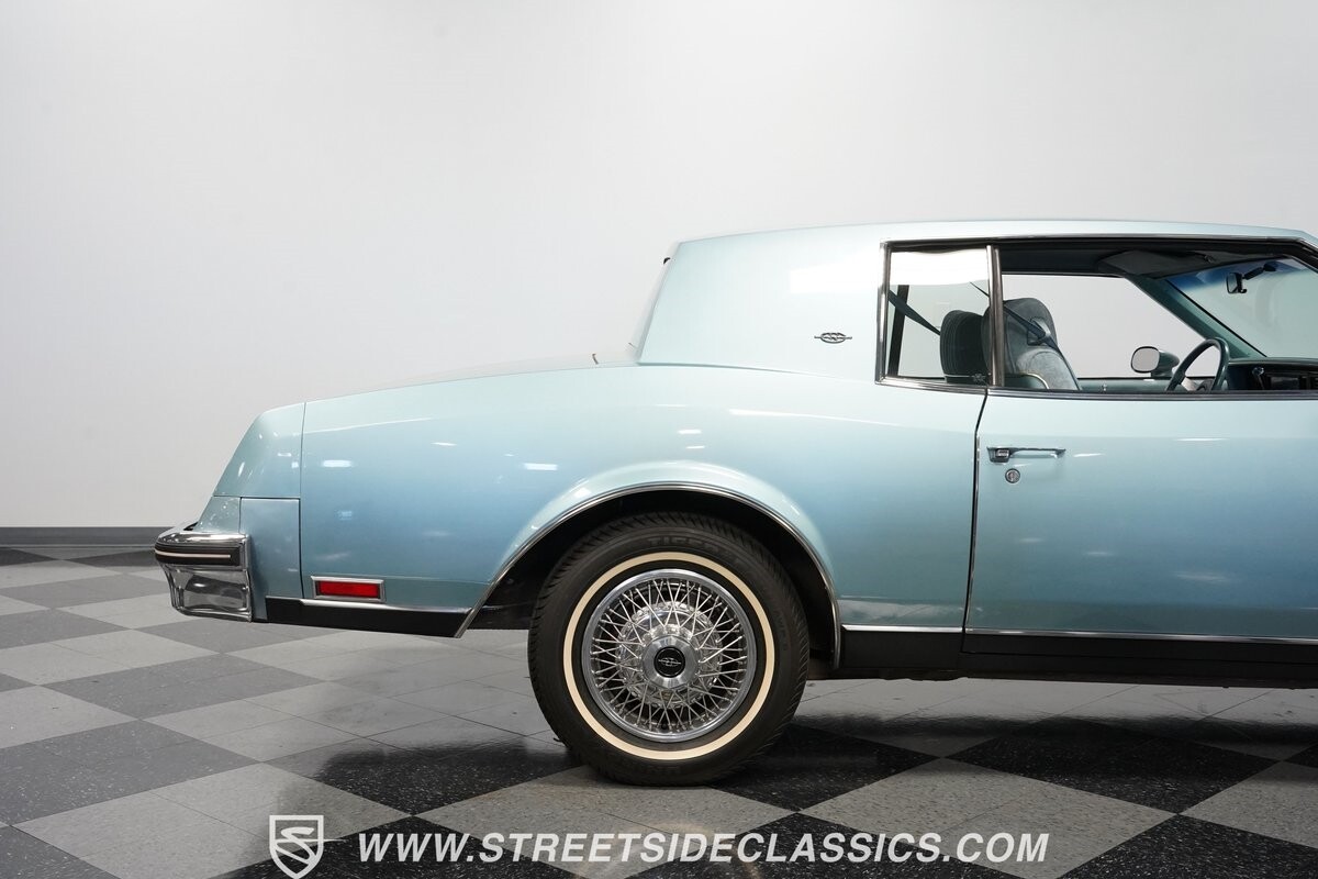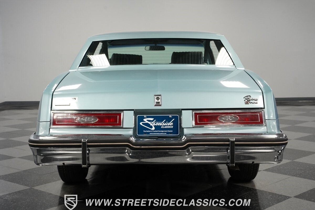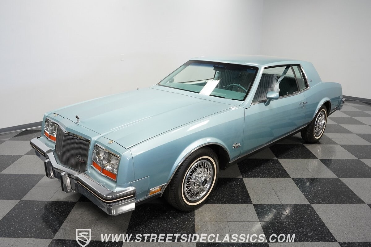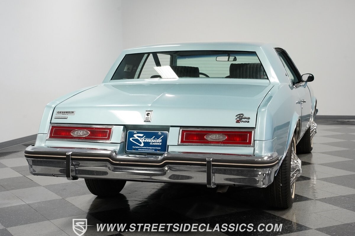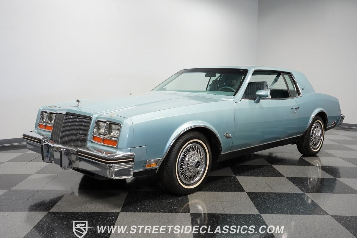 This 1979 Buick Riviera Turbo S Type, with a mere 8,858 believed-actual miles, exemplifies GM's luxury and performance engineering. The light blue metallic paint accentuates the coupe's sleek lines and distinctive Buick styling. The S Type package adds a performance edge with unique badging and spoked wheels fitted with 215/70R15 Tiger Paw tires featuring thin whitewalls, while the chrome trim shines with minimal flaws.