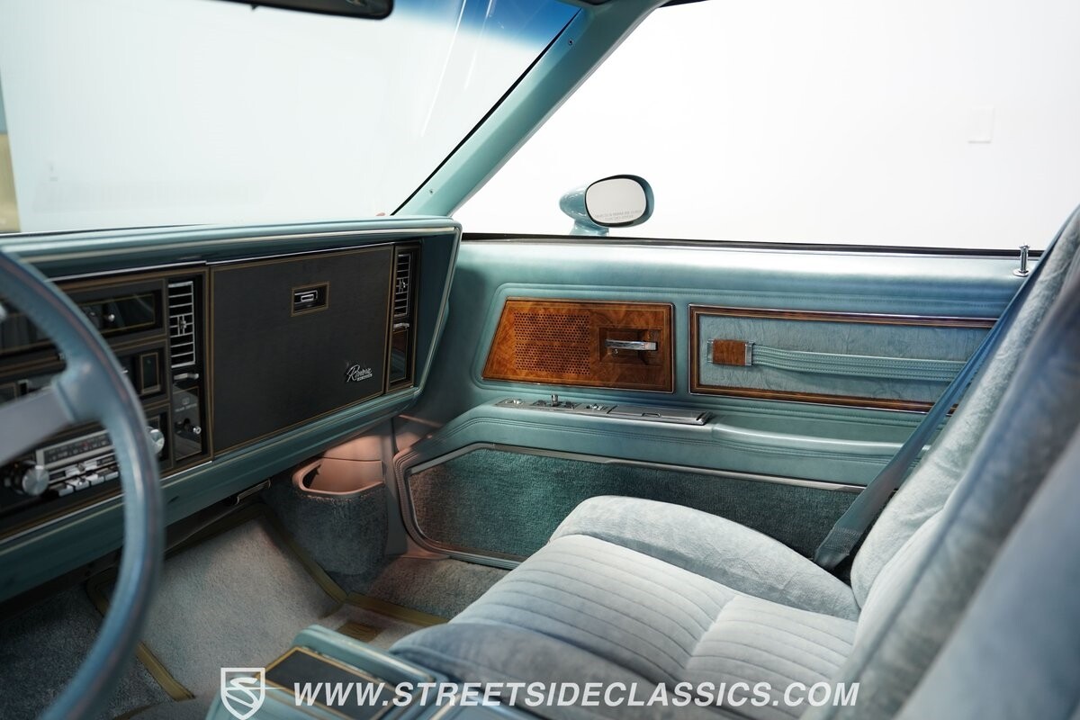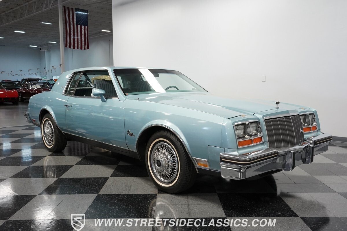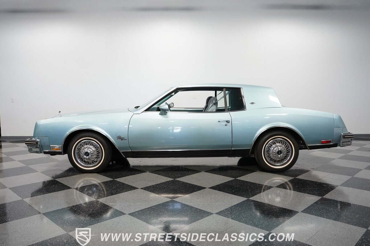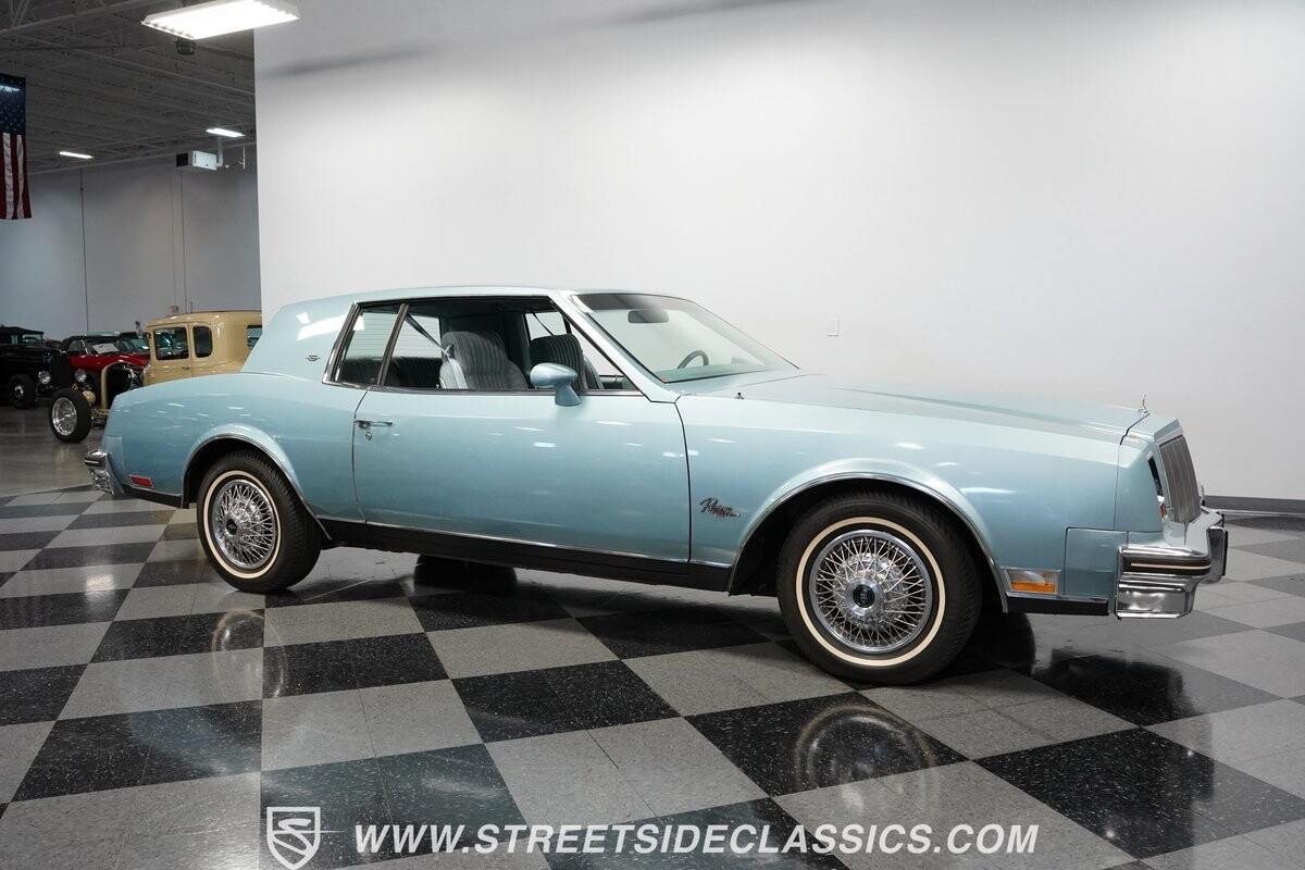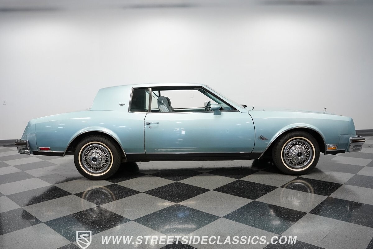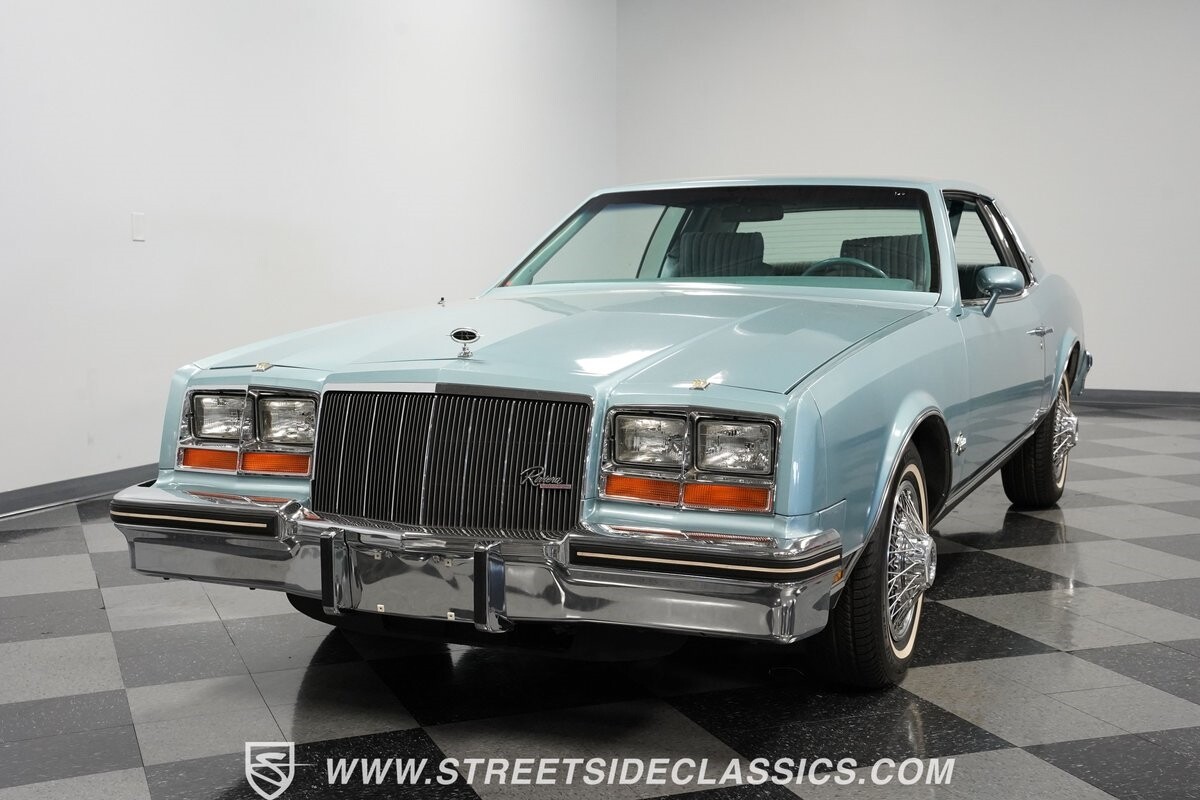 This 1979 Buick Riviera Turbo S Type, with a mere 8,858 believed-actual miles, exemplifies GM's luxury and performance engineering. The light blue metallic paint accentuates the coupe's sleek lines and distinctive Buick styling. The S Type package adds a performance edge with unique badging and spoked wheels fitted with 215/70R15 Tiger Paw tires featuring thin whitewalls, while the chrome trim shines with minimal flaws.