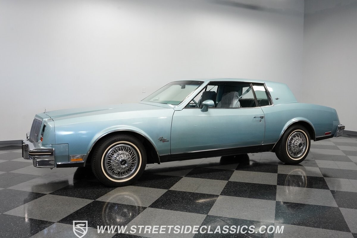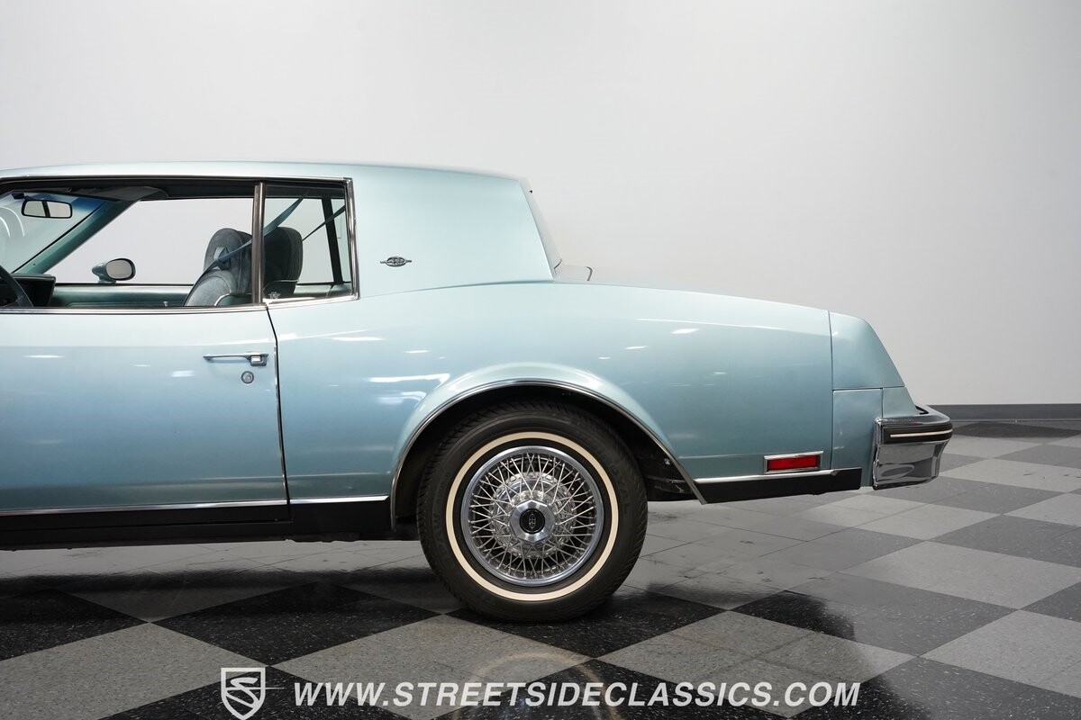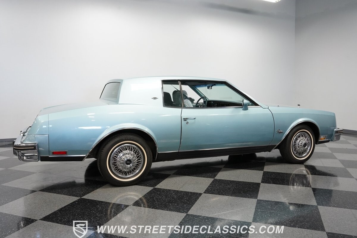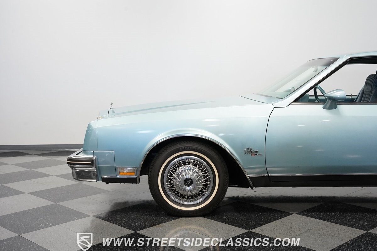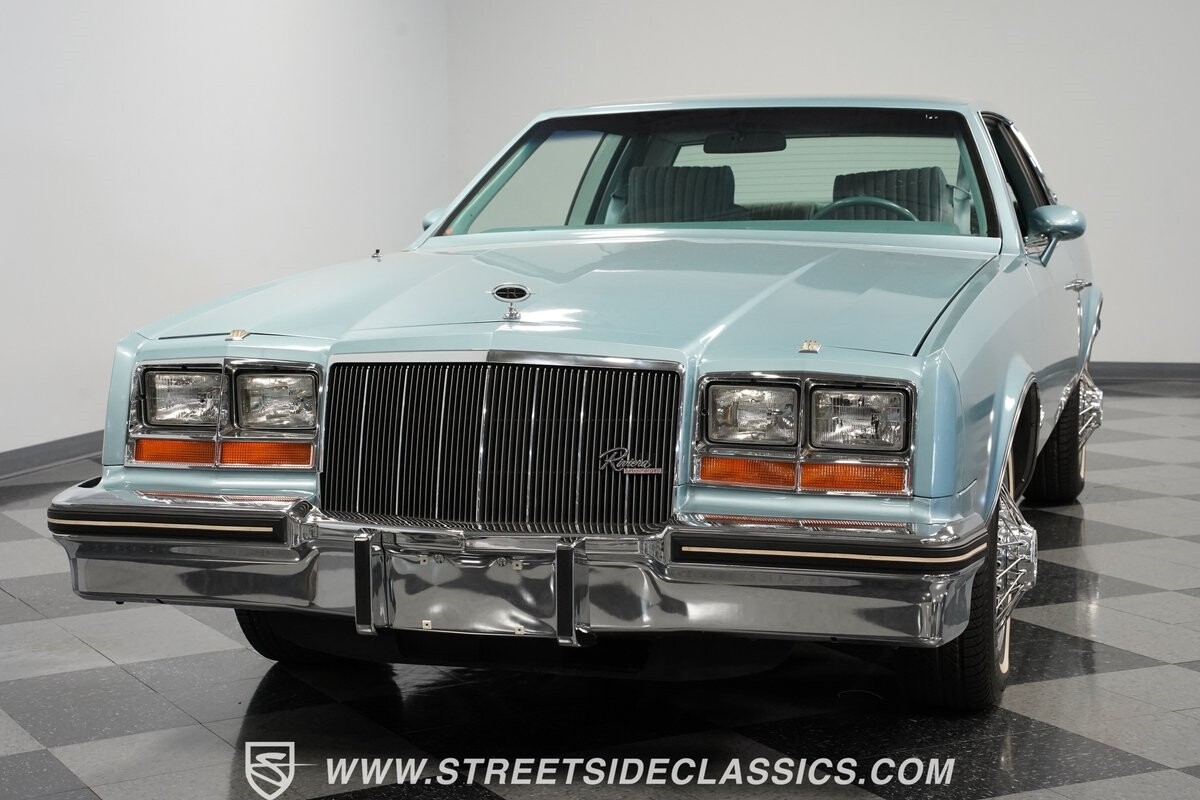 This 1979 Buick Riviera Turbo S Type, with a mere 8,858 believed-actual miles, exemplifies GM's luxury and performance engineering. The light blue metallic paint accentuates the coupe's sleek lines and distinctive Buick styling. The S Type package adds a performance edge with unique badging and spoked wheels fitted with 215/70R15 Tiger Paw tires featuring thin whitewalls, while the chrome trim shines with minimal flaws.