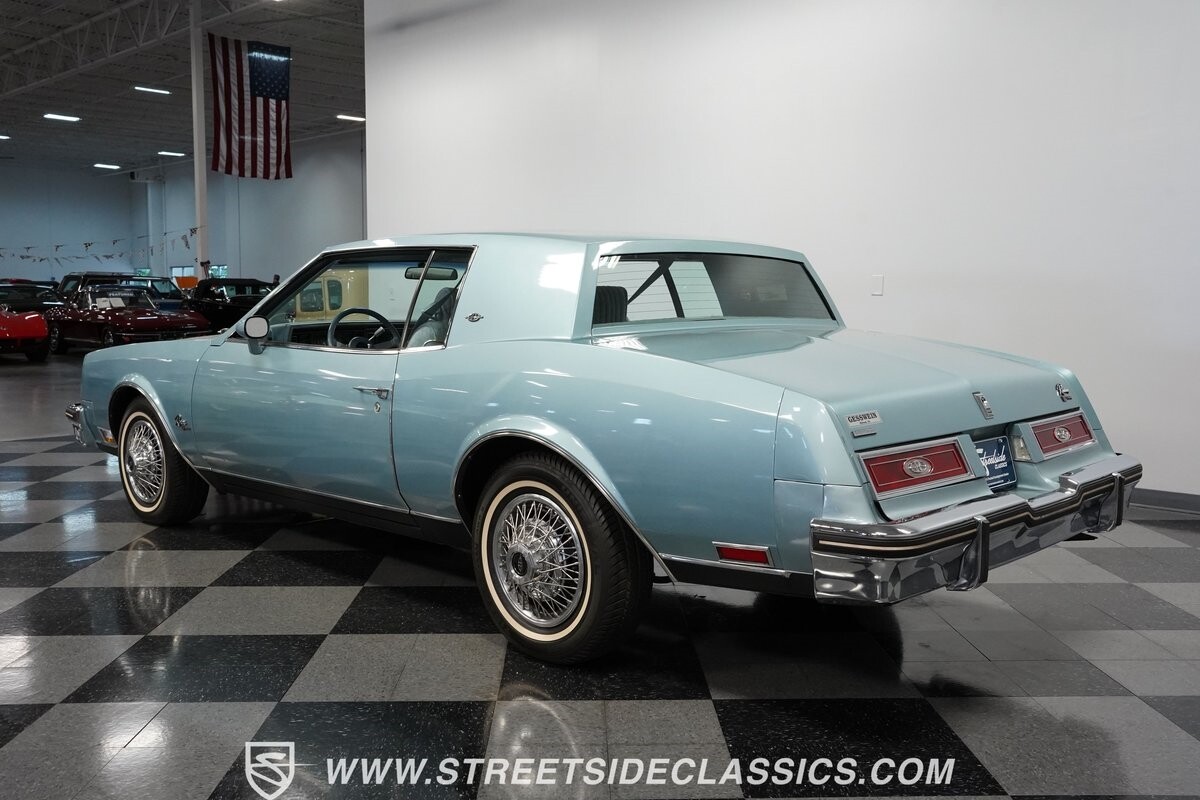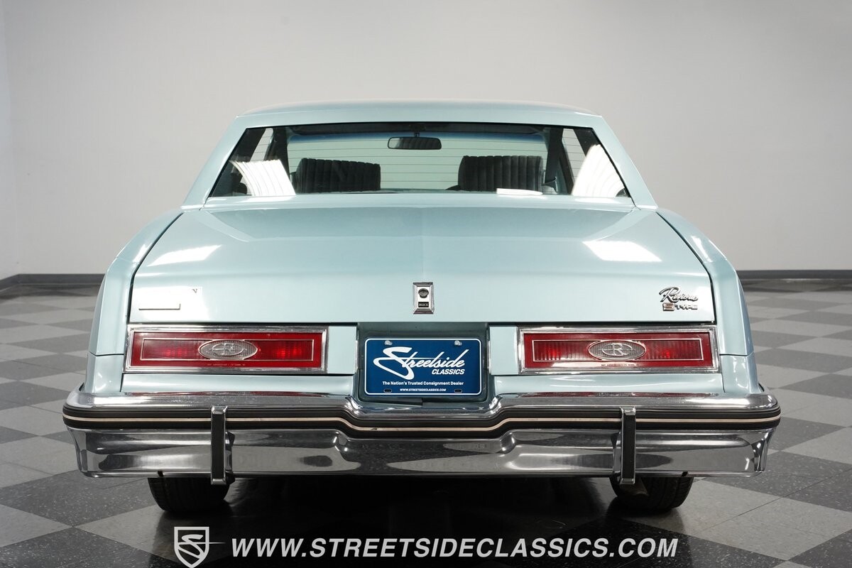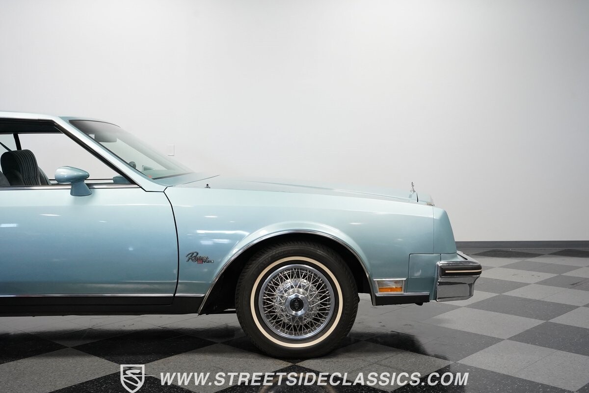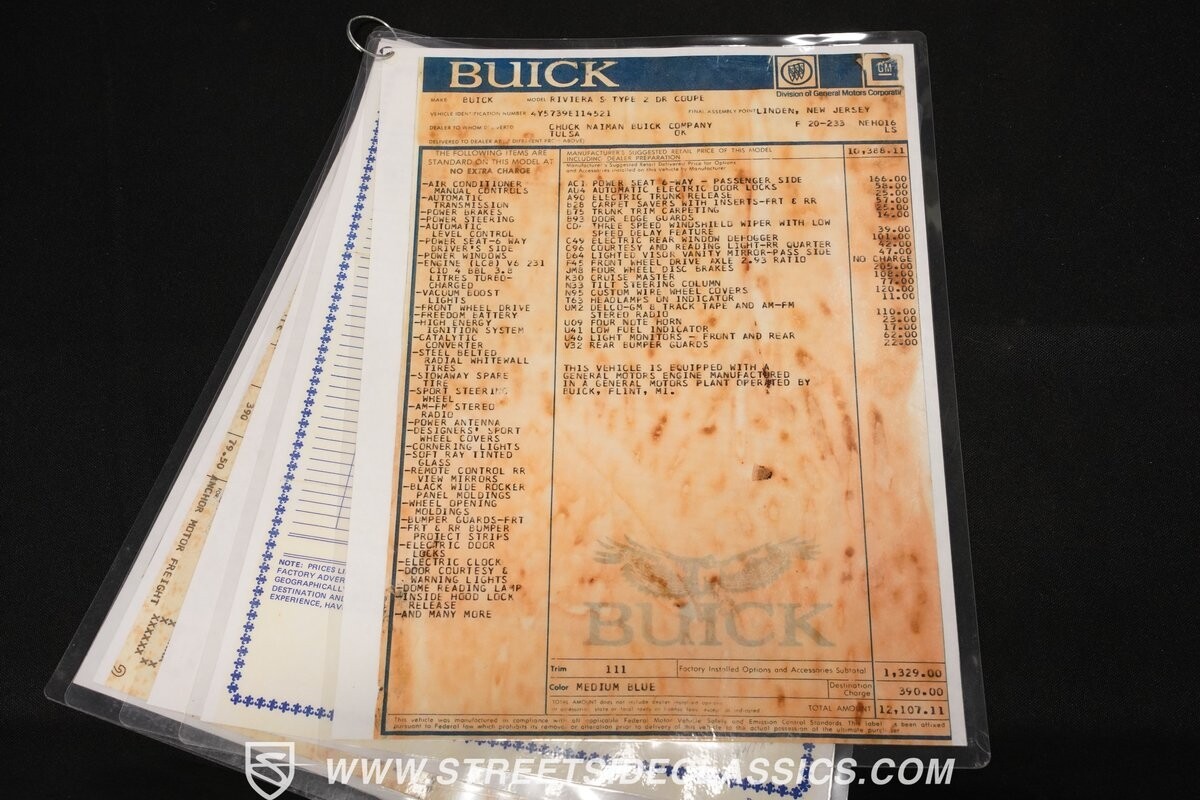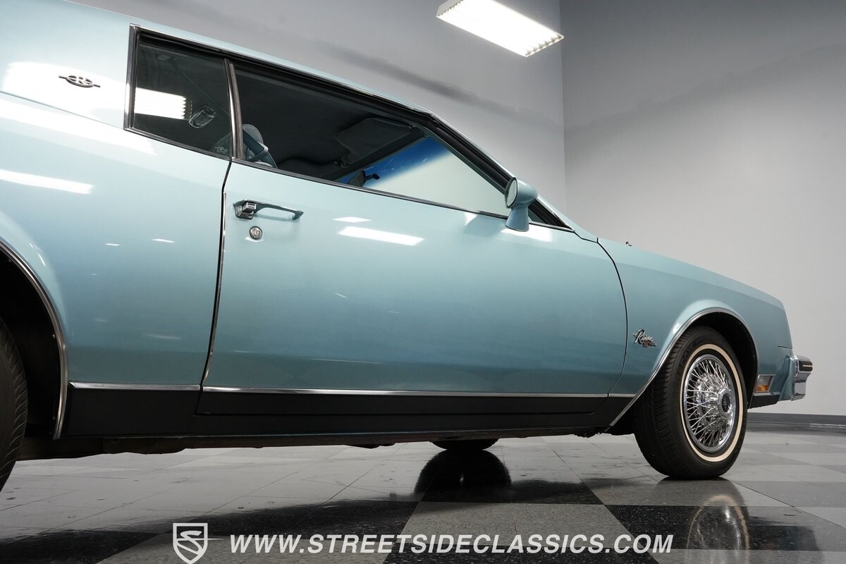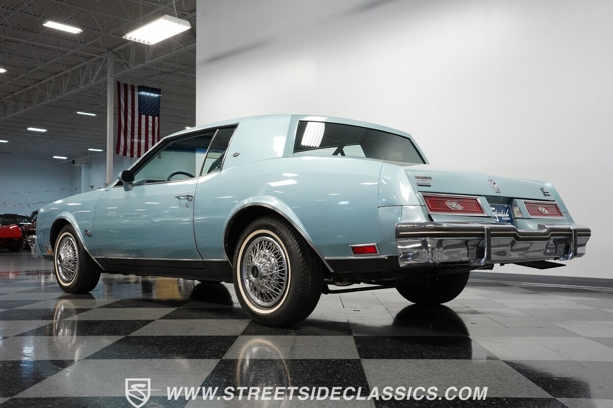 This 1979 Buick Riviera Turbo S Type, with a mere 8,858 believed-actual miles, exemplifies GM's luxury and performance engineering. The light blue metallic paint accentuates the coupe's sleek lines and distinctive Buick styling. The S Type package adds a performance edge with unique badging and spoked wheels fitted with 215/70R15 Tiger Paw tires featuring thin whitewalls, while the chrome trim shines with minimal flaws.