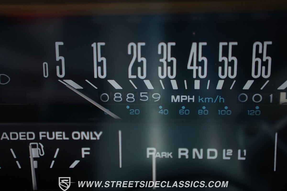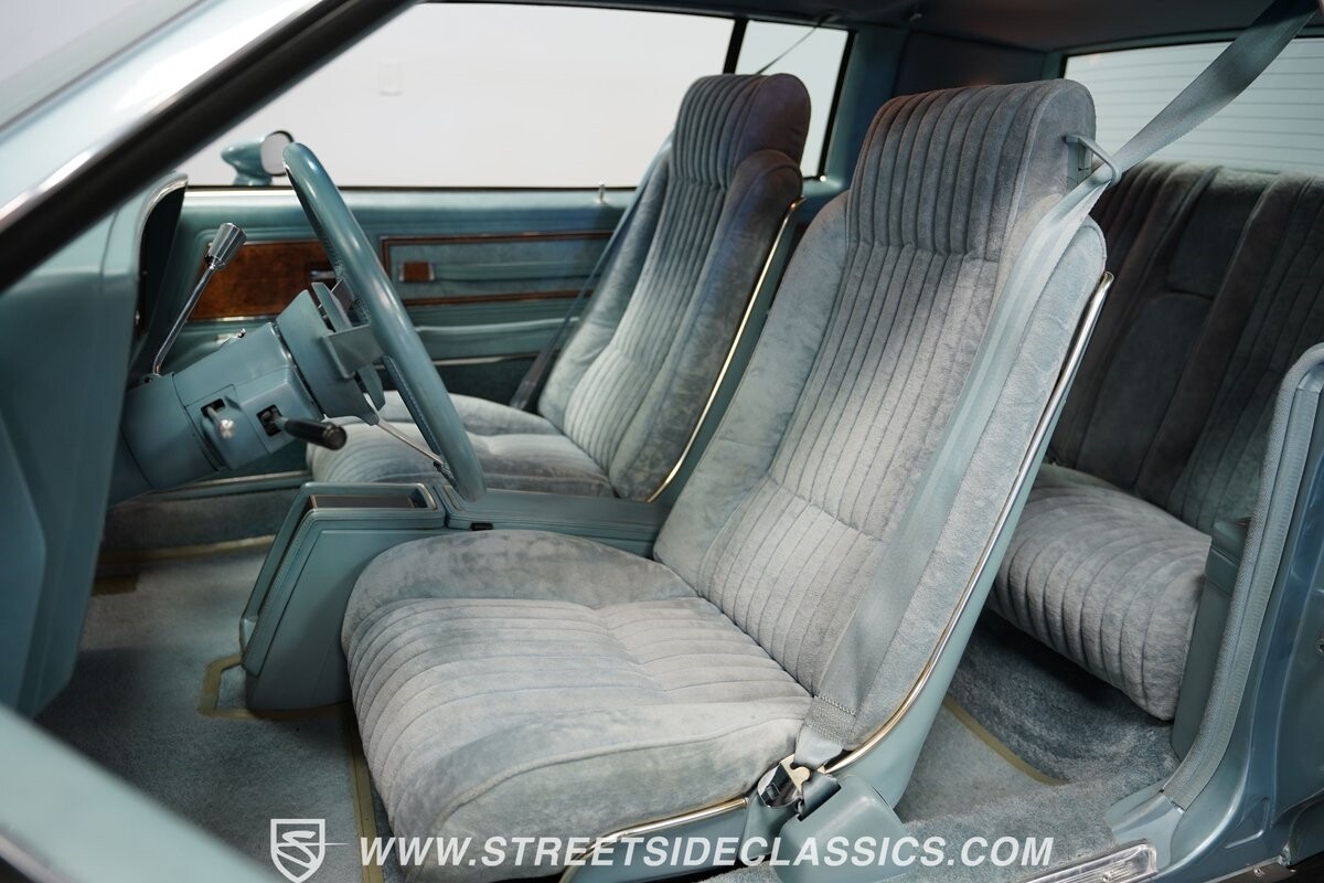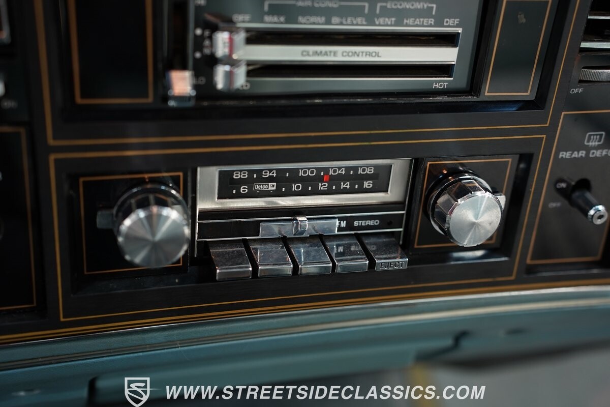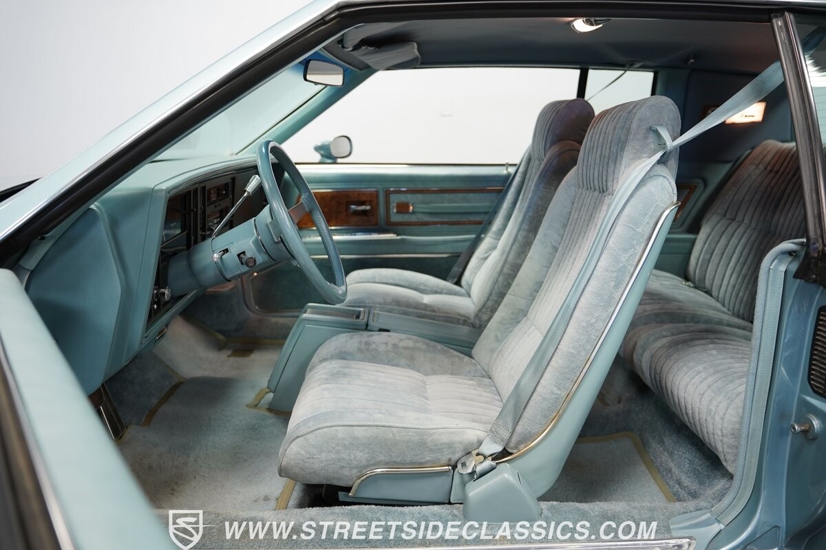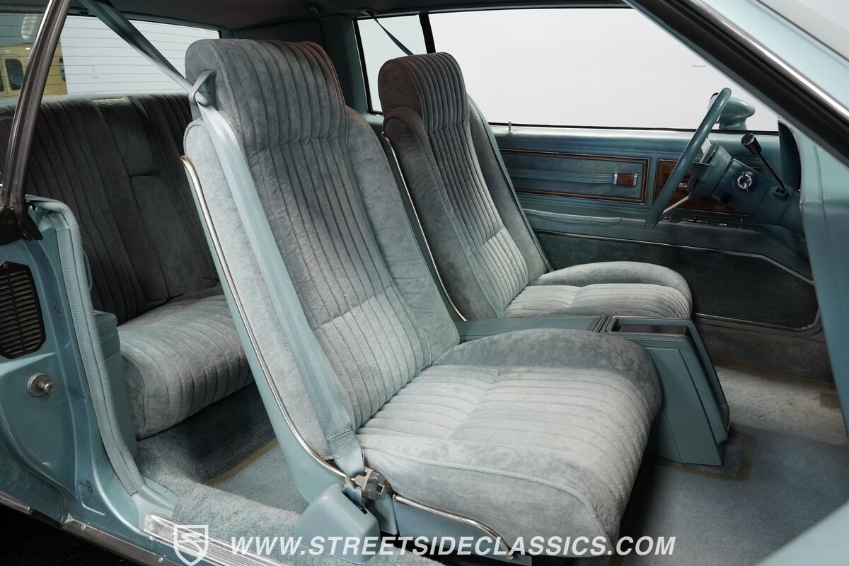 The blue cloth interior reflects the car's low mileage. Comfortable bucket seats offer power adjustments for driver and passenger. Wood accent trim elevates the cabin's ambiance. The dash features factory gauges and an AM/FM cassette stereo with 8-track functionality. Luxury features include power windows, locks, tilt steering, and rear defogger. The factory air conditioning, converted to R134a, keeps the cabin cool.