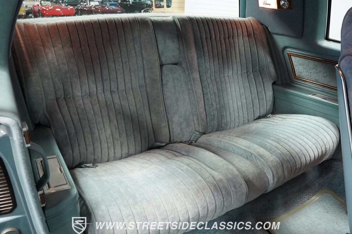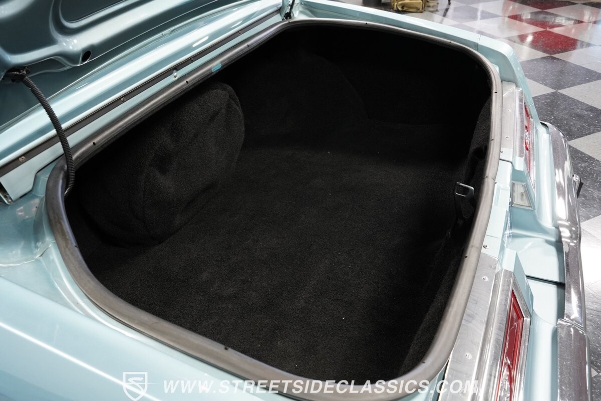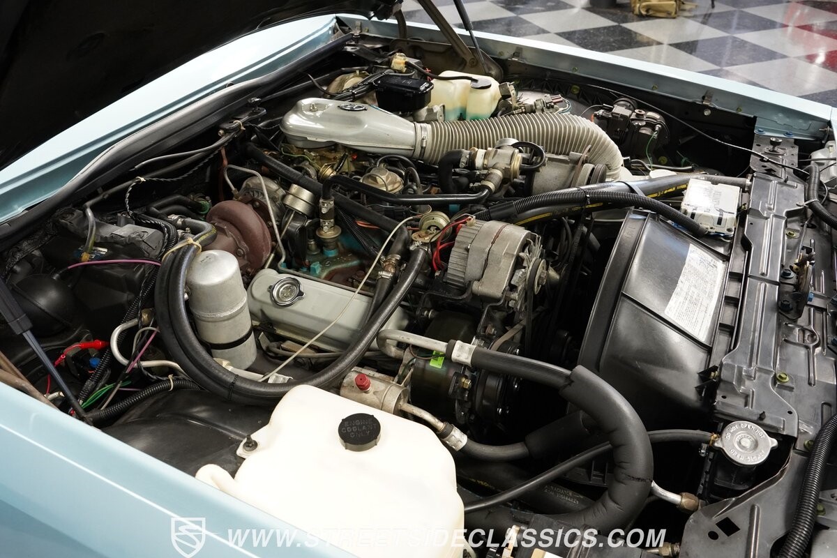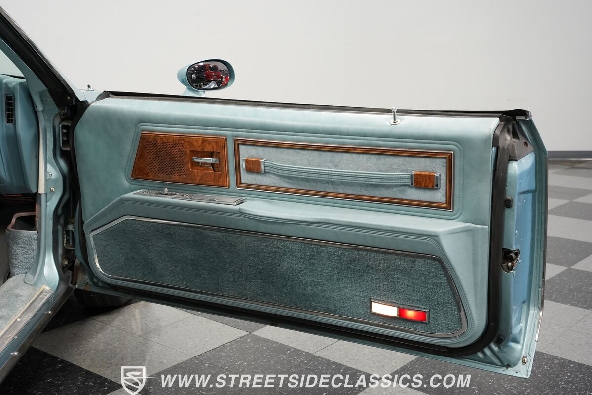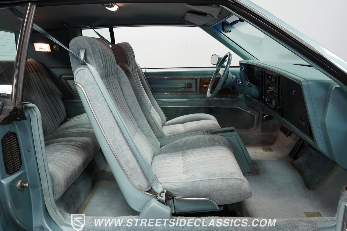 The blue cloth interior reflects the car's low mileage. Comfortable bucket seats offer power adjustments for driver and passenger. Wood accent trim elevates the cabin's ambiance. The dash features factory gauges and an AM/FM cassette stereo with 8-track functionality. Luxury features include power windows, locks, tilt steering, and rear defogger. The factory air conditioning, converted to R134a, keeps the cabin cool.