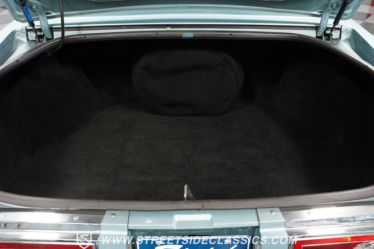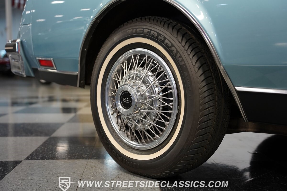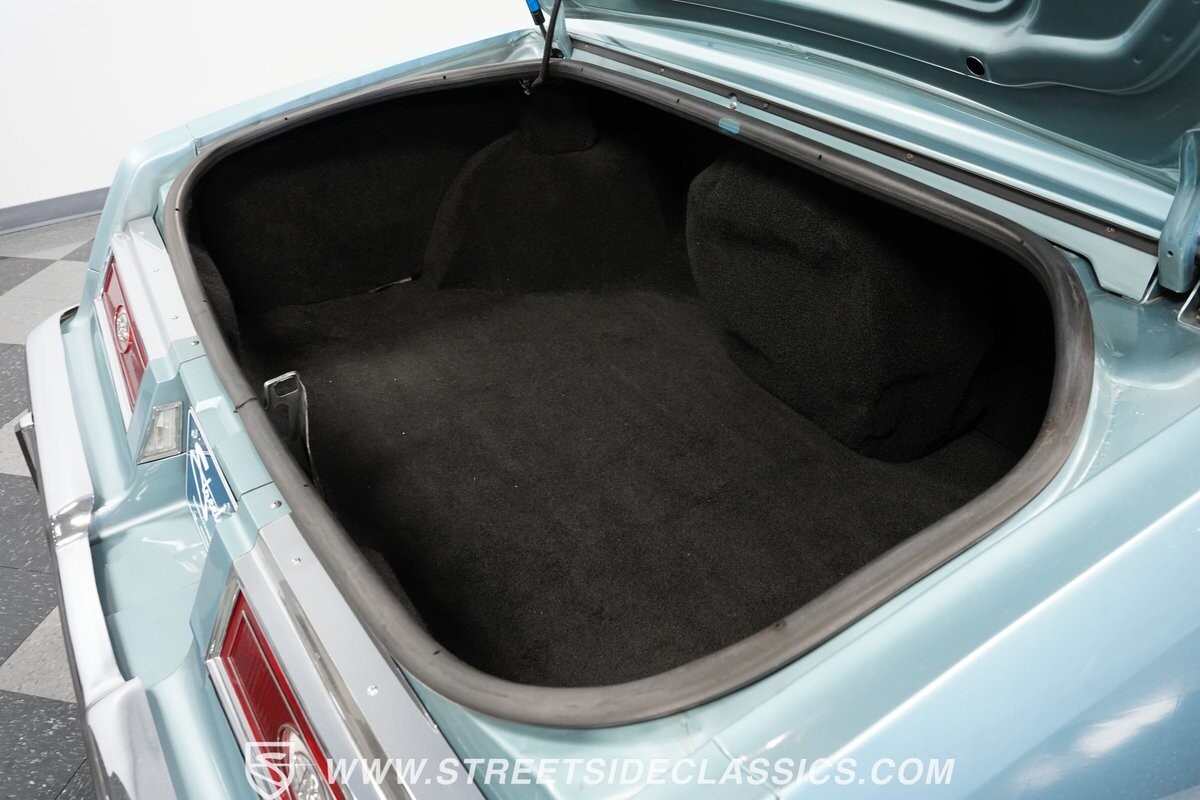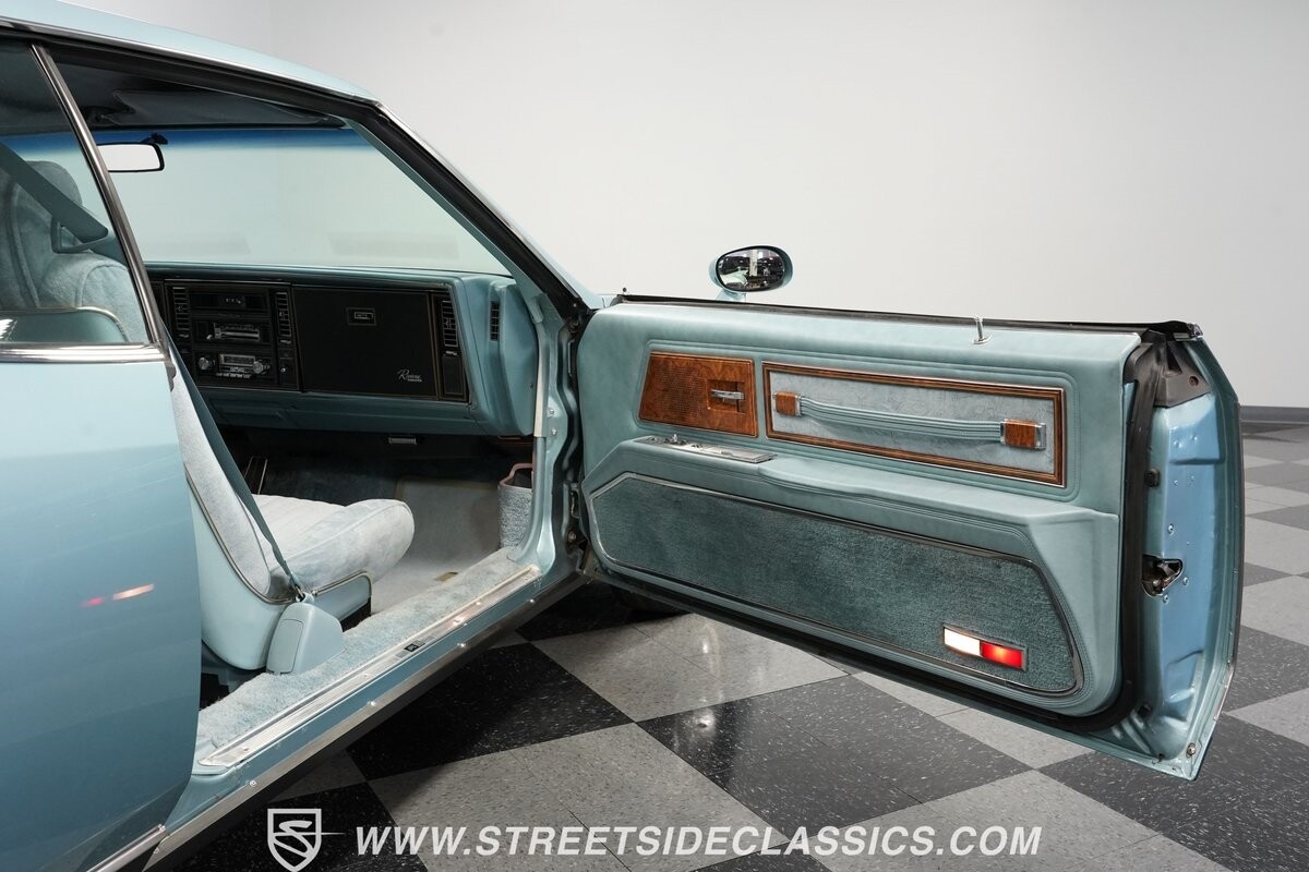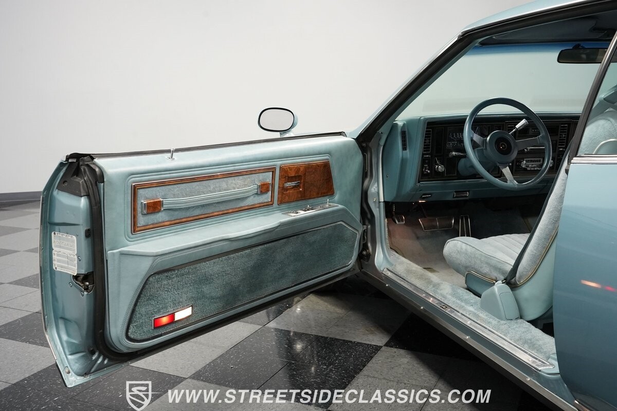 The blue cloth interior reflects the car's low mileage. Comfortable bucket seats offer power adjustments for driver and passenger. Wood accent trim elevates the cabin's ambiance. The dash features factory gauges and an AM/FM cassette stereo with 8-track functionality. Luxury features include power windows, locks, tilt steering, and rear defogger. The factory air conditioning, converted to R134a, keeps the cabin cool.