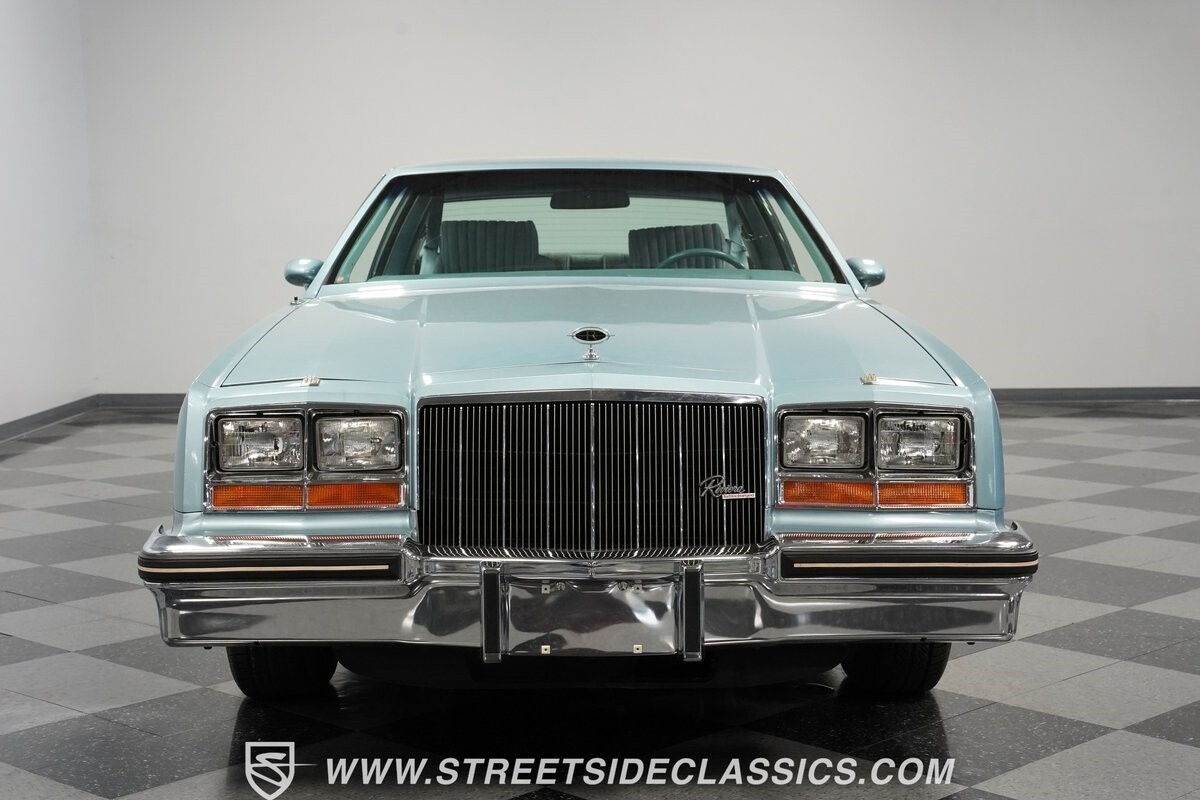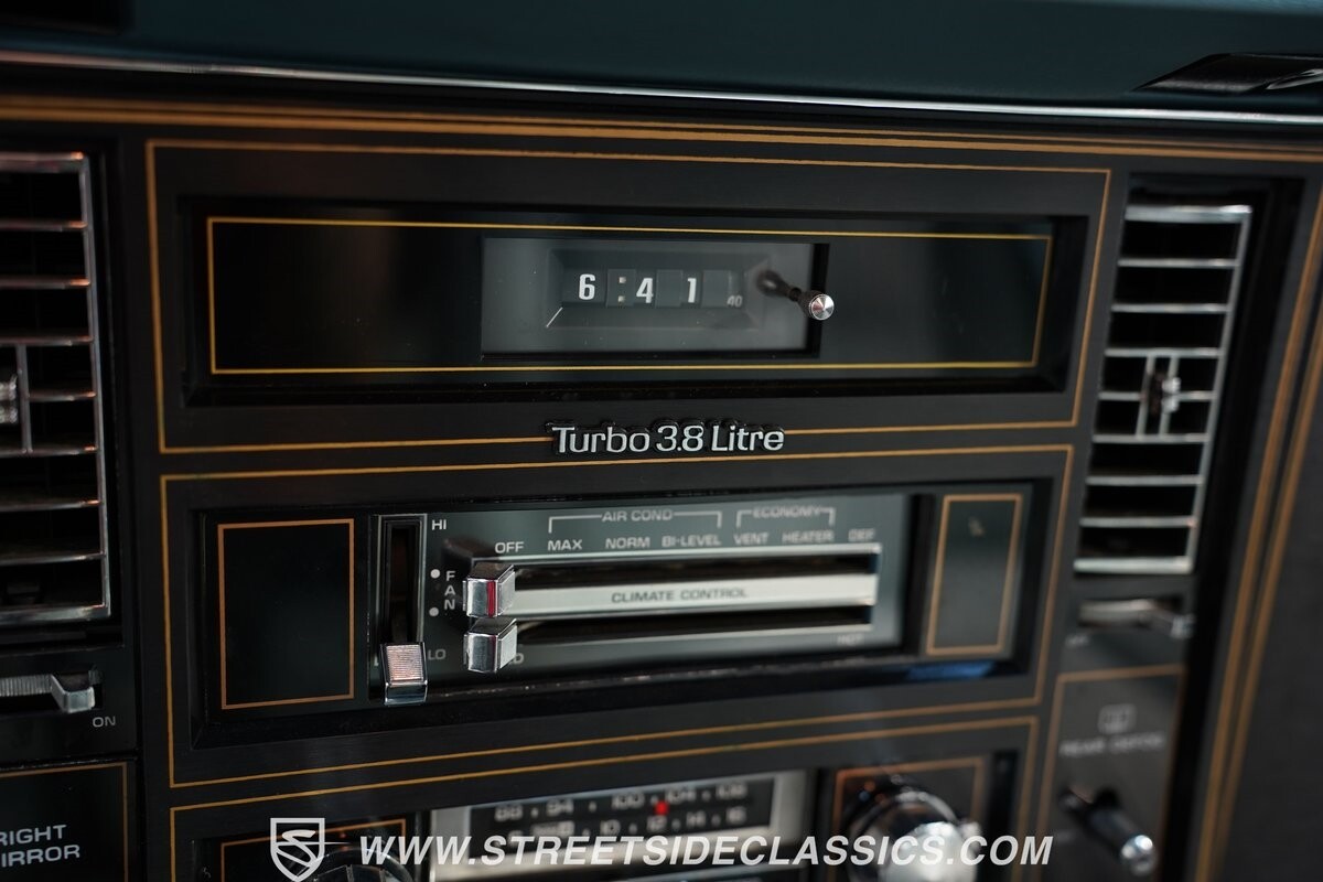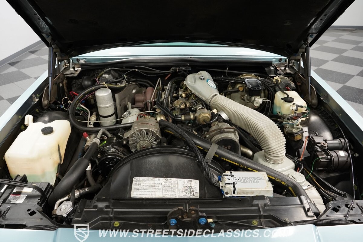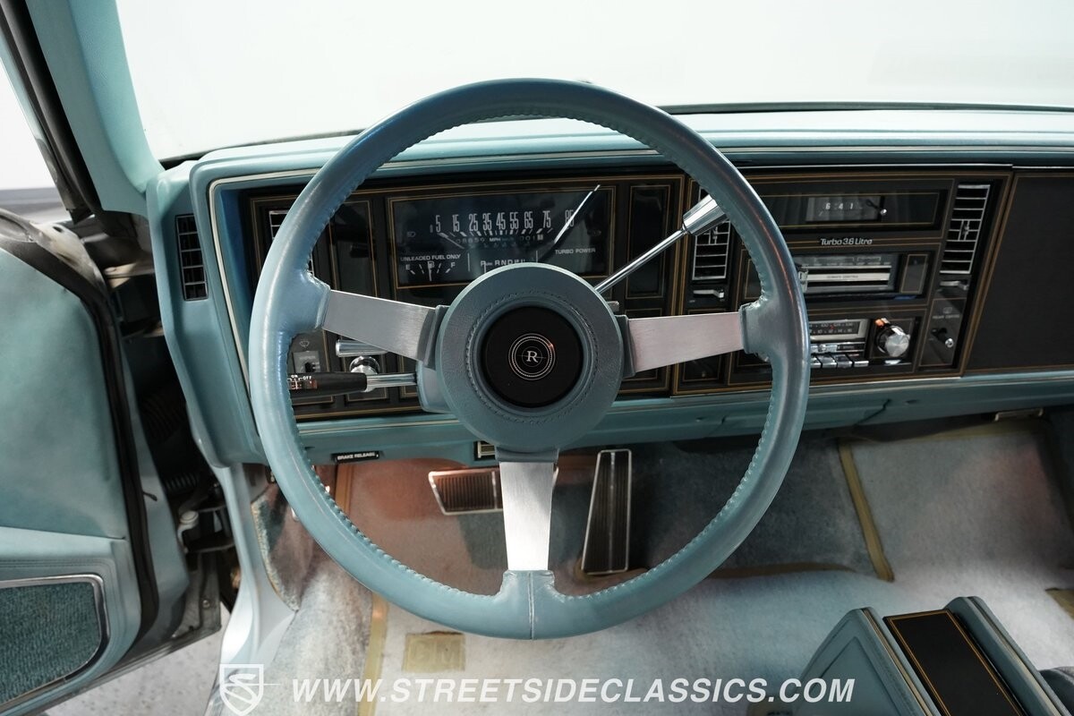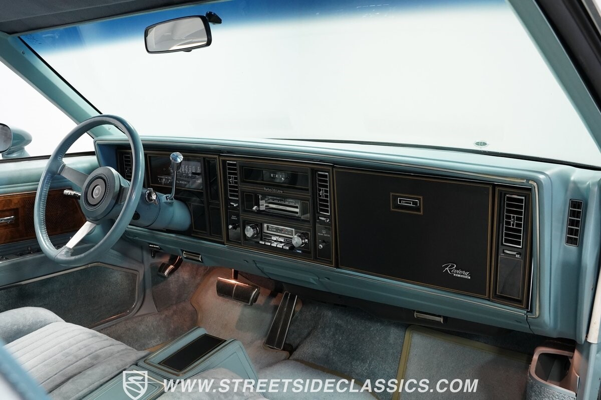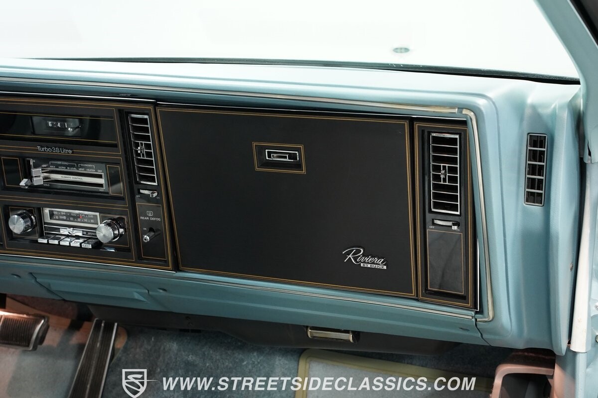 Powering this Riviera is a 3.8L turbocharged V6 engine, coupled with a 3-speed automatic transmission driving the front wheels. This powertrain previews the performance that would later evolve into the Grand National and GNX. The engine compartment retains a clean, factory look. The torsion bar front suspension and independent rear with factory air ride enhance handling. Four-wheel power disc brakes provide effective stopping power.