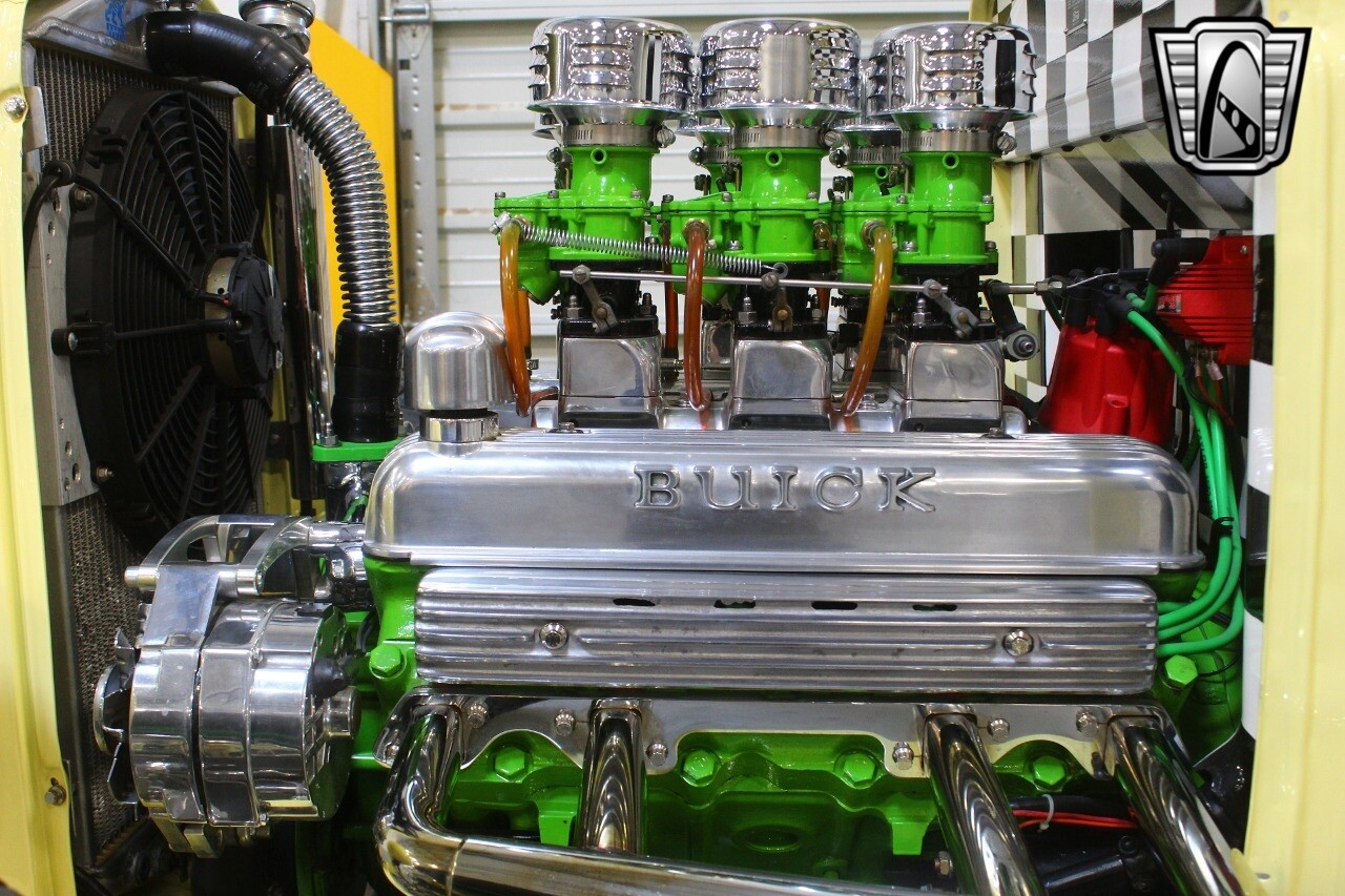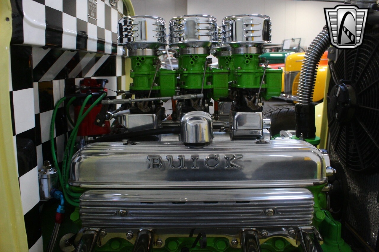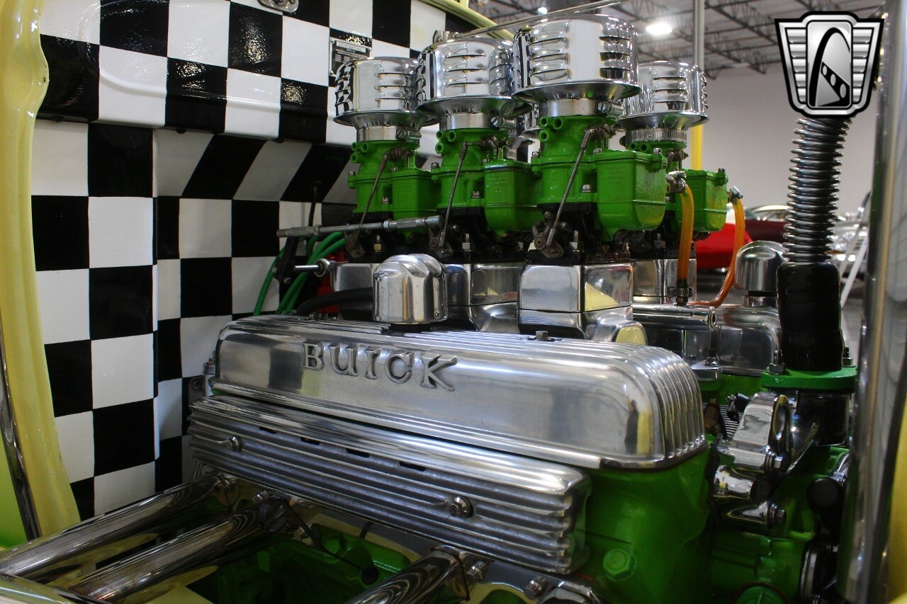Power is coming from a 425 cubic inch Buick Nail Head V8 featuring 6 Stromberg 97 carburetors, Weiand Drag Star intake, Sanderson Lime Fire headers and custom exhaust by Nightmare Street Rods. A Turbo 350 automatic transmission is engaged by a B&M shifter for an effortless cruising experience.