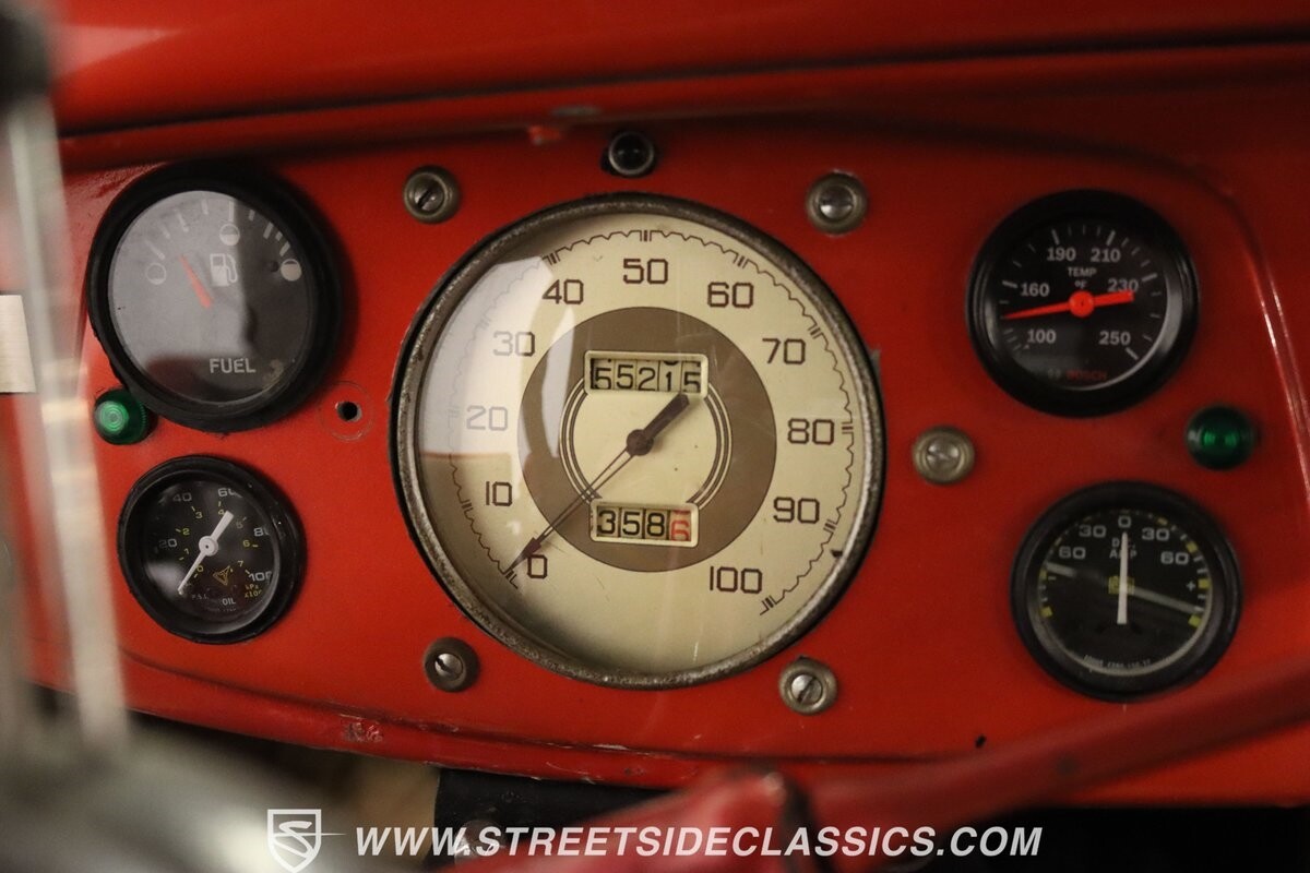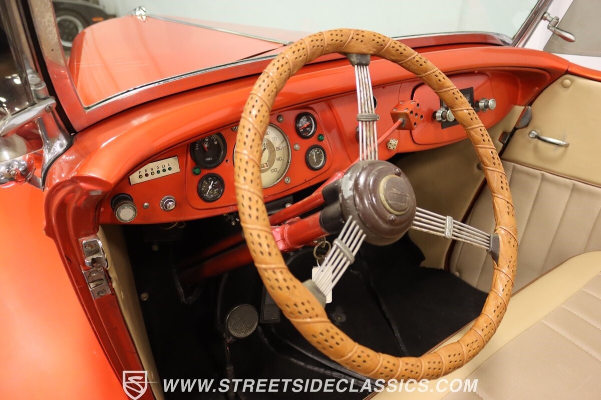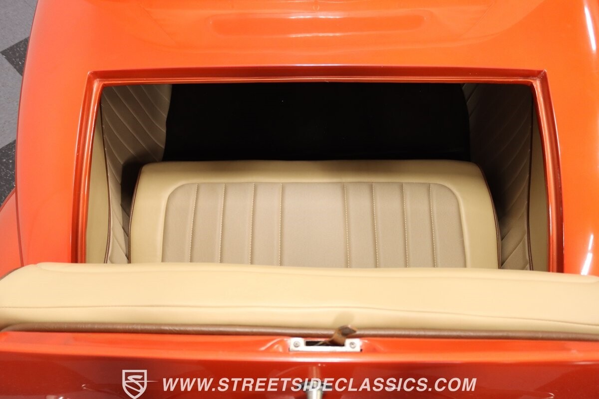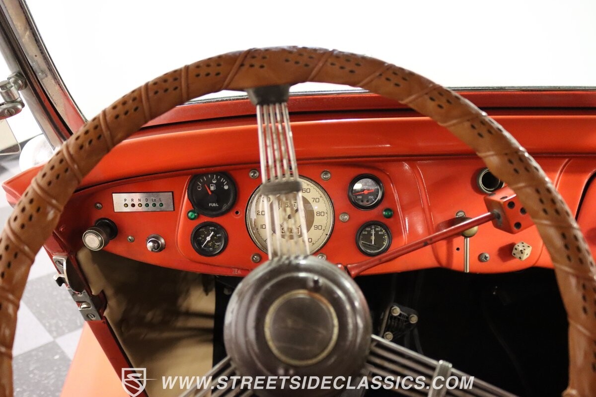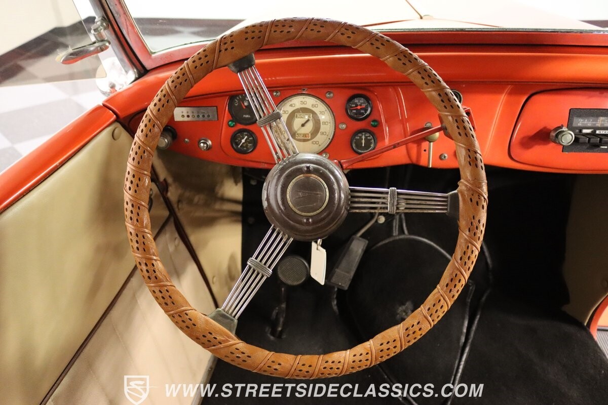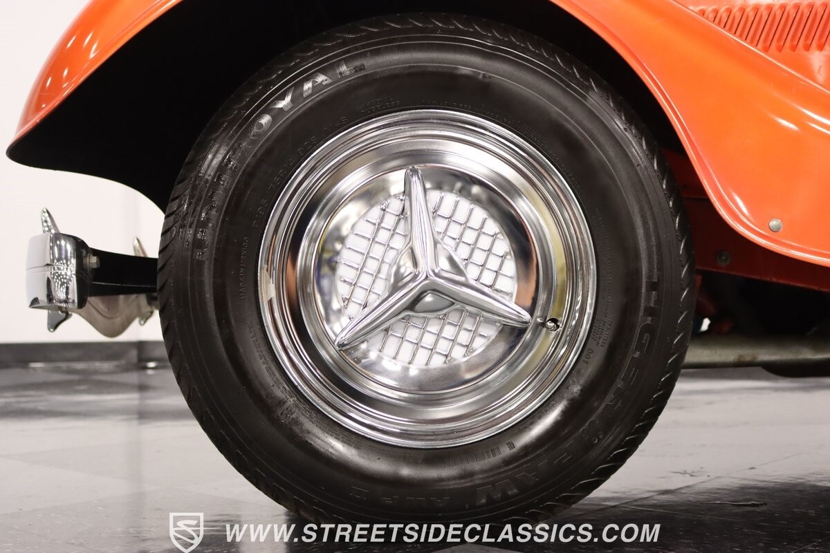Inside, a tale of beige vinyl and cloth weaves through the custom bench seat and matching door panels, providing a harmonious contrast to the Sunburst Orange exterior. This cabriolet takes customization to heart with a steering column and an old-school speedometer reminiscent of a 1940s Ford car. The interior is adorned with a mix of aftermarket gauges and a banjo steering wheel, with an old-style AM/FM radio for tunes that match the ride's vintage vibe.