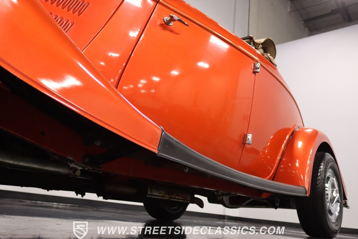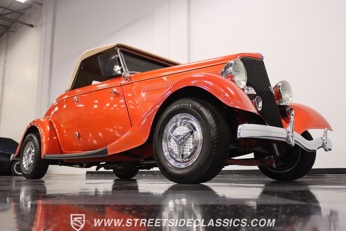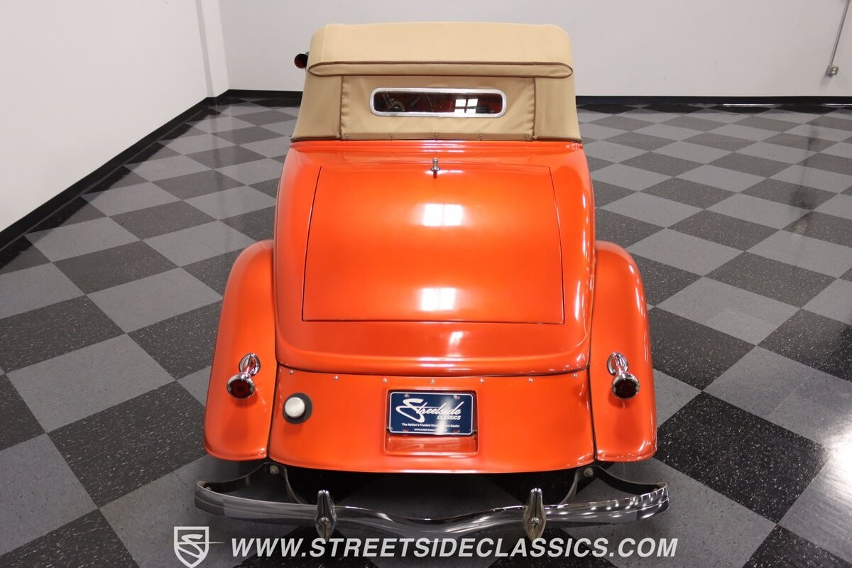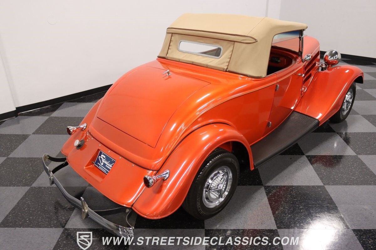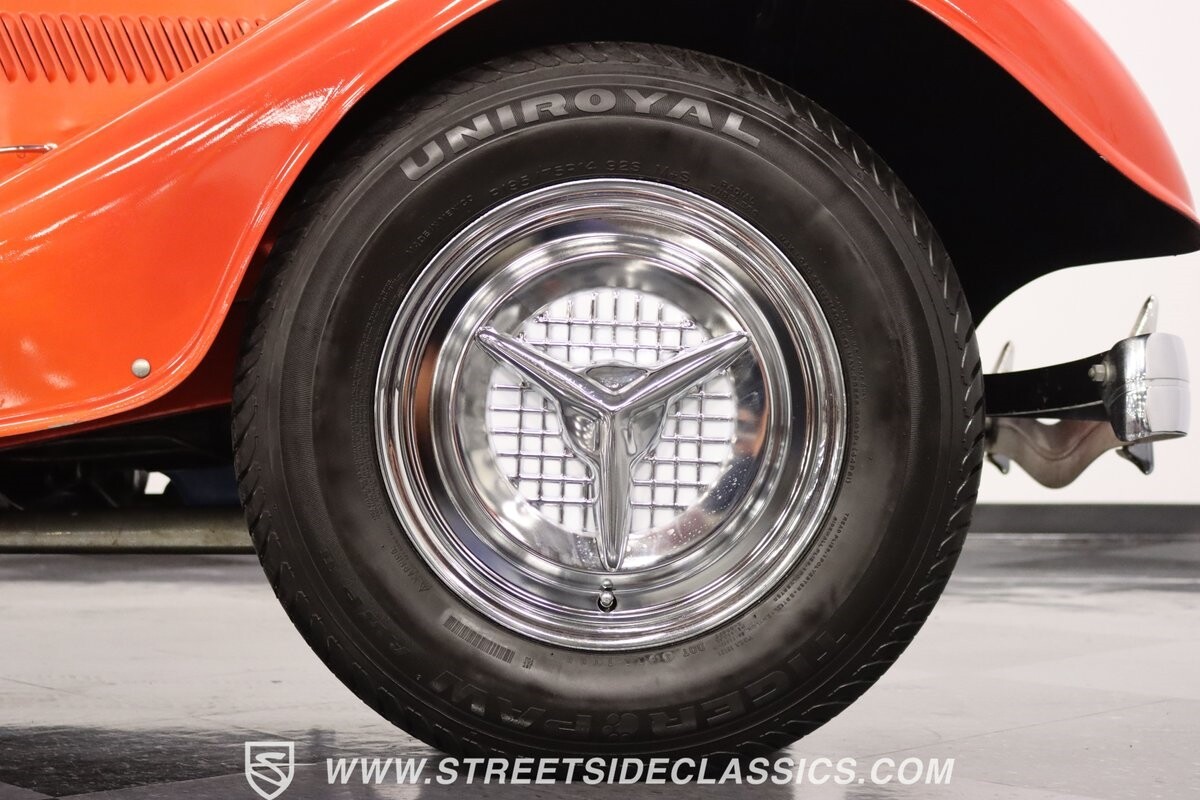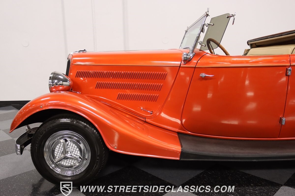 Bathed in a Sunburst Orange that captures the essence of a setting sun over a classic Americana landscape, this 1934 Ford Cabriolet Rumble Seat with its fiberglass body, accented by a genuine steel hood, is a tribute to an era where attention to detail reigned supreme. Enhanced by a tan cloth convertible top that gracefully bows to the car's vibrant exterior. Mounted on 14" wheels, adorned with Fiesta-style wheel covers and wrapped in 195/75R14 tires, ensuring every turn is as smooth as it is eye-catching. The vehicle's distinctive allure is further amplified by a frenched license plate and matching pinstriping, weaving together an aesthetic that's as compelling as it is classic. The addition of rubber mats on the running boards seamlessly blends functionality with finesse, adding another layer to its multifaceted character.