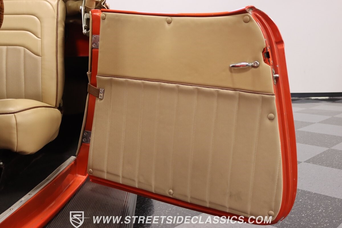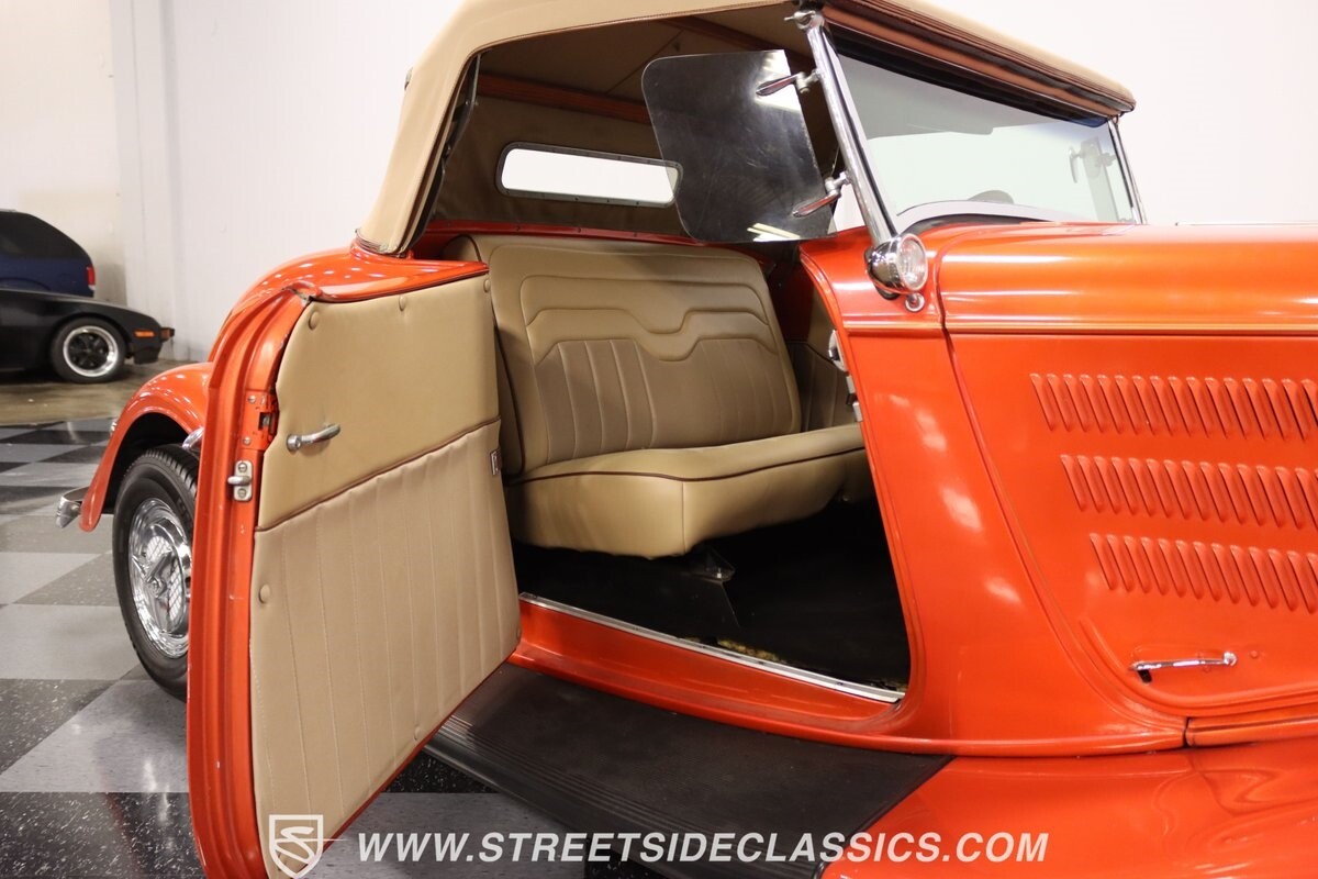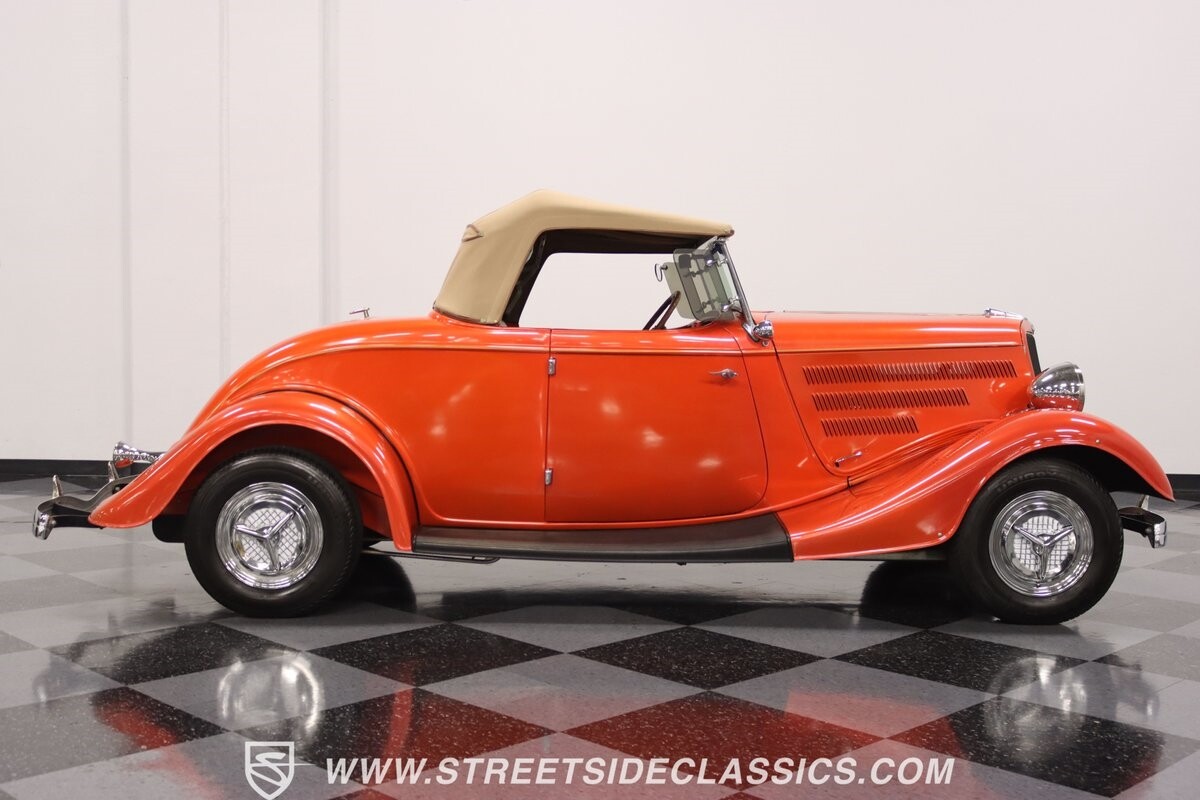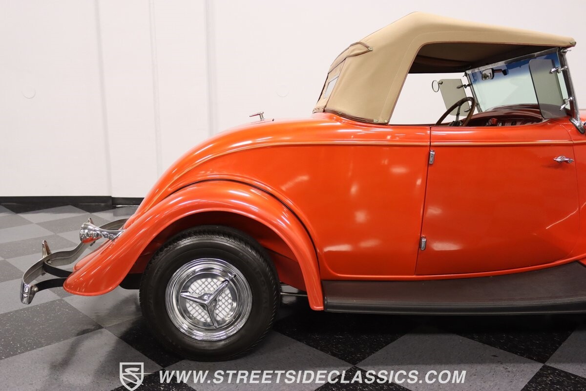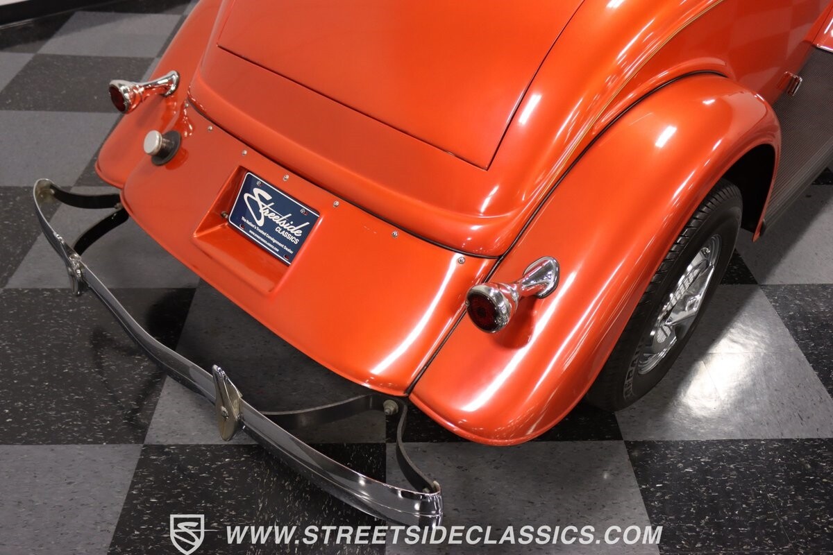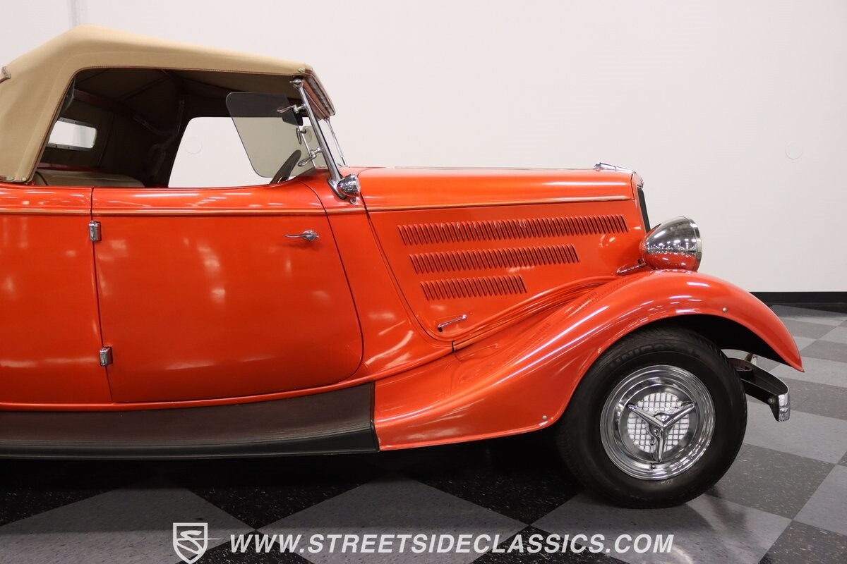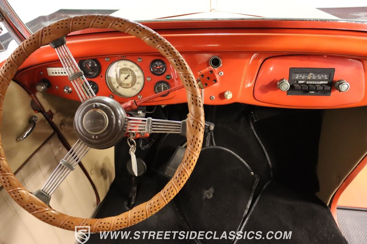 Bathed in a Sunburst Orange that captures the essence of a setting sun over a classic Americana landscape, this 1934 Ford Cabriolet Rumble Seat with its fiberglass body, accented by a genuine steel hood, is a tribute to an era where attention to detail reigned supreme. Enhanced by a tan cloth convertible top that gracefully bows to the car's vibrant exterior. Mounted on 14" wheels, adorned with Fiesta-style wheel covers and wrapped in 195/75R14 tires, ensuring every turn is as smooth as it is eye-catching. The vehicle's distinctive allure is further amplified by a frenched license plate and matching pinstriping, weaving together an aesthetic that's as compelling as it is classic. The addition of rubber mats on the running boards seamlessly blends functionality with finesse, adding another layer to its multifaceted character.