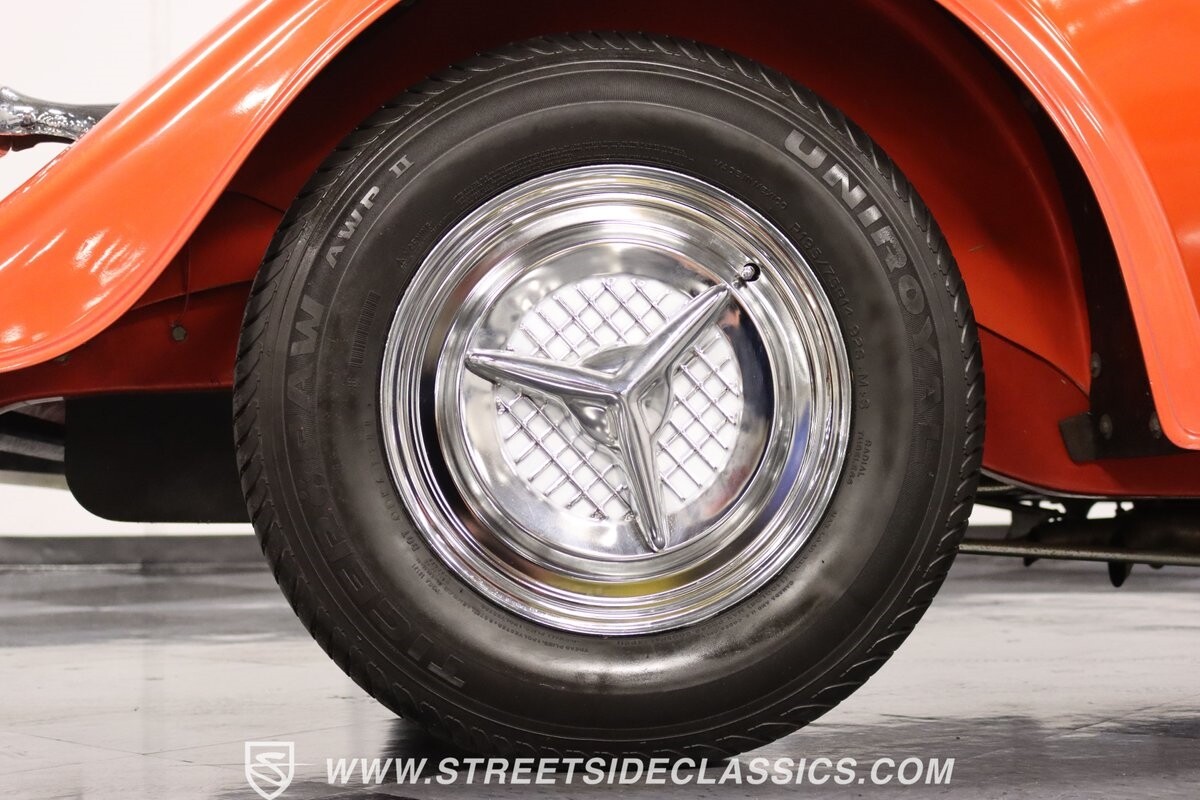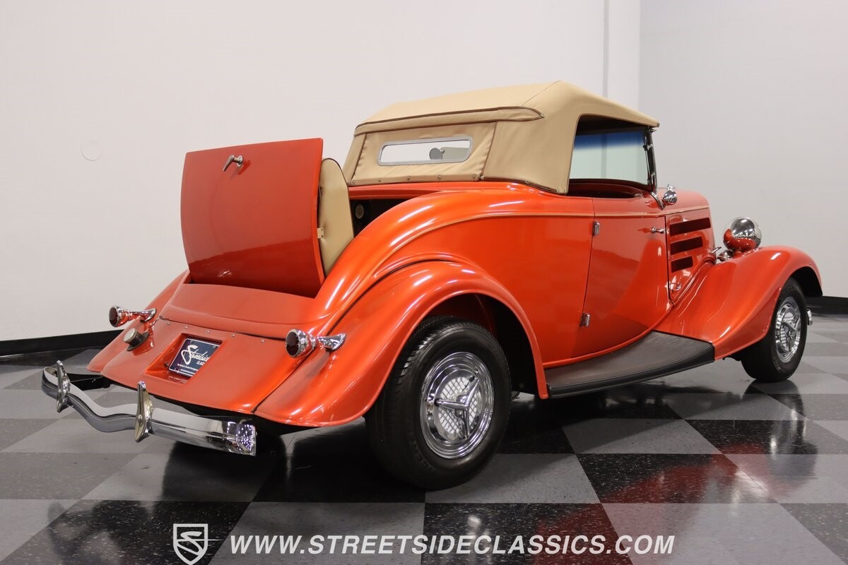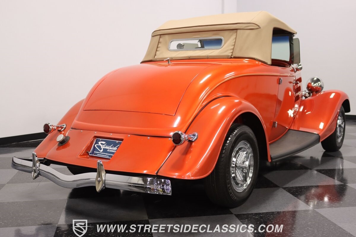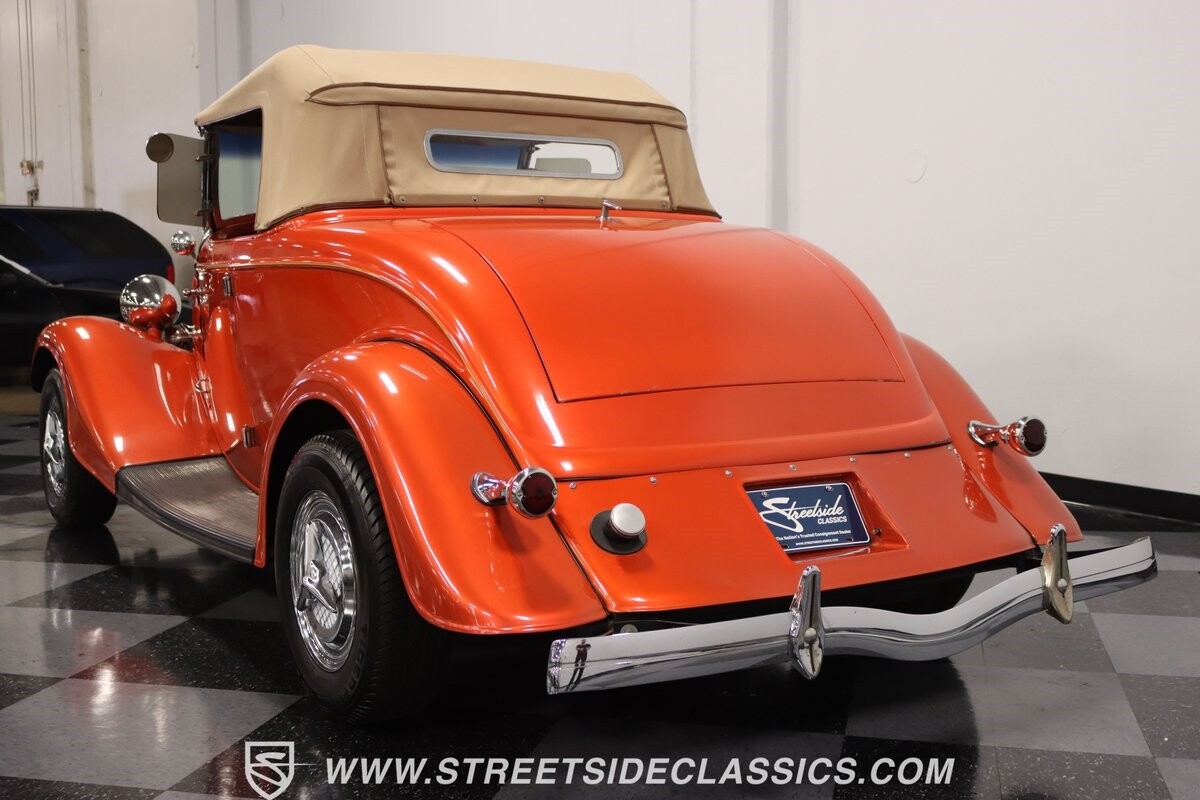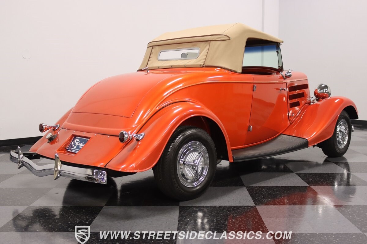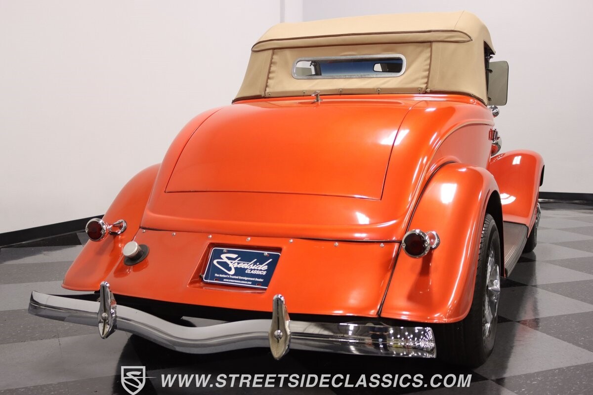 Bathed in a Sunburst Orange that captures the essence of a setting sun over a classic Americana landscape, this 1934 Ford Cabriolet Rumble Seat with its fiberglass body, accented by a genuine steel hood, is a tribute to an era where attention to detail reigned supreme. Enhanced by a tan cloth convertible top that gracefully bows to the car's vibrant exterior. Mounted on 14" wheels, adorned with Fiesta-style wheel covers and wrapped in 195/75R14 tires, ensuring every turn is as smooth as it is eye-catching. The vehicle's distinctive allure is further amplified by a frenched license plate and matching pinstriping, weaving together an aesthetic that's as compelling as it is classic. The addition of rubber mats on the running boards seamlessly blends functionality with finesse, adding another layer to its multifaceted character.