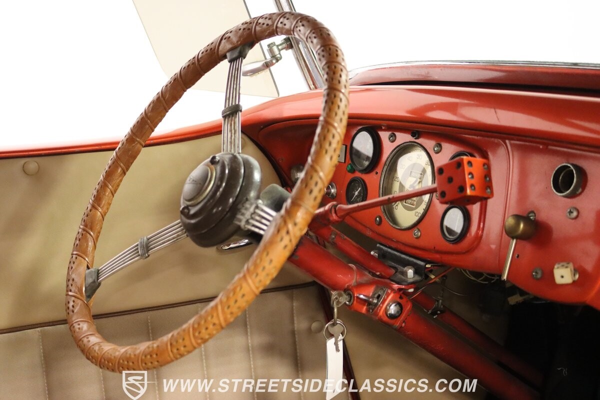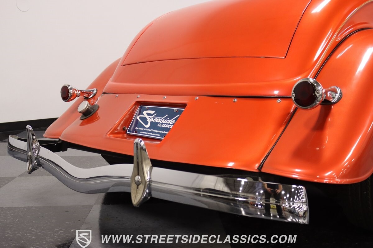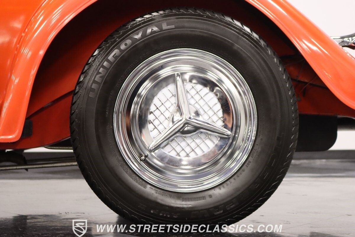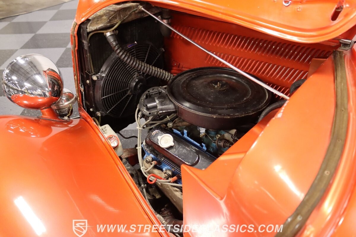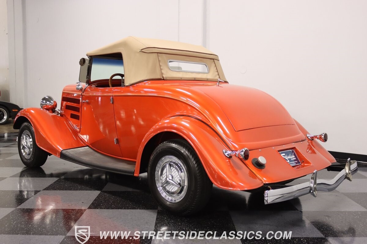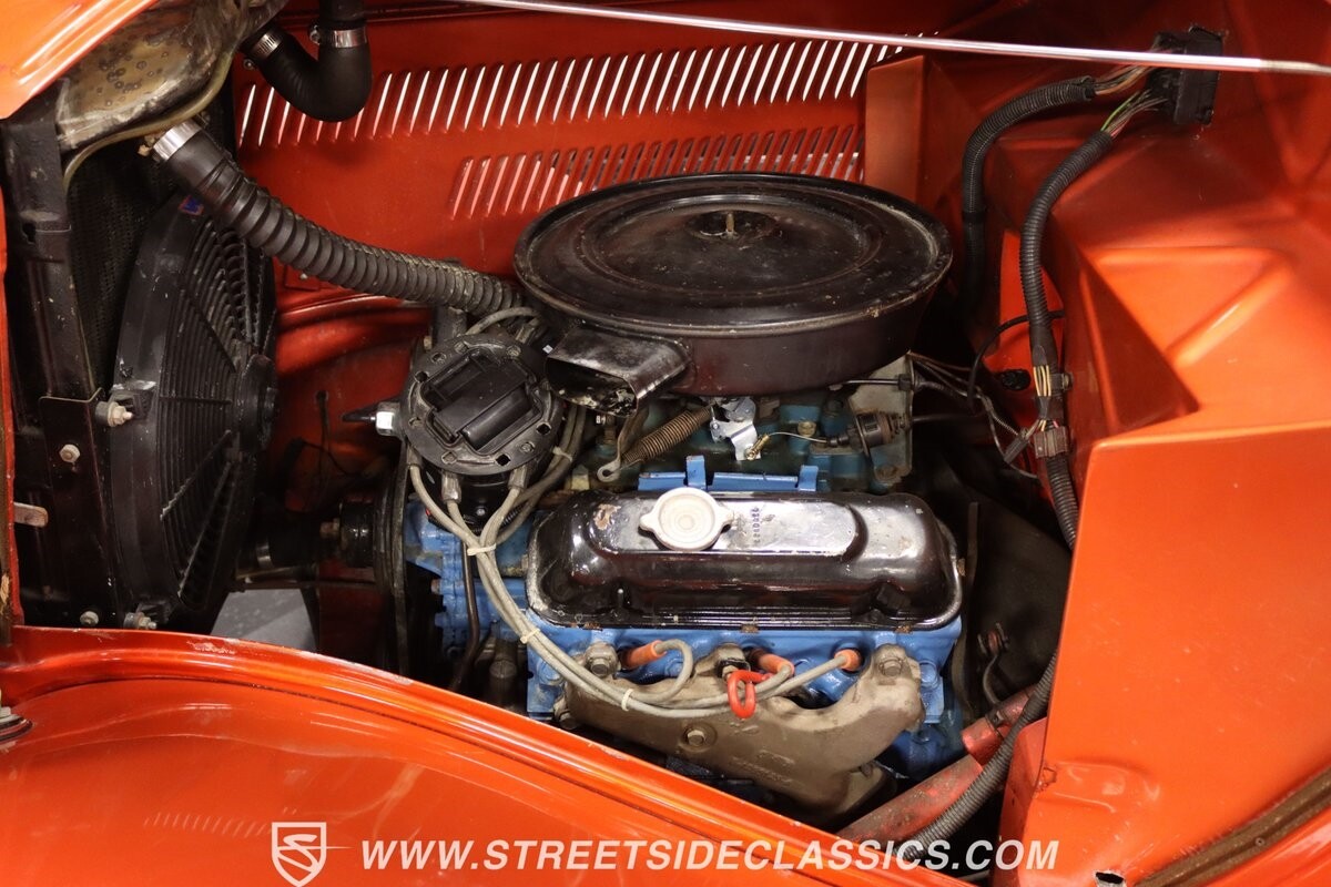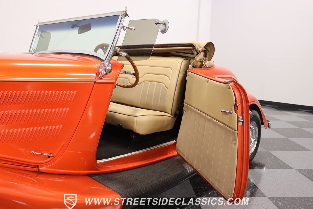 Bathed in a Sunburst Orange that captures the essence of a setting sun over a classic Americana landscape, this 1934 Ford Cabriolet Rumble Seat with its fiberglass body, accented by a genuine steel hood, is a tribute to an era where attention to detail reigned supreme. Enhanced by a tan cloth convertible top that gracefully bows to the car's vibrant exterior. Mounted on 14" wheels, adorned with Fiesta-style wheel covers and wrapped in 195/75R14 tires, ensuring every turn is as smooth as it is eye-catching. The vehicle's distinctive allure is further amplified by a frenched license plate and matching pinstriping, weaving together an aesthetic that's as compelling as it is classic. The addition of rubber mats on the running boards seamlessly blends functionality with finesse, adding another layer to its multifaceted character.