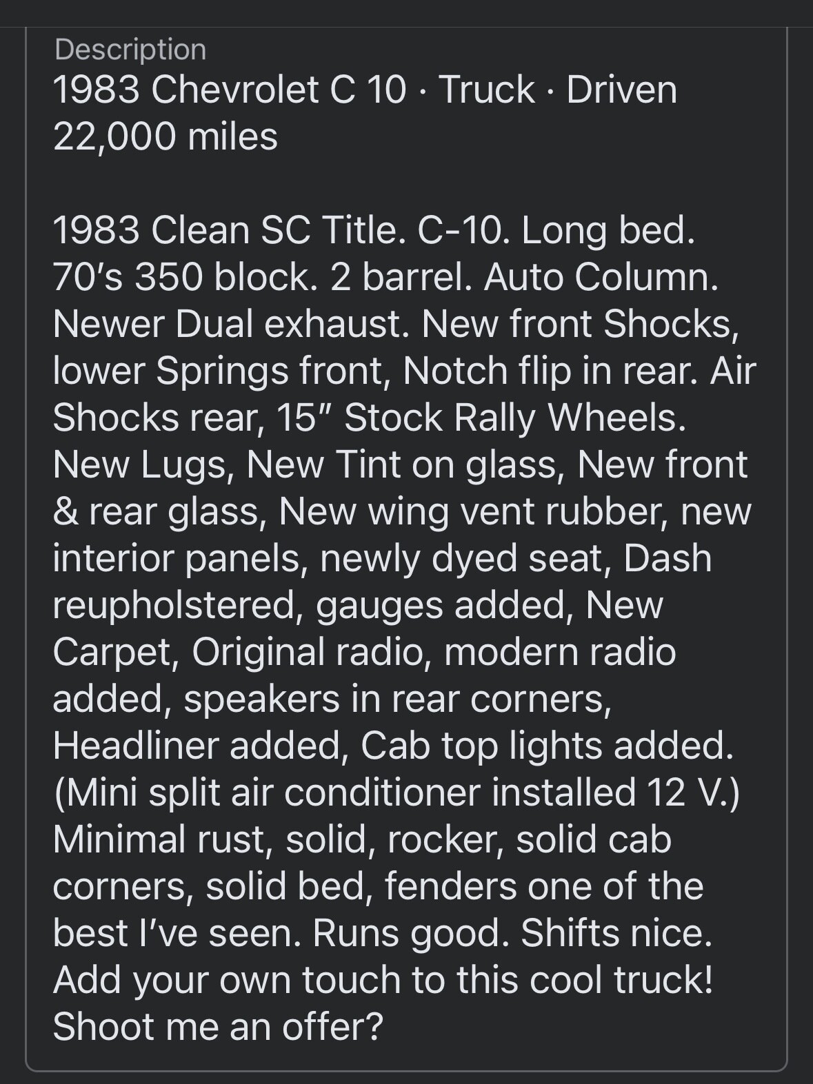 This 1983 Chevrolet C10 is a head-turner with its modified exterior and classic red color. With a clean title and 122,000 miles on the odometer, this vehicle has been well-maintained and cared for by its owner for the past year. Perfect for weekend drives, the C10 runs great and is sure to provide a thrilling and enjoyable driving experience.Seller's Notes