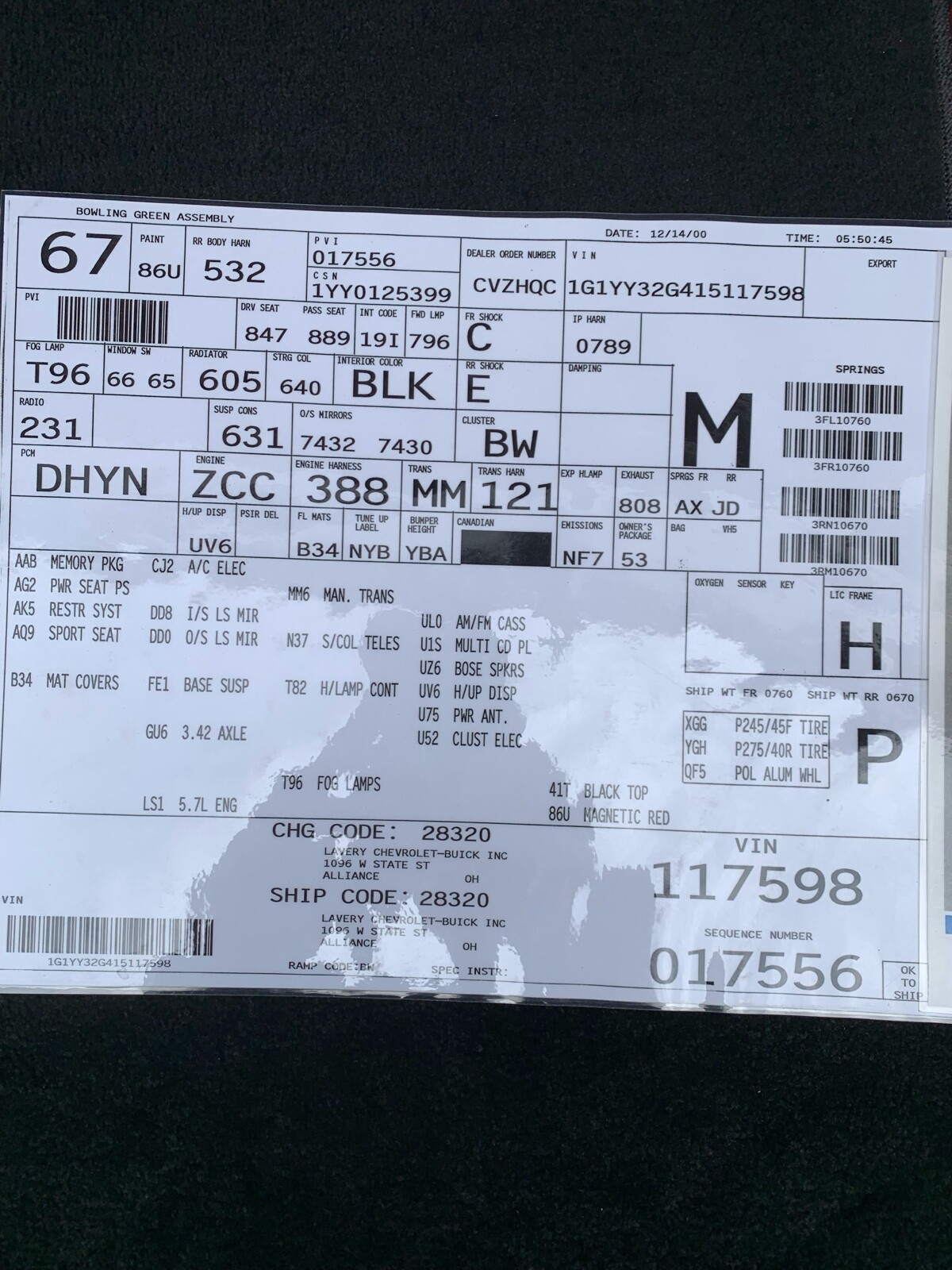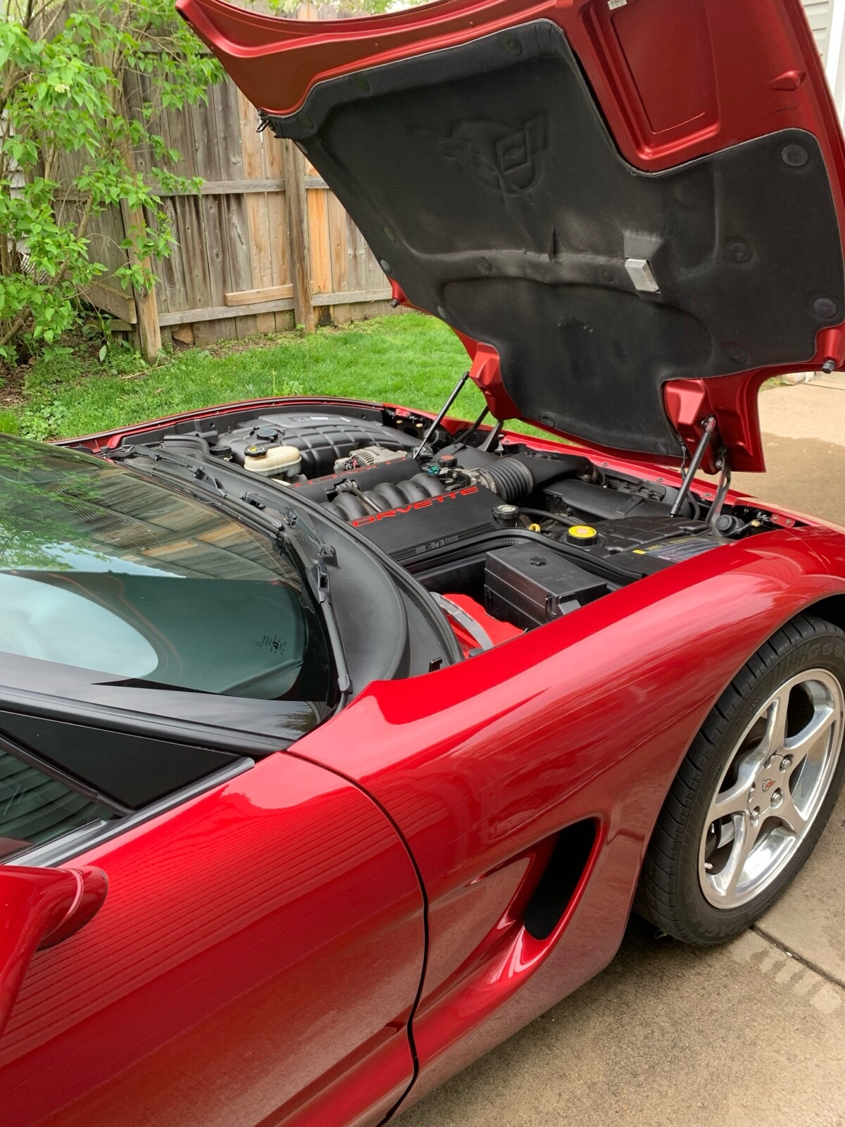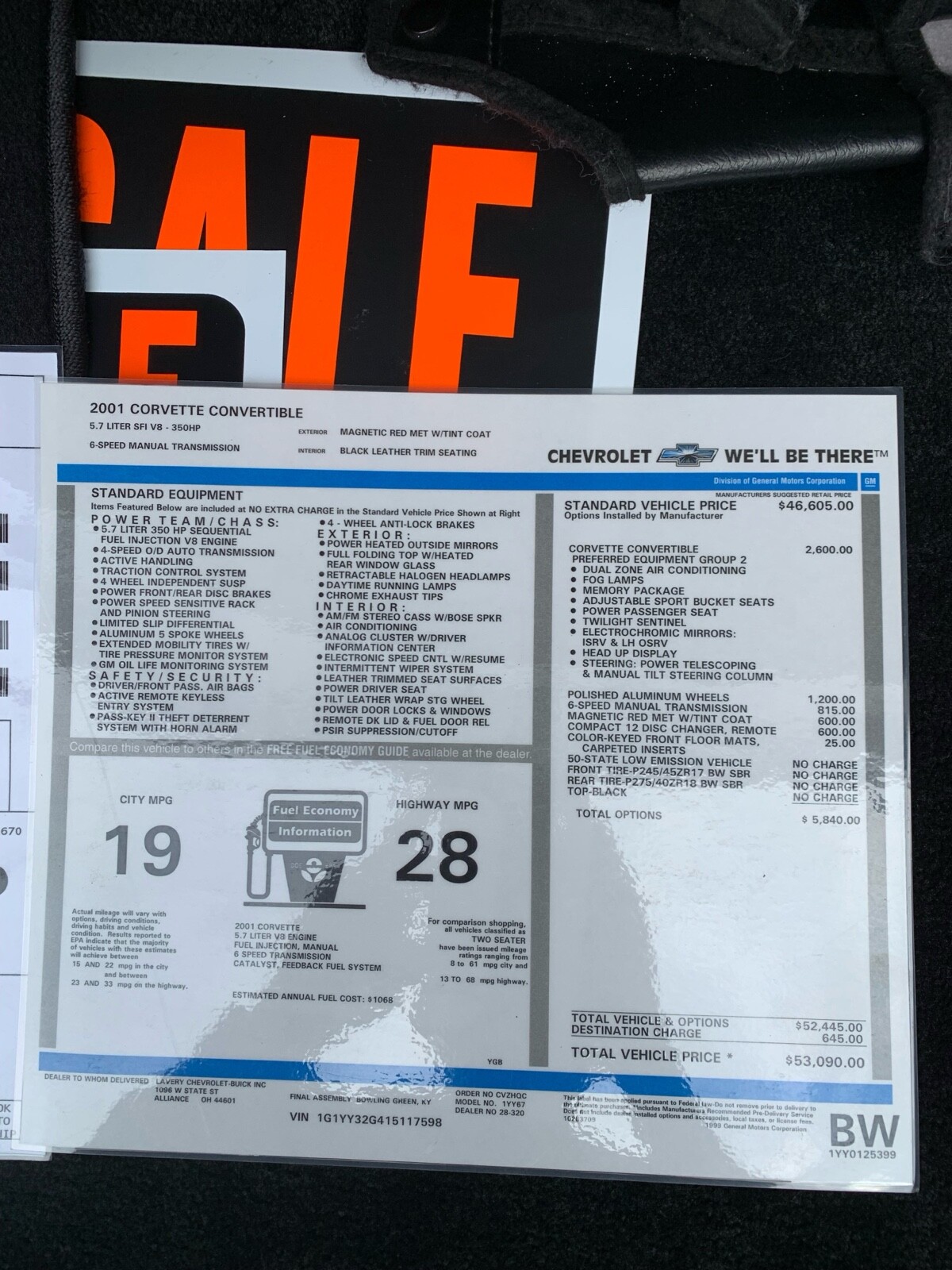 2001 ChevroIet Corvette, convertible, 6 speed manual transmission. All original except for the Corsa exhaust. I purchased this vehicle in September of 2018. I am the third owner. Originally the vehicle was purchased on a four year lease from 2001 thru 2005. The second owner had the vehicle for thirteen years from 2005 until my purchase in 2018. I’ve had very few problems other than changing a battery in 2023, and a oil pressure sensor. The only current issues with the vehicle is the remote lock/unlock works intermittently. I’ve changed the batteries but it still does not work consistently. I have to use the key on occasion to unlock the car. The other issue is the headlight motors are beginning to chatter for a few seconds when you turn off the lights. This is because of a small plastic gear inside the headlight housing that has worn. The parts are readily available for around $50 plus around two hours labor to repair. Or, both motors can be replaced for $150 each. They can be purchased at Advanced Auto Parts or any part store. I rarely drive the car at night and haven’t gotten around to repairing them.The tires are Good Year Eagles and are about seven years old. The second owner told me he had the tires replaced the year before he sold the car and they had about 3000 miles on them. I’ve had the car almost six years and have put 15k miles on the tires, so plenty of tread life left. The top is in excellent shape as is the entire vehicle. The vinal wrap has done it job. The car with me has been accident free with the exception of one minor backing incident where a lady backed into me while in a drive thru restaurant. The right front bumper area was damaged and professionally repaired with no issues.