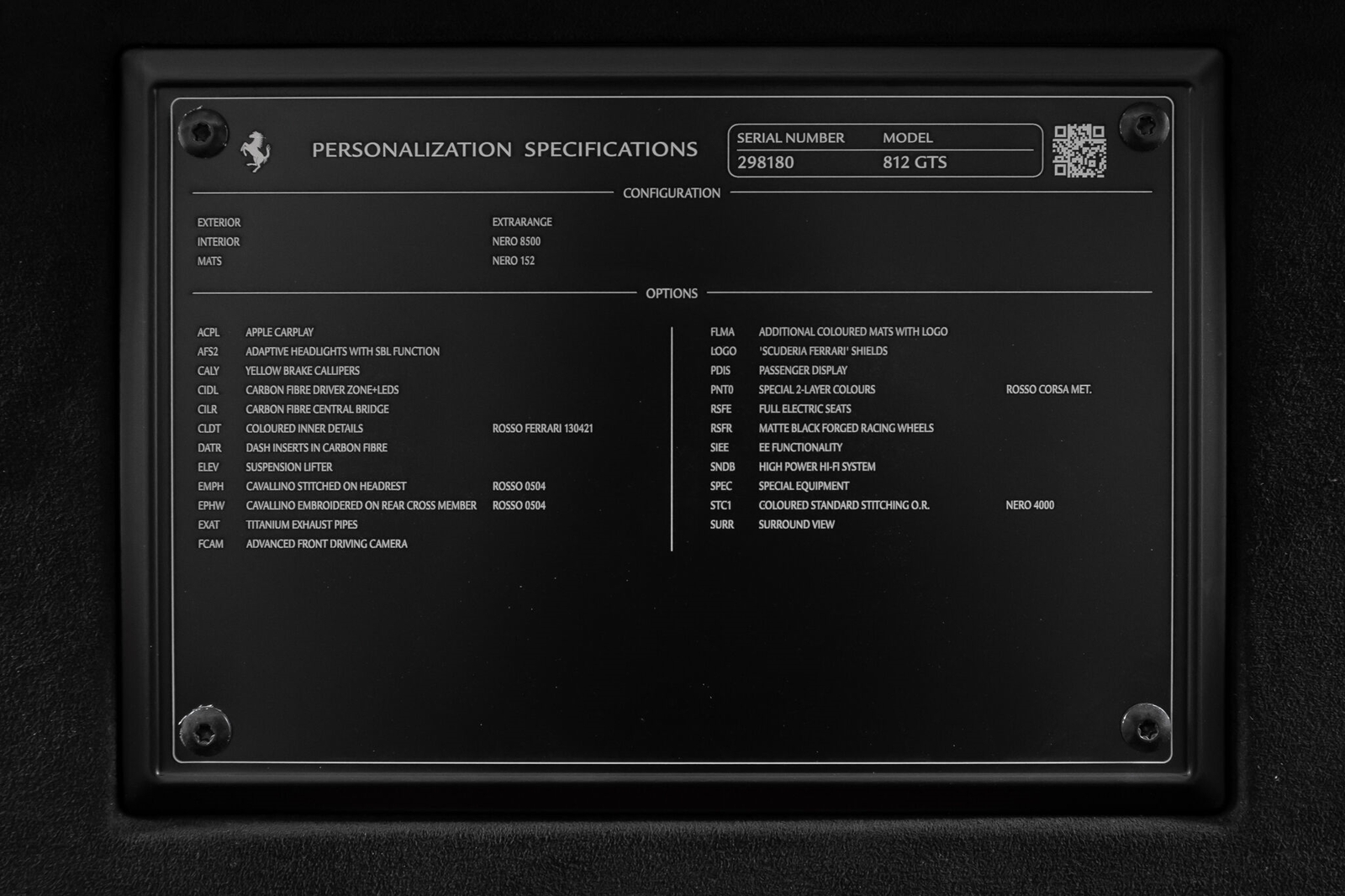 Ferrari South Bay is proud to present this 1-owner "Delivery Mile" Ferrari 812 GTS painted in stunning Rosso Corsa Metallic with Nero Black leather accented with Rosso Ferrari. The finish on this car is nothing short of spectacular - a gorgeous variation on Ferrari's Historic Rosso Corsa, the 2-Part Metallic Rosso Corsa Metallic adds a level of richness and depth that truly must be seen in person to be appreciated. As good as our photographer is (and he's VERY good), photos just cannot do this amazing color justice. It's the perfect gift-wrap for the 789 Horsepower 6.5 Liter V12 engine lurking under the bonnet, waiting to deliver a spine-tingling 8,900 RPM wail as it reels in the horizon.The exterior features include 20-inch Matte Forged Racing Wheels, wrapped around Carbon Ceramic Brakes with Yellow Calipers. Scuderia shields grace the front fenders. Titanium Exhaust tips allow that amazing V12 to breathe freely.The cabin is trimmed in deep Nero Black Leather with Rosso Leather accents on the Fully Electric Seats. Cavallinos are Embroidered on the Seat Headrests and the Rear Cabin Crossmember in Rosso. The Carbon Fiber Driver's Zone provides Carbon Fiber finishes to the Instrument Binnacle, F1 Shift Paddles and Steering Wheel - the latter of which is fitted with Ferrari's now-iconic LED shift lights. The Central Bridge and Dash Inserts are also finished in Carbon Fiber. The Suspension Lifter and Surround View Camera help with tight maneuvers and steep driveways. The Passenger Display, Apple CarPlay and Premium JBL Audio System keep your passenger entertained should you find yourself in traffic. This wonderful 812 GTS is offered with both keys and the original books, tools, car cover and battery tender. The Original Factory Warranty is in place through November 9, 2026, and Ferrari Genuine Maintenance will cover annual services through November 9, 2030. The car has passed the Ferrari 101-pt Certified Pre-Owned inspection, and so is eligible for 2-year warranty extension at the time of purchase. If you'd like to know more about this 812 GTS - or perhaps make an appointment to see it in person - please reach out to our knowledgeable sales staff.