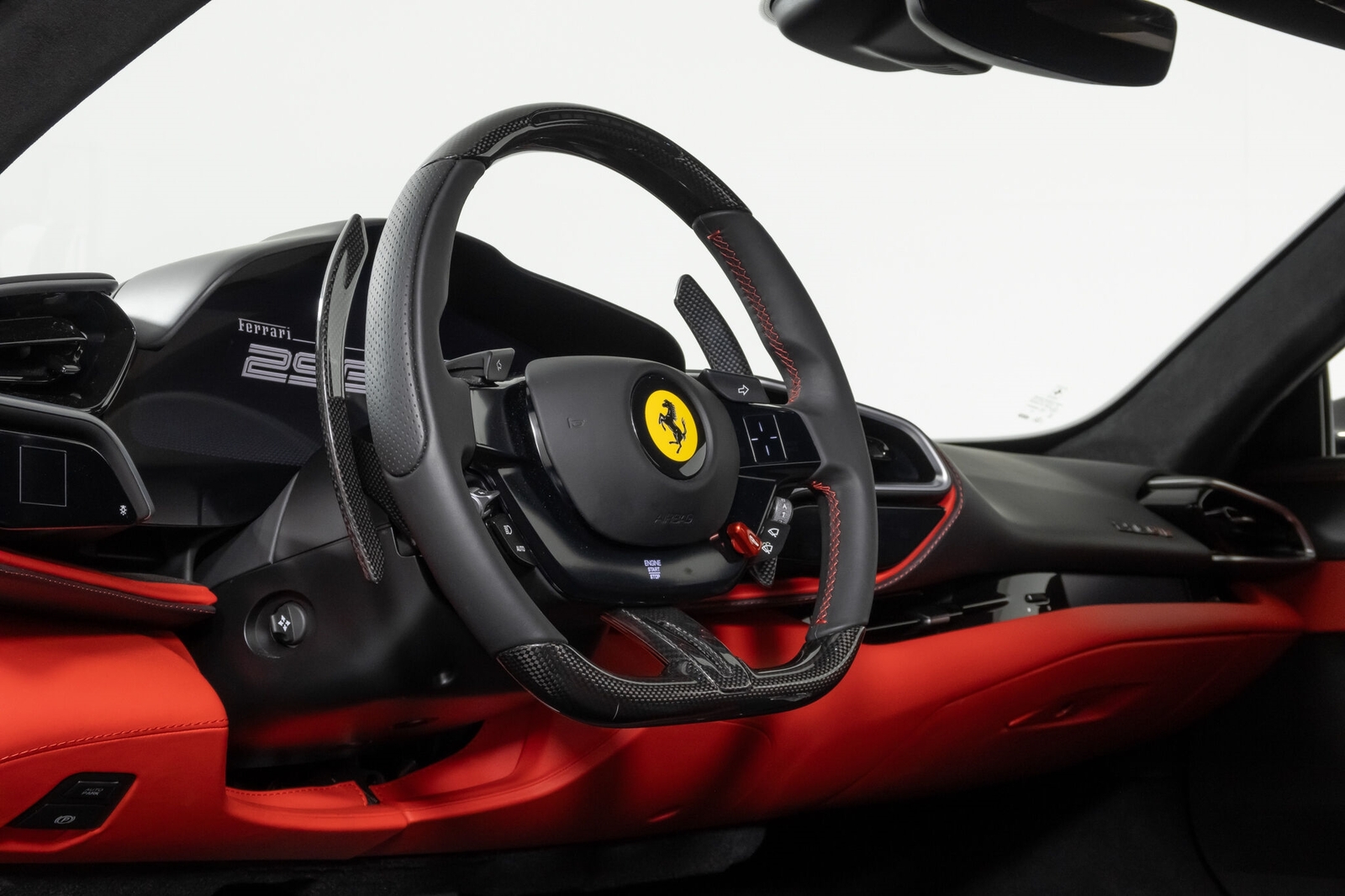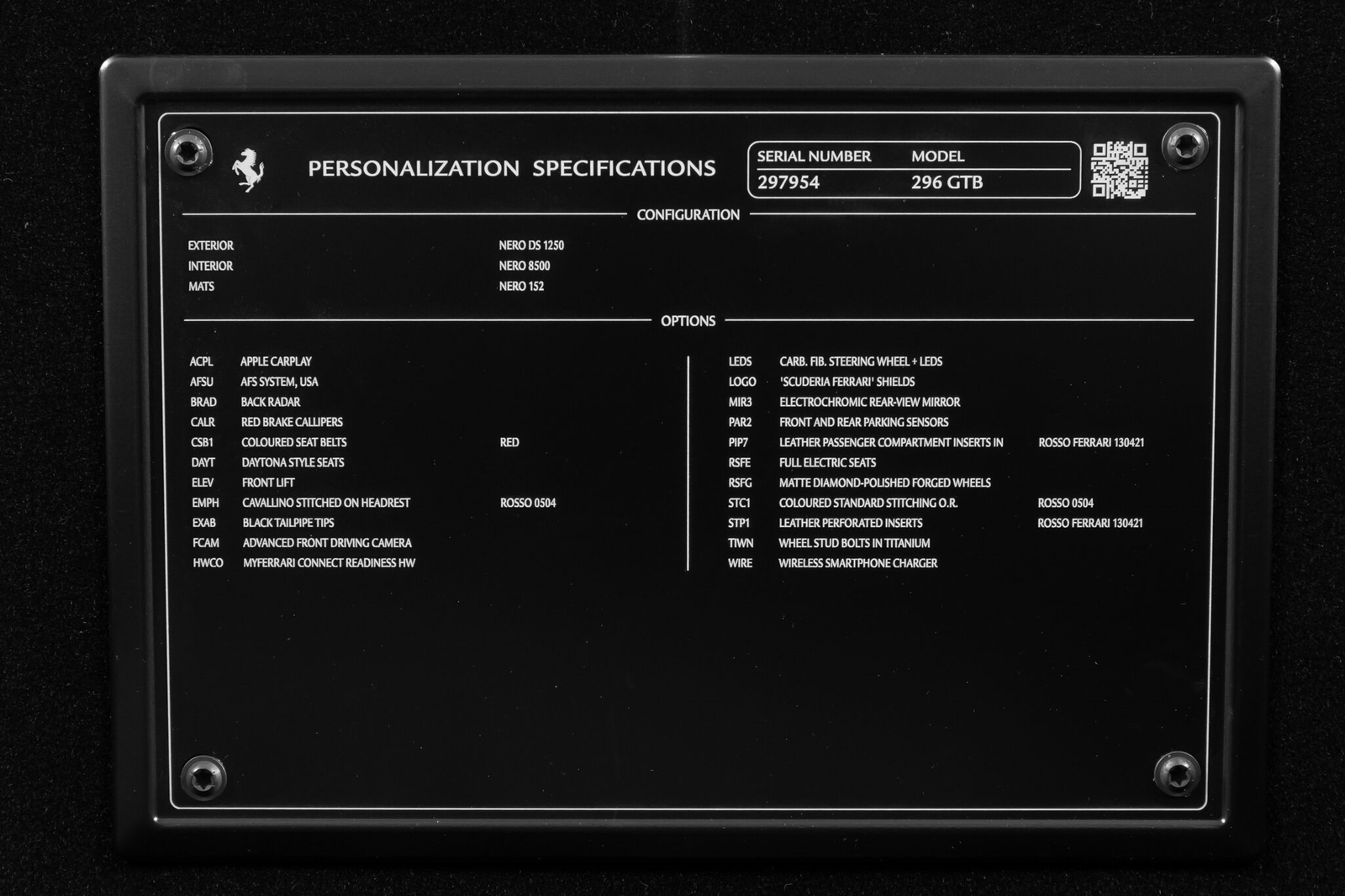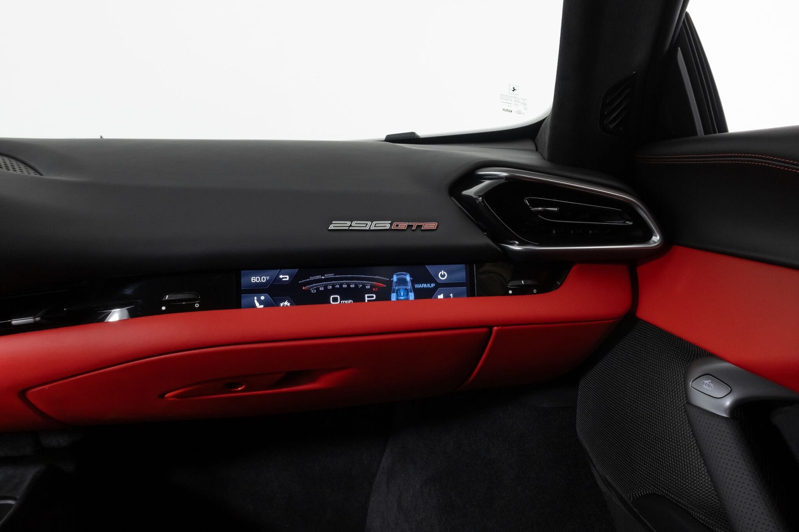 Ferrari South Bay is pleased to offer this one-owner, very low mileage 296 GTB finished in glossy Nero with Nero Leather contrasted with Rosso Leather and Stitching. Well equipped with a nice array of options, it's a road rocket that's easy to get along with; a terrific accomplice on the road or track!This 296 GTB is finished in lustrous Nero, complimented by Black Sports Exhaust Tips. Forged 20" Wheels are affixed with Titanium Wheel Studs to Carbon Ceramic Brakes sporting Rosso Corsa Calipers. Scuderia Ferrari Shields are affixed to the front fenders, reflecting the storied racing history of the Ferrari marque.The cabin is trimmed in Nero Leather with Rosso Stitching, including the Cavallinos Embroidered into headrests of the Fully Electric Daytona Style Seats. Rosso Leather accents the door panels, lower dash, and the Daytona Seats, with Rosso Corsa Seat Belts completing the theme. Blind Spot Detection with Rear Radar, combined with Front and Rear Parking Sensors help you in crowded parking lots, while the the Front Camera with Lane Departure Warning ensures safe travel on the highway. The Front and Rear Suspension Lifter makes steep driveways and other road irregularities a snap. Apple Car Play and a Wireless Charging Pad help integrate your smartphone and are welcome conveniences.This 296 GTB is offered with both original keys, hybrid charging cord, car cover, books and tools. It is covered by Ferrari's Original Factory Warranty through November 3, 2026 (and is easily extendable by two years at time of purchase). Ferrari's Genuine Maintenance Program takes care of annual services through November 3, 2030. If you'd like to know more about this wonderful 296 GTB, please reach out to one of our knowledgeable sales staff.