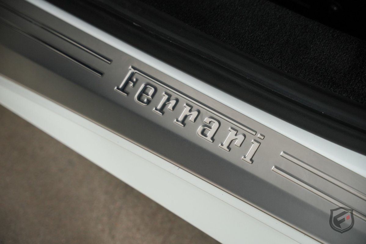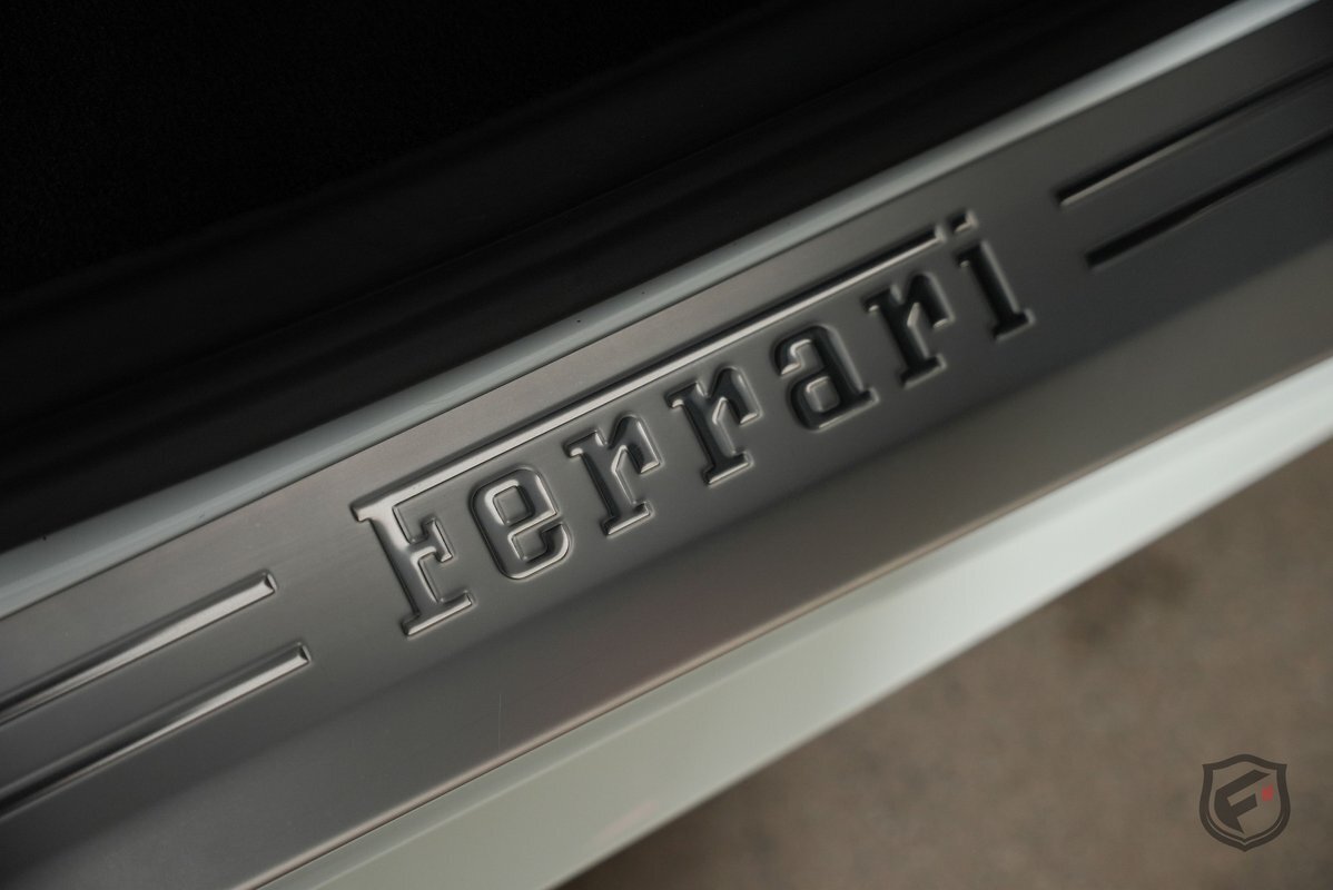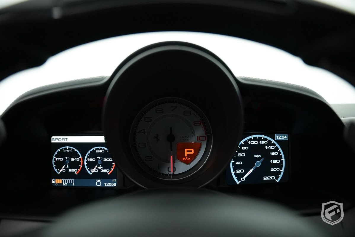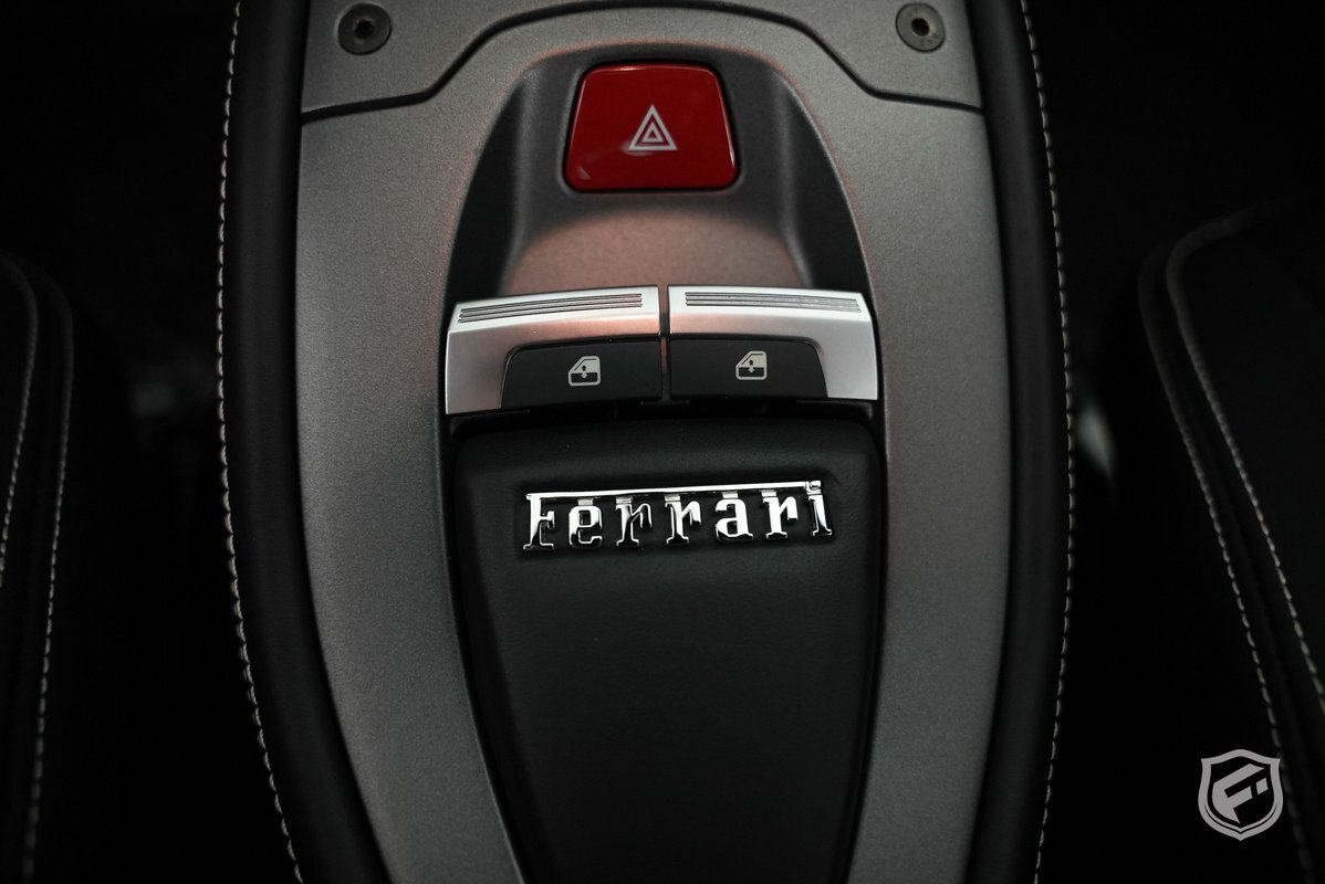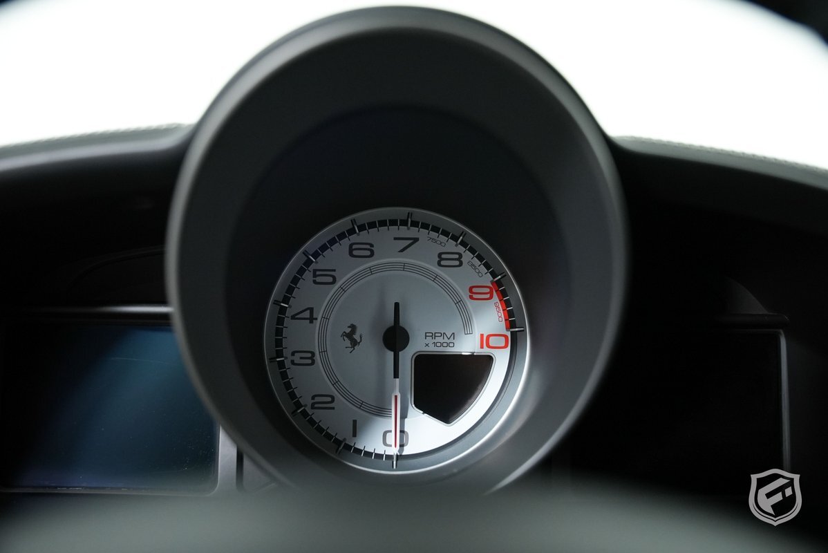 The factory wheels with the Ferrari logo center caps are wrapped in 235/35 front and 295/35 rear Pirelli P-Zero tires. The stopping power is provided by Ferrari logo calipers mounted over carbon-ceramic rotors.