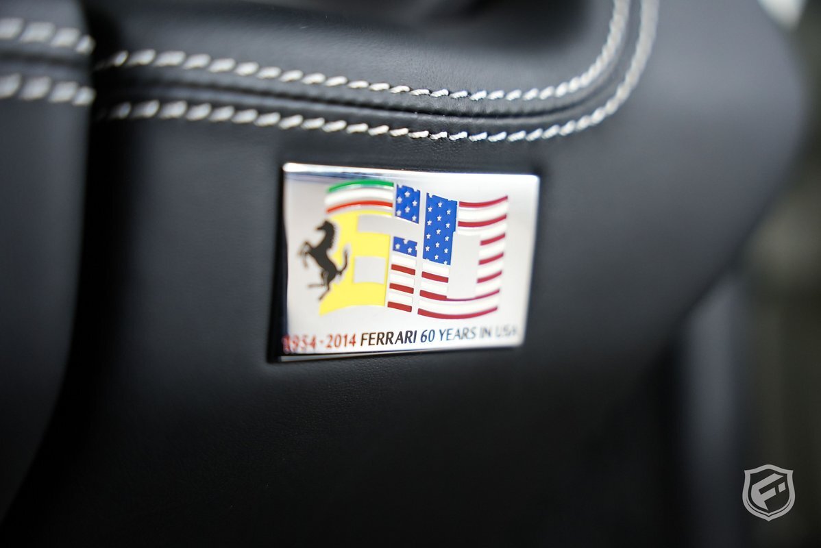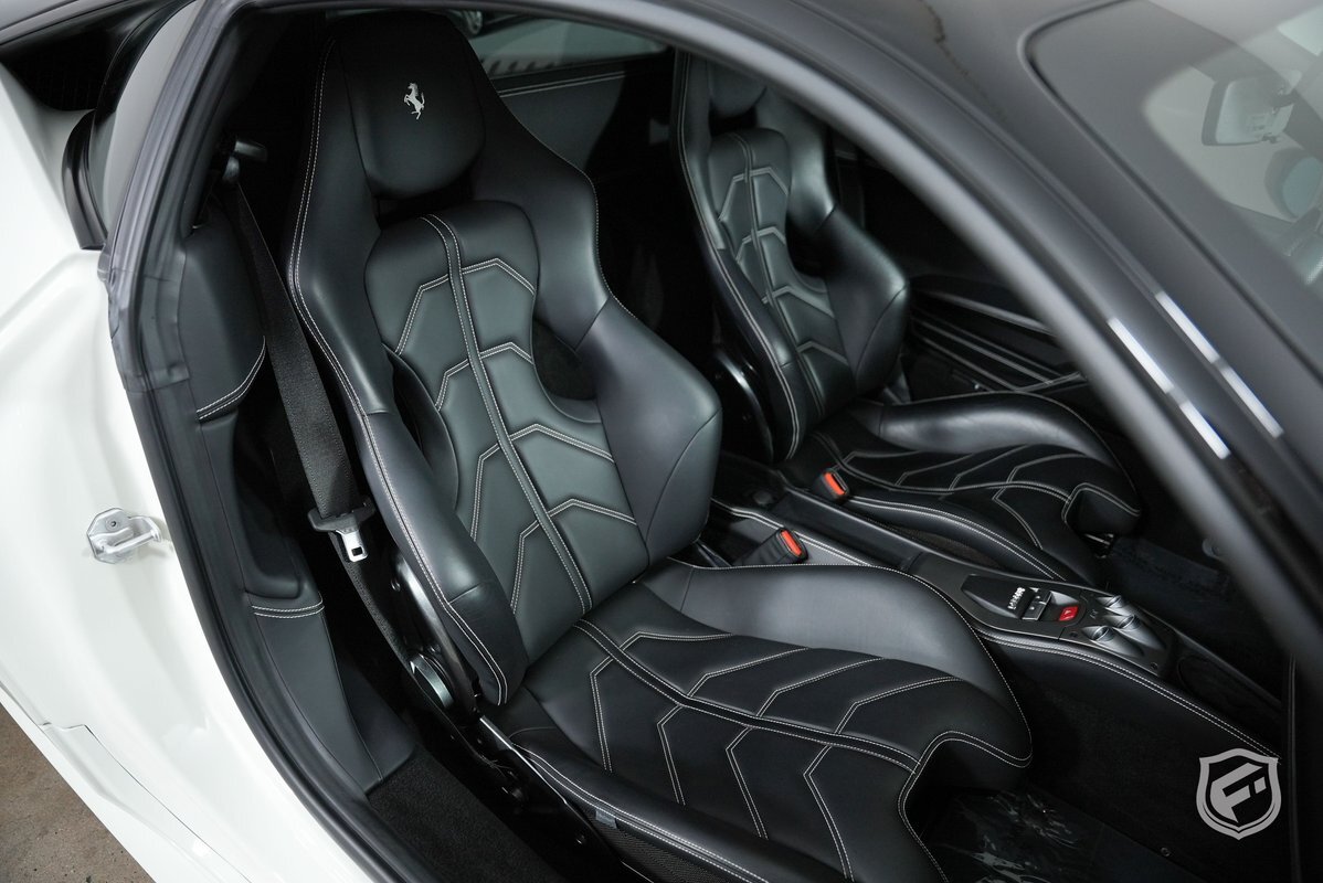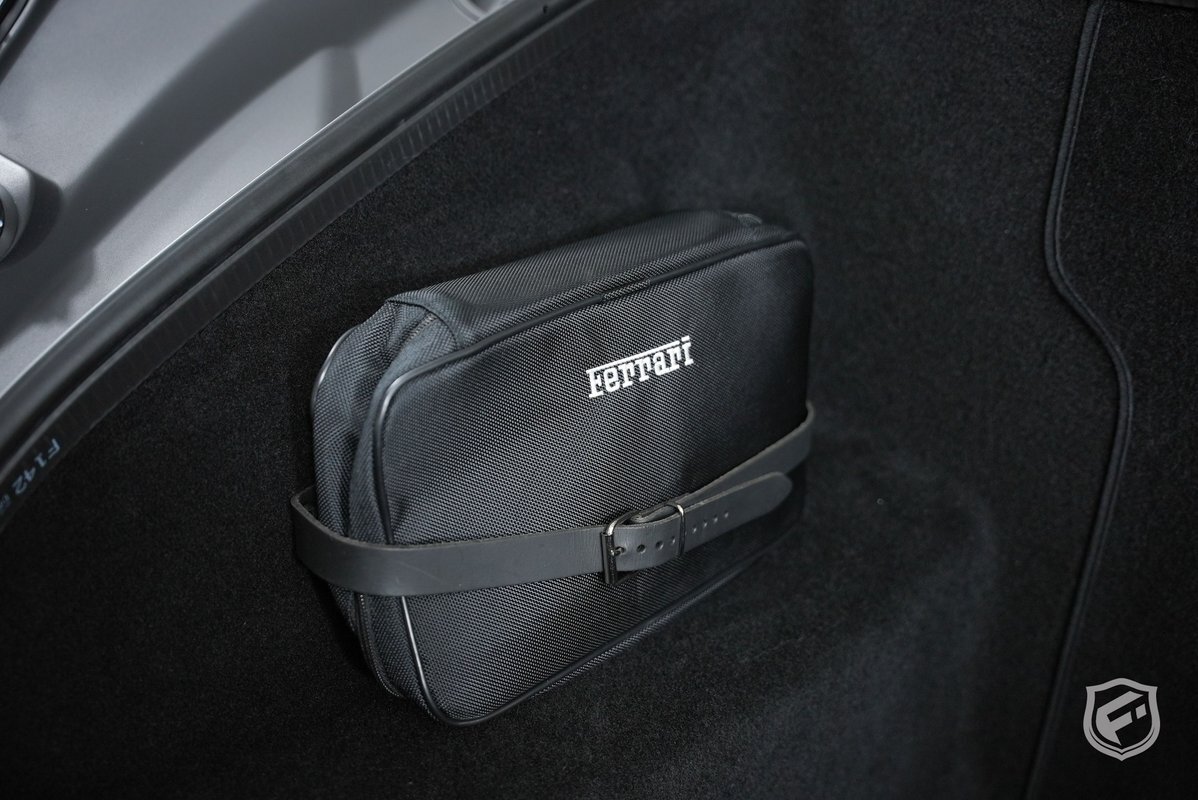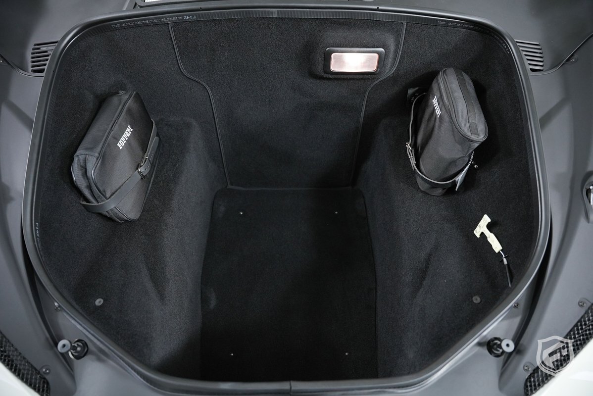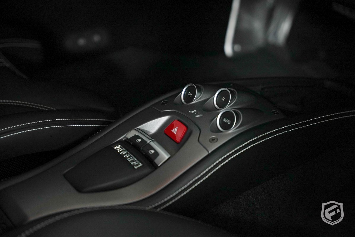 The factory wheels with the Ferrari logo center caps are wrapped in 235/35 front and 295/35 rear Pirelli P-Zero tires. The stopping power is provided by Ferrari logo calipers mounted over carbon-ceramic rotors.