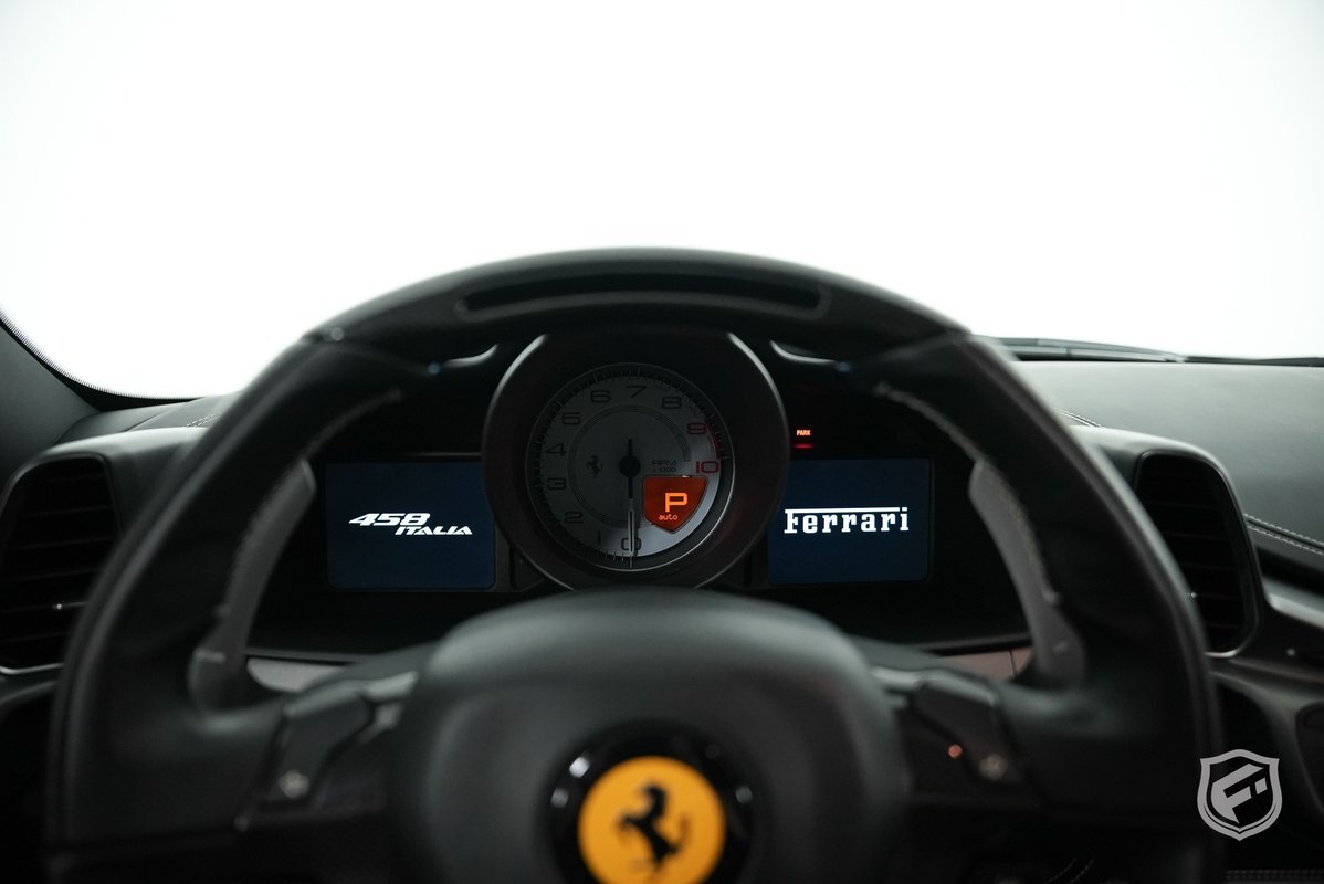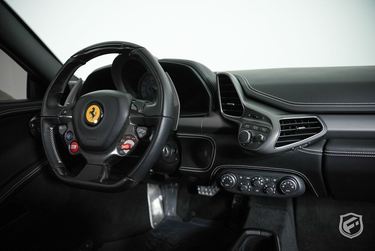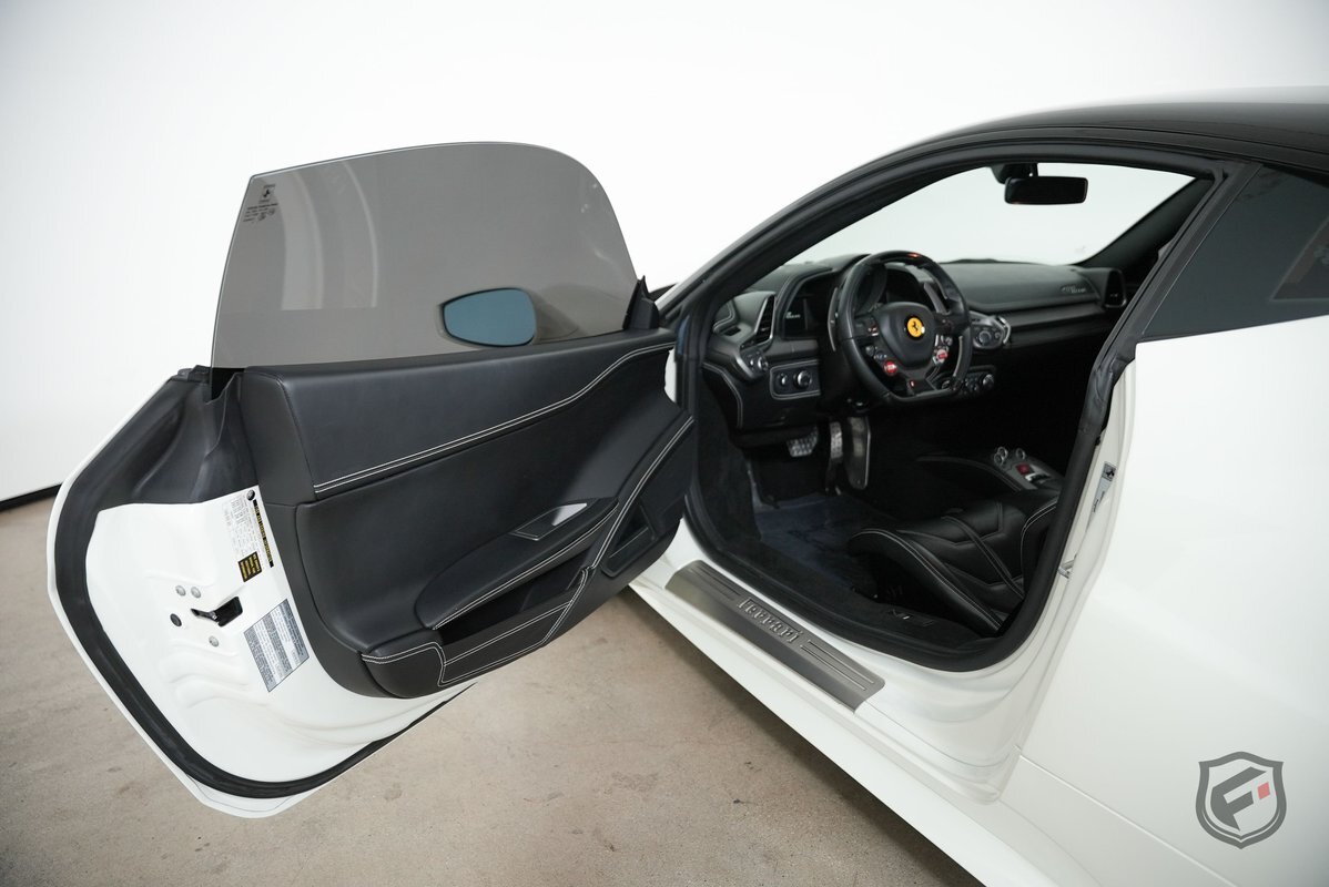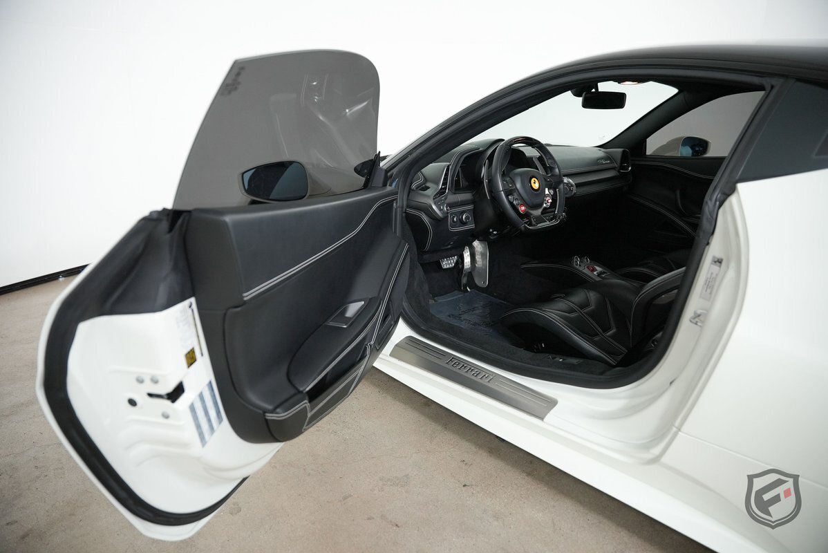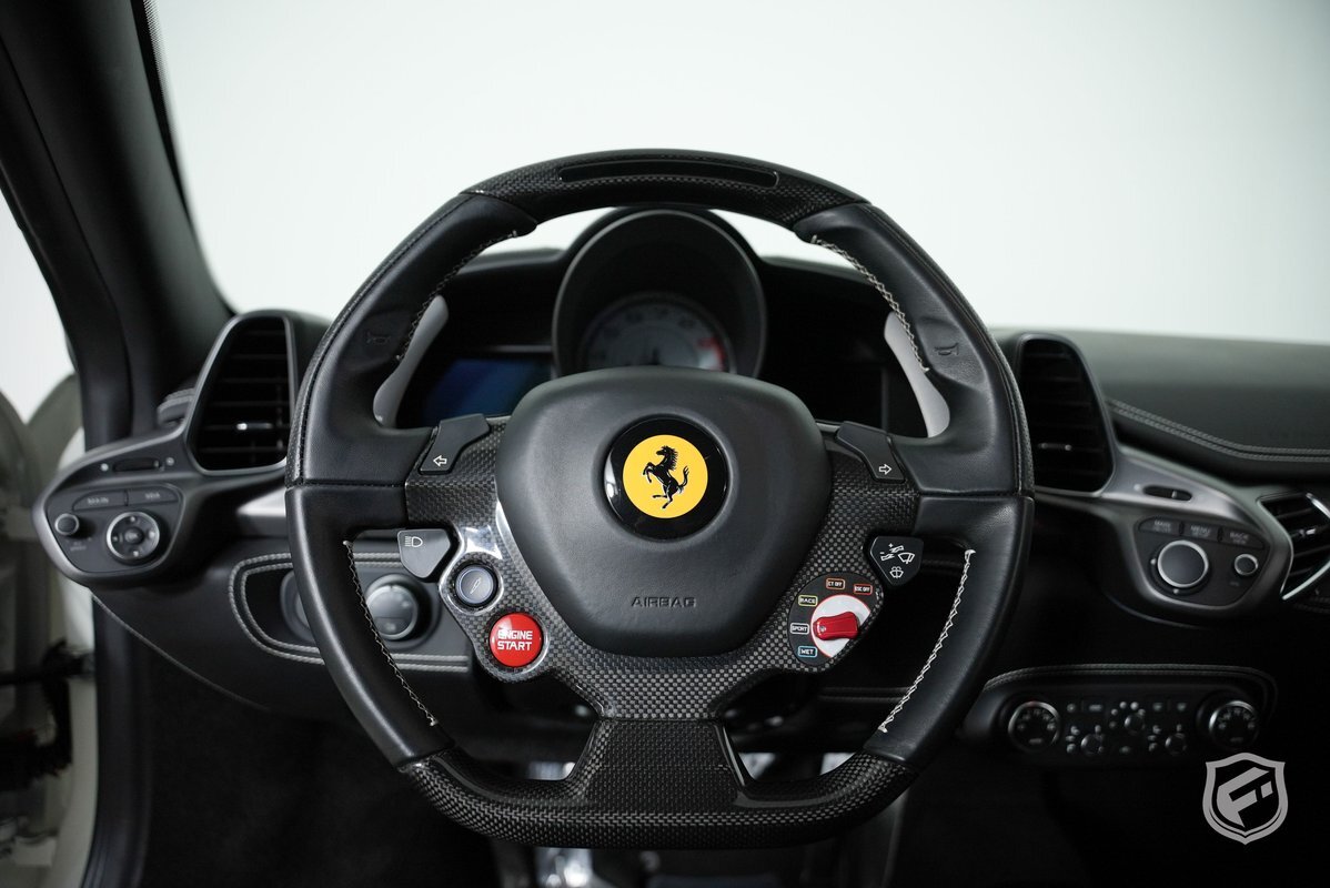 Presented is a gorgeous 2015 458 (last year of production) with Factory Two Tone Body with a Black Roof over Bianco Avus. The elegant and pristine Bianco Avus paint accentuates the car's smooth curves and dynamic lines. The interior features black leather seats with red stitching, and carbon fiber trim, providing a comfortable and luxurious driving experience.