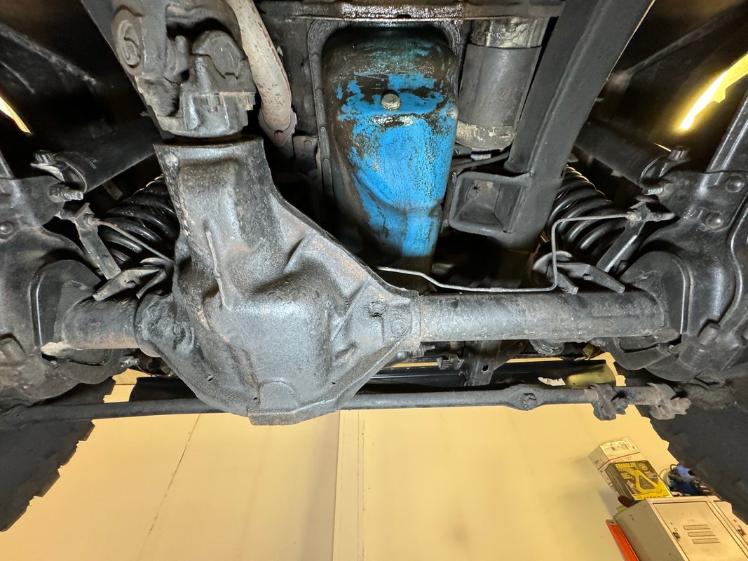 Driver quality underneath with areas of typical surface rust and some oil on the rear diff, the transmission, and the oil pan. Dual exhaust interacts with Flowmaster mufflers before heading out back. Most other surfaces underneath are black and look good with no invasive rust noted. For suspension, radius arm and coil springs up front and leaf springs in back.