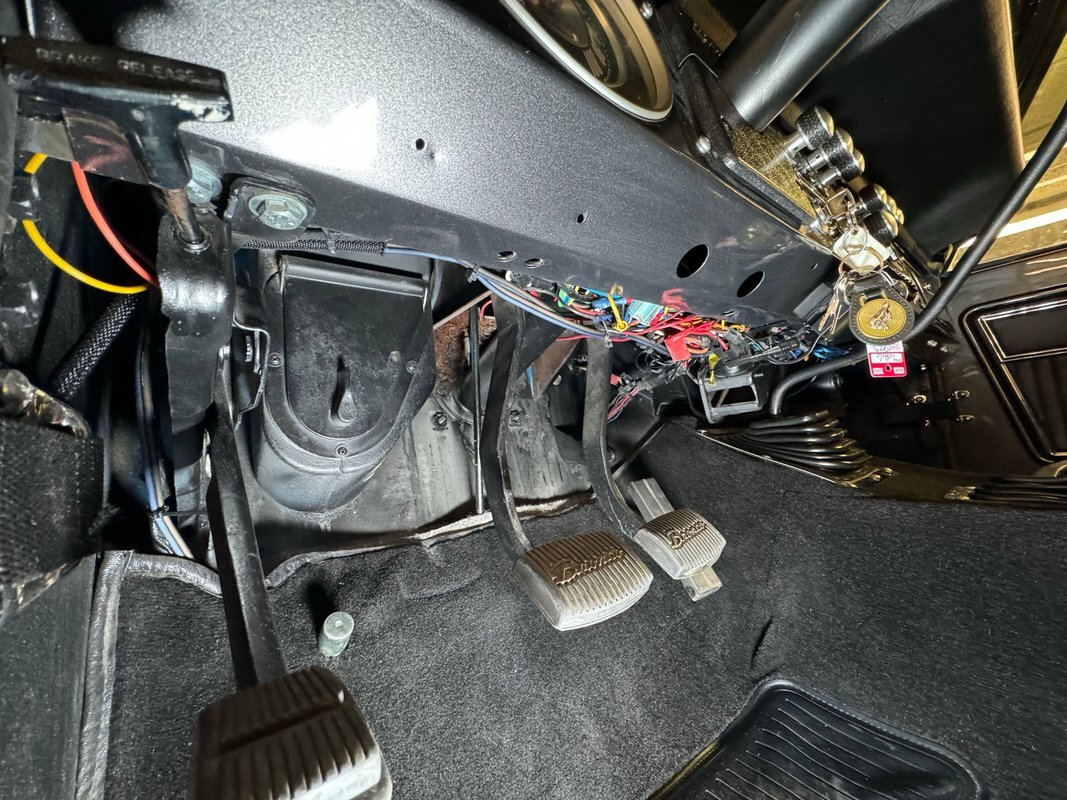 Attractive black vinyl door cards fit in the door and look factory while a speaker has been added at the base. Inside, the front bucket seats are tall and modern with good side bolstering and stitch patterned inserts. The back bench repeats the pattern but in smaller proportions and veering from the original, the bench has headrests which we're glad to see. There's a ton of legroom in the back and for kids, it's a virtual playground. The front is airy too with a gap between the seats and a dashboard that is simple and flat, topped with a padded cover and color matched to the exterior. One round gauge houses all of the pertinent information and ample billet knobs take up the right side of the column, each nicely labeled with clear text. A Kenwood AM/FM/CD unit is in the dashboard flush, just above the long stick shift that is floor mounted well forward of the dash in tandem with the range selector which is closer to the driver. Low pile black carpet covers the entire floor and as mentioned, the hardtop is new, floating just above the black roll cage that covers the back section.