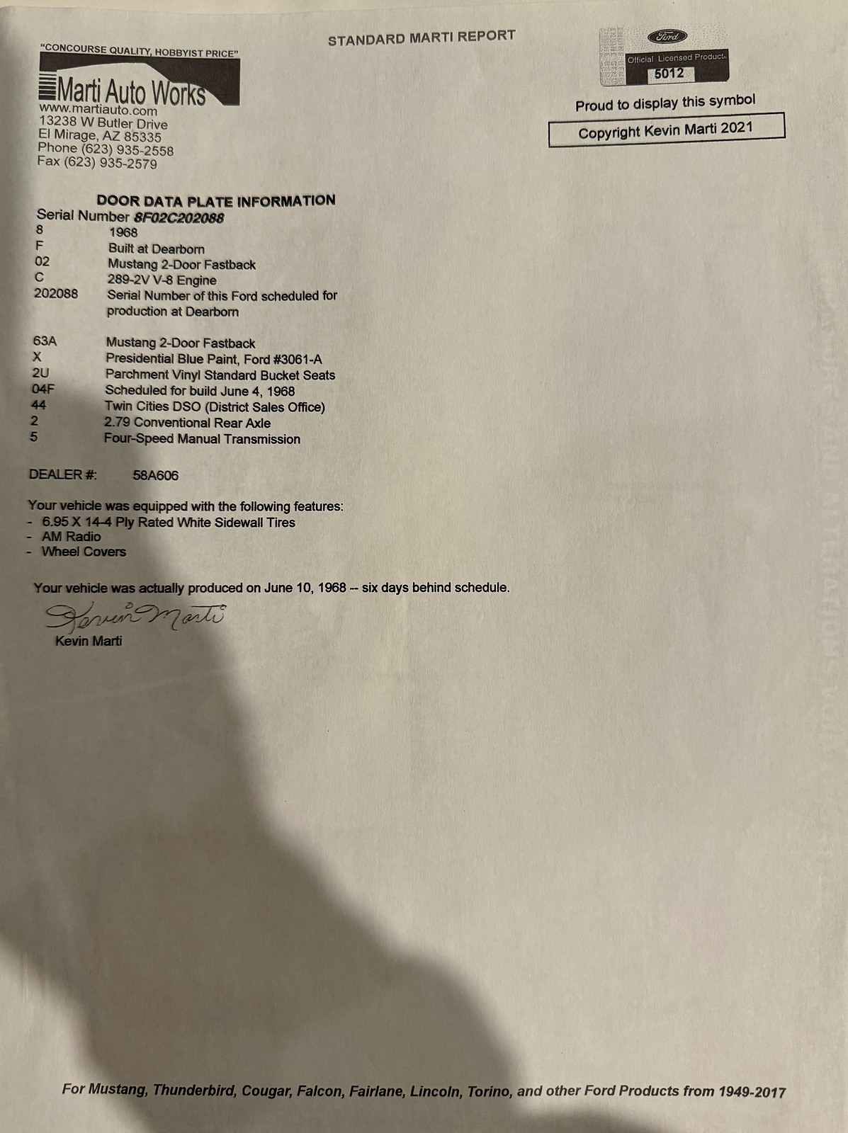 FULLY DOCUMENTED WITH MARTI REPORT AND ORIGINAL DOOR TAG