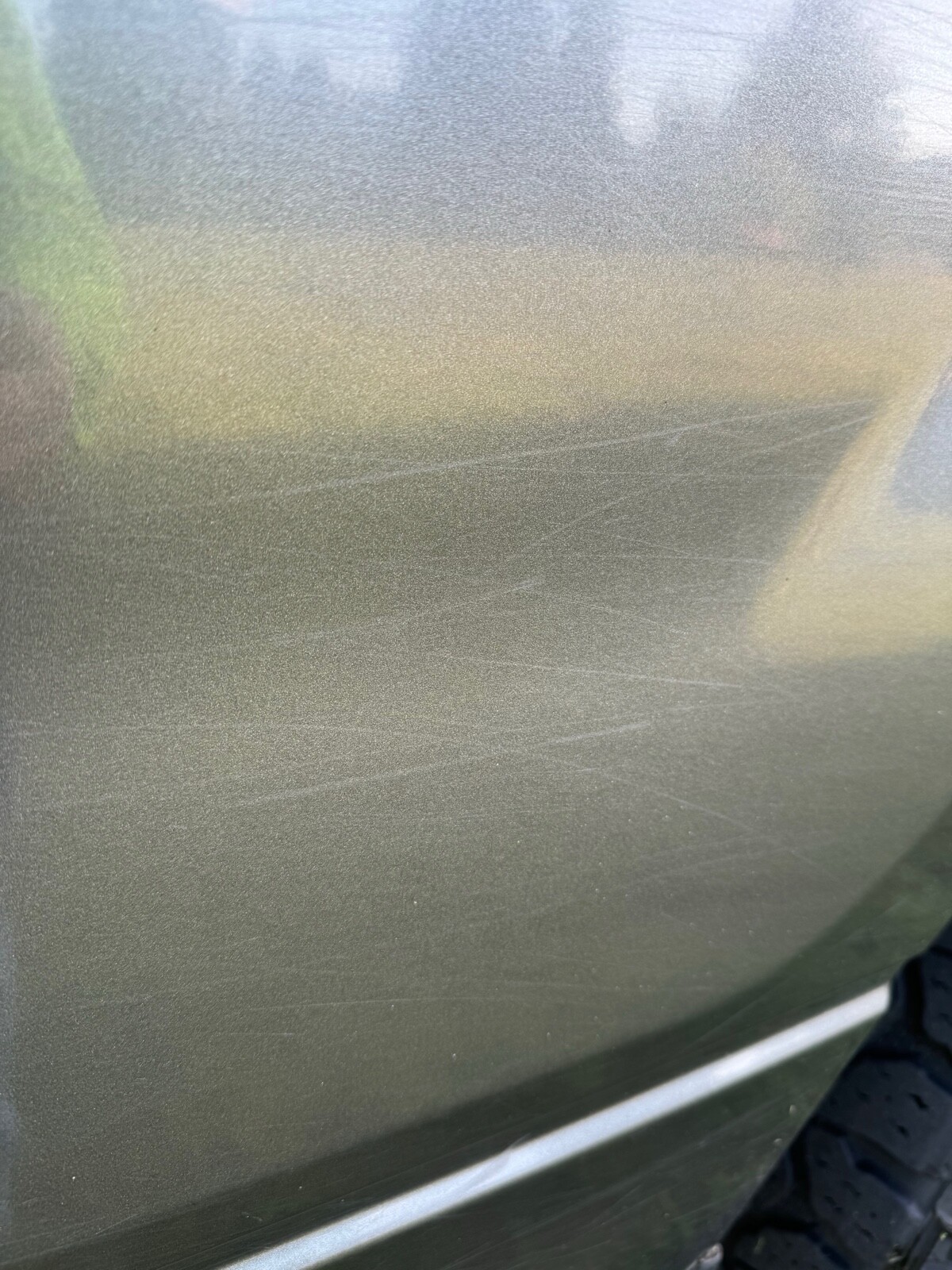 The clear coat has brush scuffs on the sides see closeup picture. There is a faint outline of the sheriff badge icon on the front doors. The tailgate has a dent on the left side. It still opens and closes.
