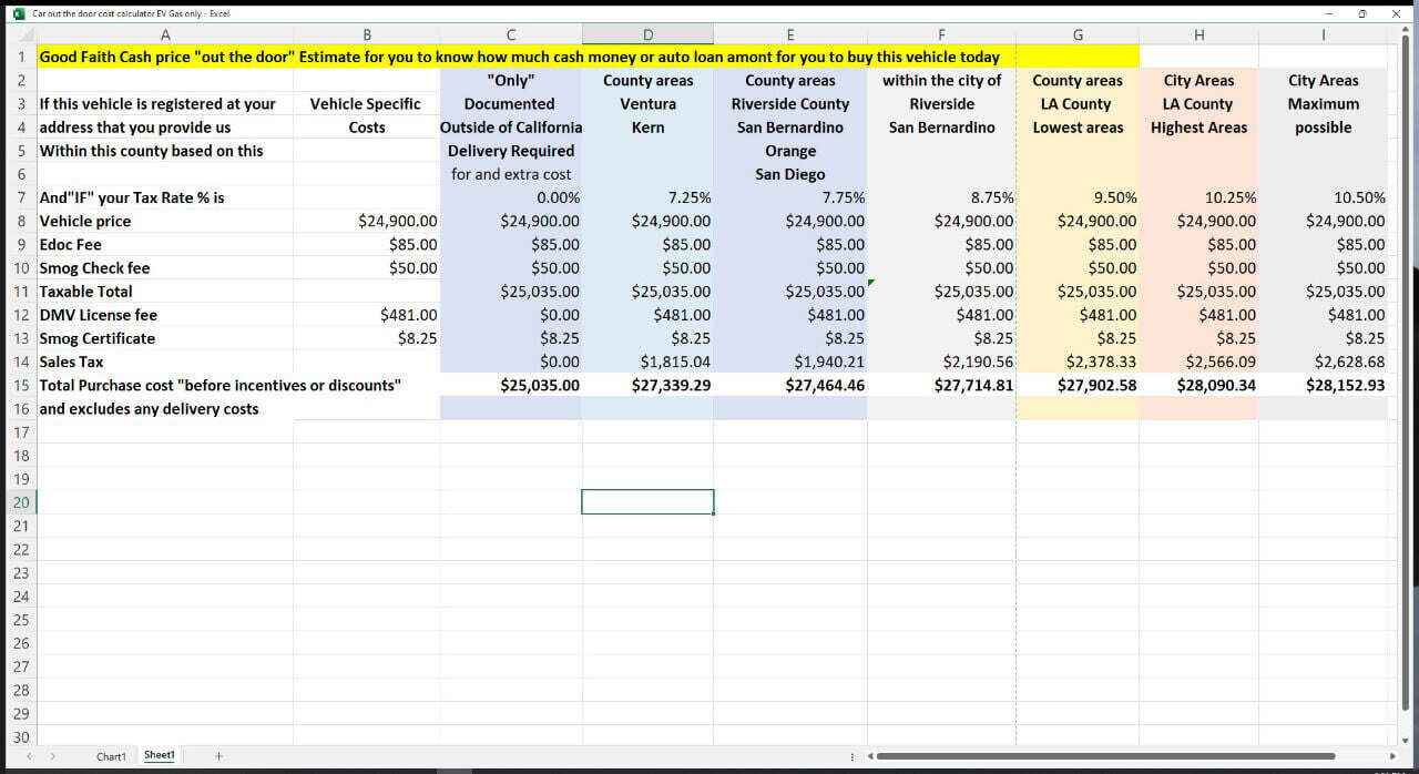 All Buyers should call the seller between 9am-7pm pacific time to ask for a Good Faith out the door cost Estimate of any and all fees based on the exact intended purchase amount and delivery intended.
