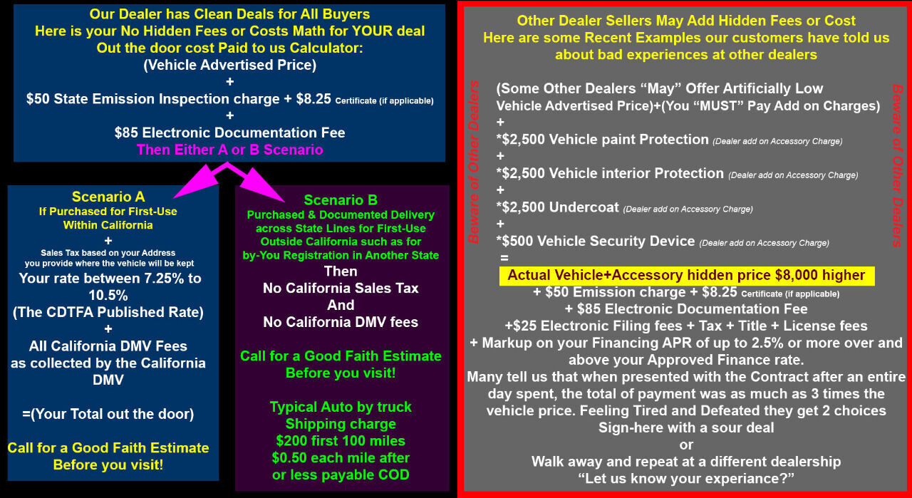 All Buyers should call the seller between 9am-7pm pacific time to ask for a Good Faith out the door cost Estimate of any and all fees based on the exact intended purchase amount and delivery intended.
