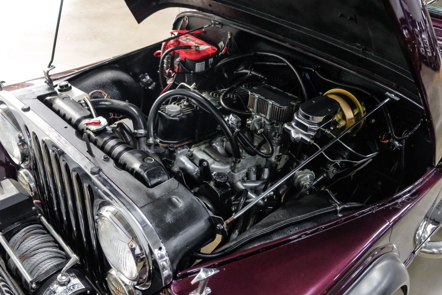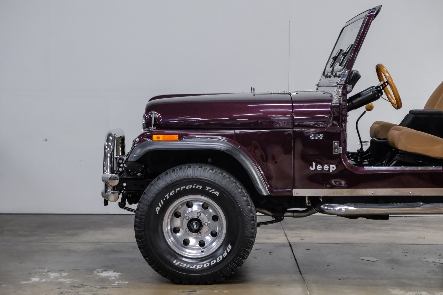 As you approach this stunning CJ-7, the deep, black cherry exterior immediately demands your attention, hinting at the untold stories and uncharted paths this vehicle is eager to explore with its next owner. The tan vinyl interior beckons you to step inside, offering a classic and comfortable vantage point from which to command this four-wheeled legend.