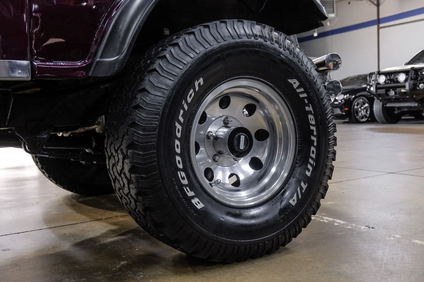 But the true spirit of this CJ-7 comes to life when the pavement ends. Equipped with a Rancho Lift and beefy BFGoodrich tires, this Jeep doesn't just handle the rough and tumble of the trails; it thrives on it. The lift kit not only adds an aggressive stance but also enhances ground clearance, allowing you to conquer obstacles and traverse rugged landscapes with confidence and ease.