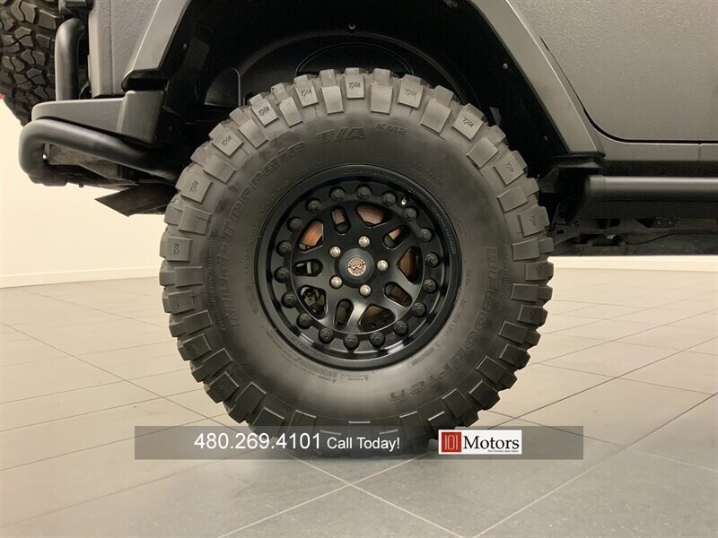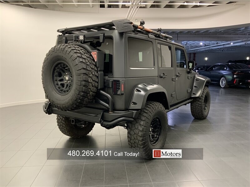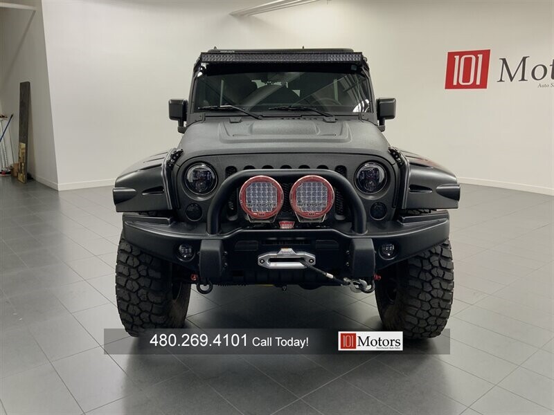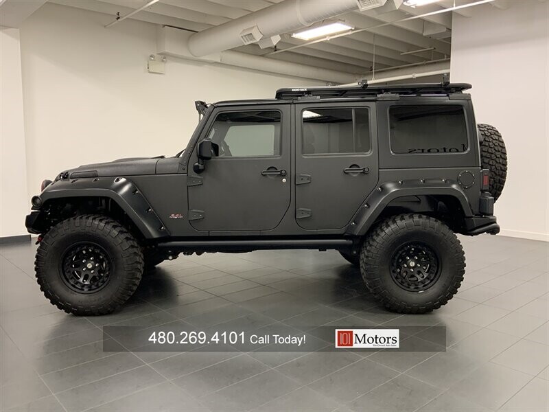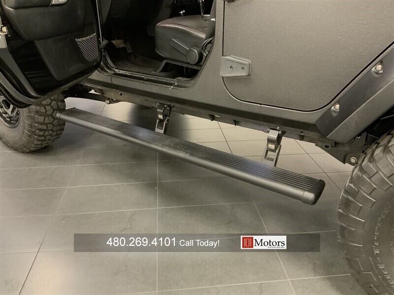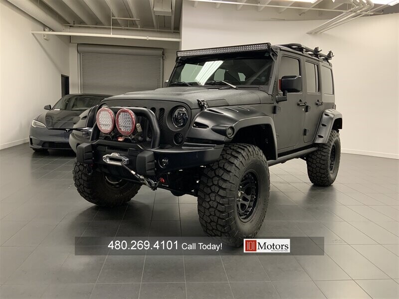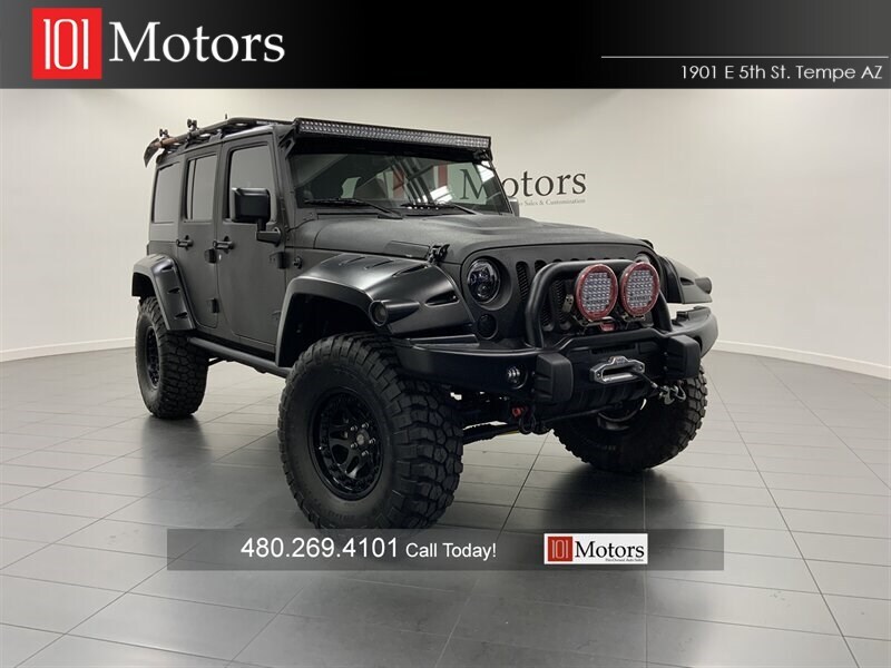 101 Motors is proud to present this stunning 2014 Jeep Wrangler Unlimited Rubicon finished with a black Line-X exterior coating. This JK was built by RubiTrux in Boone, NC and is powered by a 6.4L HEMI V8. Lifted with an 4.5 inch AEV suspension system sitting on 17 inch Hutchinson bead lock wheels wrapped in 37 inch BFG KM2 tires. This Wrangler features AEV front and rear bumpers, AMP power steps, TeraFlex big brake kit, Bushwacker fender flares, Warn winch, ARB and Rigid LED lighting, Rhino Rack roof rack, Katzkin leather interior and much more. You don’t want to miss this incredible opportunity, call today!!