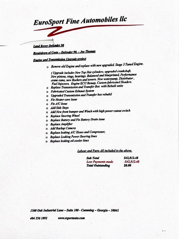 FULL HIGH RESOLUTION PHOTOS AND DETAILED DESCRIPTION ON YOU HAVE A VEHICLE YOU ARE LOOKING TO SELL, PLEASE CALL US AT 770-455-8494WE SHOW VEHICLES BY APPOINTMENT ONLY. PLEASE CALL TO SCHEDULE AN APPOINTMENT IN ORDER TO VIEW A LISTING IN PERSON.NEW ARRIVAL!! HOTROD DEFENDER WITH OVER $100KIN COSMETIC AND MECHANICAL RESOTRATION BY LRC CUSUTOMS AND EUROSPORT FINE AUTOMOBILES OVER THE RECENT FEW YEARS!!OTHER PARTS OF THE RESTO INCLUDE A SUSPENSION REFRESHMENT, REPAINT,LED LIGHTING, HEATED SEATS, 18? KAHN WHEELS, AND MUCH MORE. EXTREMELY WELL EQUIPPED LAND ROVER DEFENDER 90 NAS WITH FULL BINDER OF RECORDS AND LITERATURE! COMES WITH ORIGINAL WINDOW STICKER, MANUFACTURER'S LITERATURE, AND SERVICE RECORDS DATING BACK TO 1997!ENGINE AND TRANSMISSION UPGRADE PROJECT INCLUDES:REMOVE OLD ENGINE AND REPLACE WITH STAGE 3 TUNED ENGINENEW TOP HAT CYLINDERSUPGRADED CRANKSHAFTNEW PISTONSNEW PISTONRINGSNEW CONNECTING ROD BEARINGS/MAIN BEARINGSBALANCED AND BLUE PRINTED PERFORMANCE CRANE CAMSNEW ROCKERS AND TOWERSNEW WATER PUMPNEW DISTRIBUTORNEW FUEL INJECTORSSTAGE 3 ENGINE ECU REMAPCUSTOM FABRICATED HEADERSREBUILT TRANSMISSION AND TRANSFER CASE UPGRADED UNITSREBUILT HEATER COREREBUILT AIR CONDITIONING WITH NEW HOSES AND COMPRESSORNEW OIL COOLER LINESNEW POWER STEERING LINESAND MORE.EXTERIOR IS FINISHED IN SANTORINI BLACK WITH BLACK QUILTED LEATHER INTERIOR.FEATURES INCLUDE:TOP HAT STAGE 3V8 ENGINEFOUR-SPEED AUTOMATIC TRANSMISSION PERMANENT 4 WHEEL DRIVESMITTYBILT XRC WINCH18 KAHN WHEELSLED EXTERIOR LIGHTINGBLACK QUILTED LEATHERHEATED FRONT SEATSPOWER WINDOWS AND LOCKSKAHN CHELSEA TRUCK COMPANY STEERING WHEELSUEDE HEADLINERPUMA HOODTDCI-STYLE SIDE AND REAR DOORS WITH PUSH-BUTTON HANDLESBFGOODRICH ALL TERRAIN T/A K02 TIRESDYNAMAT SOUND DAMPENINGVIPER ALARM SYSTEM W/ KEYLESS ENTRY AND REMOTE STARTALPINE STEREOBLUETOOTHREVERSE CAMERAFUEL PUMP AND FUEL RAIL PRESSURE VALVE REPLACED IN 2018REFURBISHED FACTORY RUNNING GEAR IN 2018NEW DIGITAL ODOMETER (ORIGINAL ODOMETER INCLUDED)FOX RACING SHOCKSREPLACEMENT SPRINGS, BUSHINGS, RADIUS ARMS, AND BRAKE LINESAND MUCH MORE.GAS MOTORCARS IS A FAMILY OWNED AND OPERATED CAR DEALERSHIP LOCATED IN MARIETTA, GA. WE ONLY SELL VEHICLES OF THE HIGHEST QUALITY. WE SHIP VEHICLES WORLDWIDE AT THE BUYER'S EXPENSE. WE TAKE CONSIGNMENTS AS WELL AS TRADES.WE SHOW VEHICLES BY APPOINTMENT ONLY.PLEASE CALL AHEAD TO SCHEDULE A DATE AND TIME IN ORDER TO VIEW A LISTING IN PERSON.CONNECT WITH US ON INSTAGRAM @GASMOTORCARSIt is the customers sole responsibility to verify the existence and condition of any equipment listed. Neither the dealership nor DealerCarSearch is responsible for misprints on prices or equipment. It is the customers sole responsibility to verify the accuracy of the prices with the dealer, including the pricing for all added accessories. Visit Gas Motorcars online at to see more pictures of this vehicle or call us at770-455-8494 today to schedule your test drive.