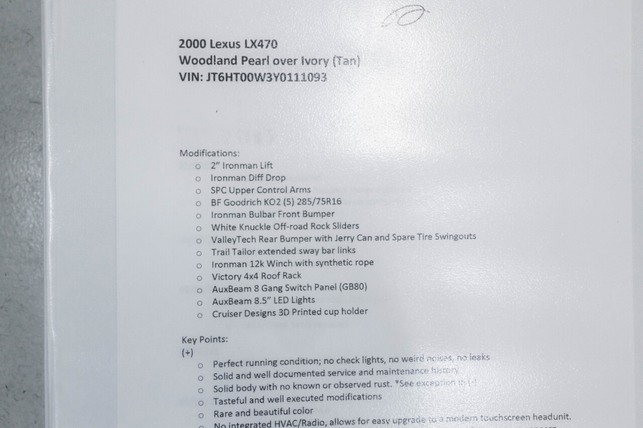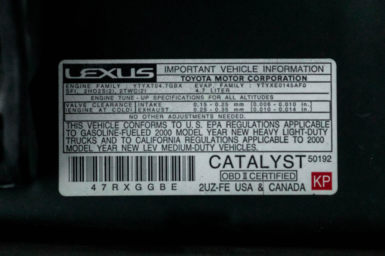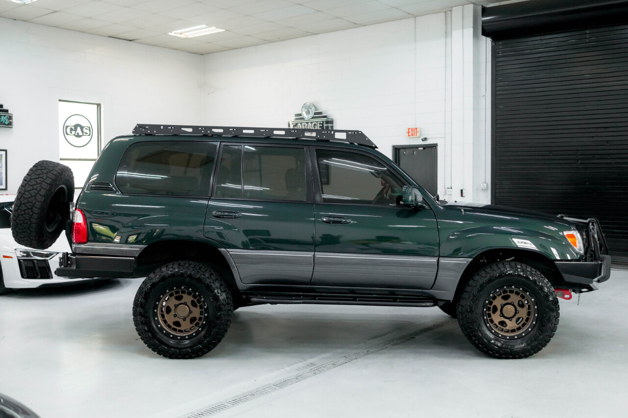 FULL HIGH RESOLUTION PHOTOS AND DETAILED DESCRIPTION ON YOU HAVE A VEHICLE YOU ARE LOOKING TO SELL, PLEASE CALL US AT 770-769-1398WE SHOW VEHICLES BY APPOINTMENT ONLY. PLEASE CALL TO SCHEDULE AN APPOINTMENT IN ORDER TO VIEW A LISTING IN PERSON.NEW ARRIVAL!! TIMING BELT AND WATER PUMP DONE ROUGHLY 30K MILES AGO!!OVER $20K IN UPGRADES AND RECENT MAINTENANCE! ULTRA RARE AND COLLECTIBLE TURN-KEY LEXUS LX470 IN WOODLAND GREEN PEARL OVER TAN INTERIOR!ENTHUSIASTOWNED, VERY WELL MAINTAINED. FANTASTIC DRIVING TRUCK, READY TO GO. COMES WITH TWO KEYS AND BINDER FULL OF SERVICE RECORDS.EXTERIOR IS FINISHED INWOODLAND GREEN PEARL OVER TAN LEATHER INTERIOR.NON-FACTORY UPGRADES INCLUDE:2 IRON MAN LIFTIRON MAN DIFFERENTIAL DROPSPC UPPER CONTROL ARMSBF GOODRICH KO2 TIRESIRON MAN BULLBAR FRONT BUMPERWHITE KNUCKLE OFF ROAD ROCK SLIDERSVALLEYTECH REAR BUMPER WITH SPARE TIRE SWINGOUTSTRAILER EXTENDED SWAY BAR LINKSIRON MAN 12K LB WINCH AND SYNTHETIC ROPEVICTORY 4X4 ROOF RACKALUBEAM GANG SWITCH PANEL AND LED LIGHTSTOUCH SCREEN RADIO HEAD UNIT WITH BACKUP CAMERAFACTORY OPTIONS AND FEATURES INCLUDE:4.7L V8 ENGINE4-SPEED AUTOMATIC TRANSMISSION4 WHEEL DRIVEPOWER ADJUSTABLE HEATED FRONT SEATSLEATHER TRIM PACKAGELEATHER FACED SEATING MATERIAL & HEAD RESTSLEATHER WRAPPED STEERING WHEELLEATHER WRAPPED WOODEN SHIFT KNOBTHIRD SEAT PACKAGE50/50 SPLIT FOLDING & REMOVABLE REAR SEAT WITH OUTBOARD HEADRESTSREAR CUPHOLDERS & ASSIST GRIPSPOWER TILT/SLIDE MOONROOFCONVENIENCE PACKAGEREAR WIND DEFLECTORROOF RACKCRUISE CONTROLREMOTE ENTRYAND MUCH MORE.GAS MOTORCARS IS A FAMILY OWNED AND OPERATED CAR DEALERSHIP LOCATED IN MARIETTA, GA. WE ONLY SELL VEHICLES OF THE HIGHEST QUALITY. WE SHIP VEHICLES WORLDWIDE AT THE BUYER'S EXPENSE. WE TAKE CONSIGNMENTS AS WELL AS TRADES.WE SHOW VEHICLES BY APPOINTMENT ONLY.PLEASE CALL AHEAD TO SCHEDULE A DATE AND TIME IN ORDER TO VIEW A LISTING IN PERSON.CONNECT WITH US ON INSTAGRAM @GASMOTORCARSIt is the customers sole responsibility to verify the existence and condition of any equipment listed. Neither the dealership nor Dealer Socket is responsible for misprints on prices or equipment. It is the customers sole responsibility to verify the accuracy of the prices with the dealer, including the pricing for all added accessories. Visit Gas Motorcars online at to see more pictures of this vehicle or call us at770-769-1398 today to schedule your test drive.