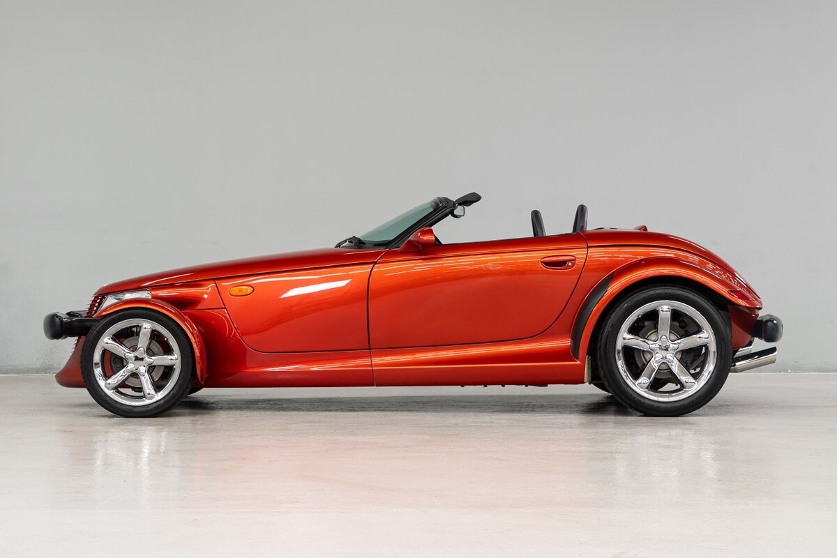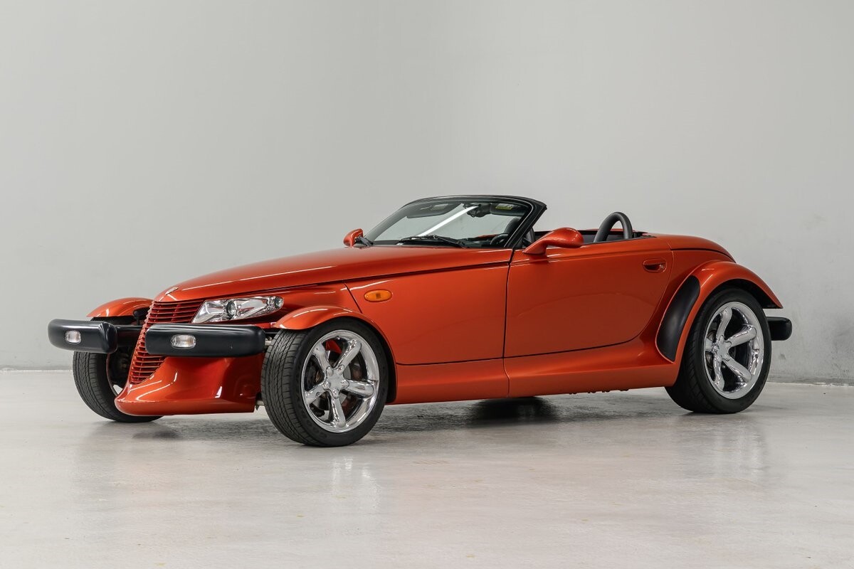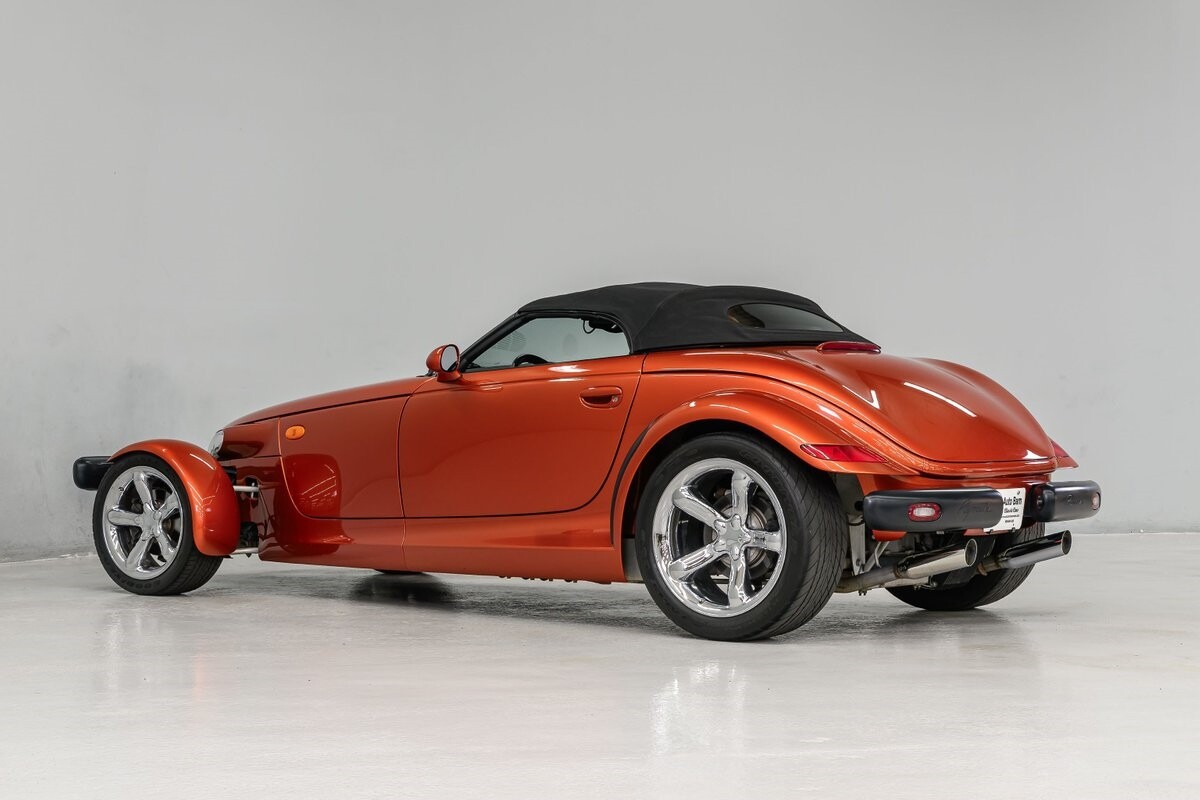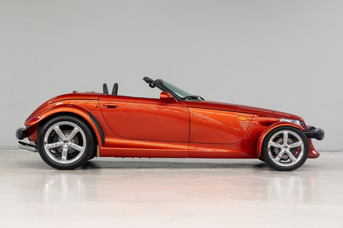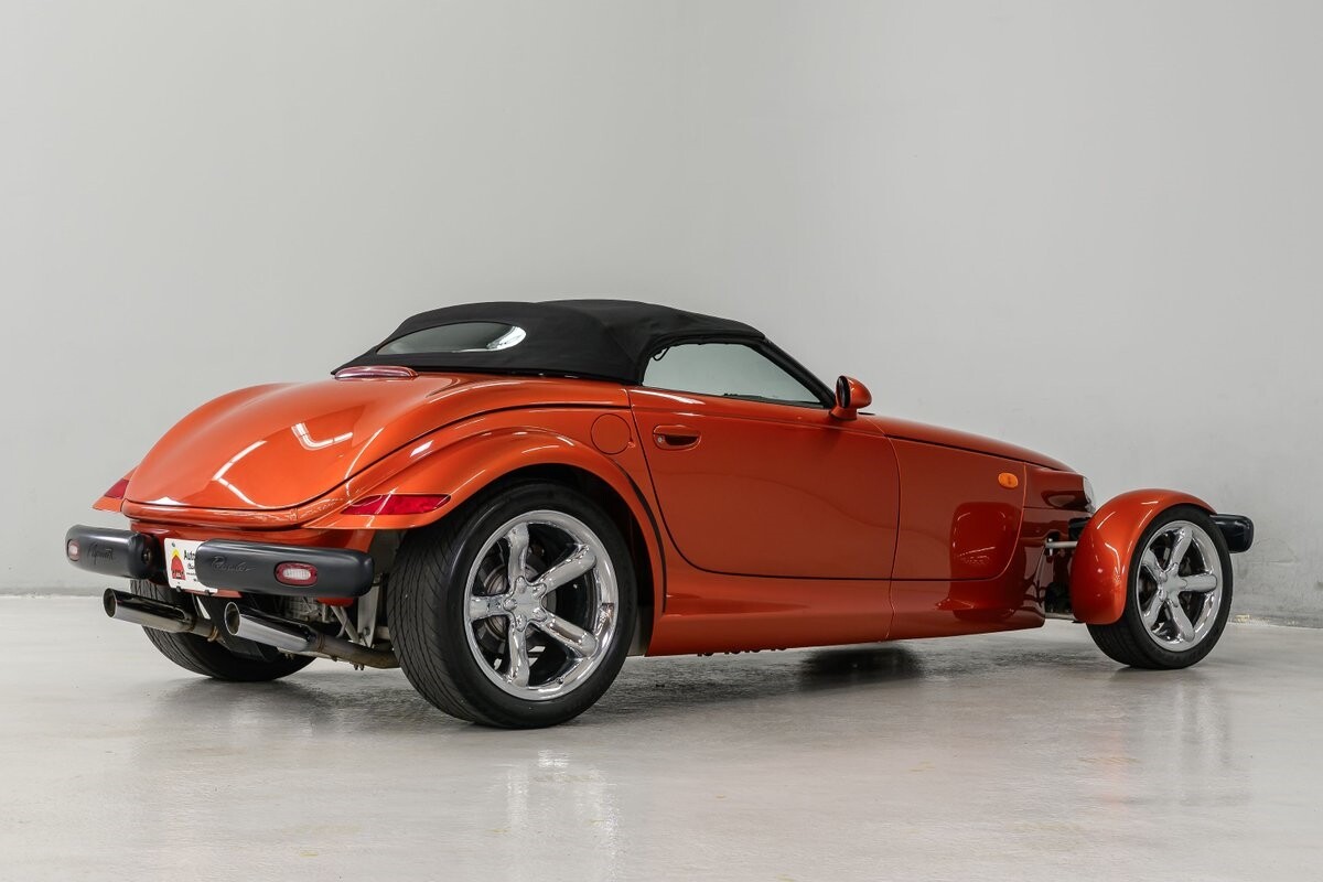 The Prowler was Chrysler's retro-styled production car based on the 1993 concept car of the same name. It was manufactured and marketed by Plymouth/Chrysler from 1997 until 2002. The Prowler's front-engine and rear-transaxle configuration facilitated an almost perfect 50-50 front-rear weight distribution. Originally conceived and designed as a coupe by car designer Chip Foose, it was modified to be a roadster for production. Featuring predominately aluminum construction, Prowlers were assembled by hand at Chrysler's CAAP Detroit facility. This unique performance car is powered by Chrysler's SOHC 3.5L 24-V fuel-injected engine. The aluminum V-6 produces 253bhp at 6400 RPM, more than enough to propel this lightweight roadster. Its semi-automatic 4-speed/OD 'Autostick' transaxle can be driven as an automatic or shifted manually. This 2001 Plymouth Prowler has been with its current owner for the last eight years and has been carefully maintained. The Sunset Orange exterior is in outstanding condition with factory alloy-spoke wheels sport Goodyear performance radials. The Black leather interior and manually operated fabric convertible top (w/glass window) are also in very good condition. Features include A/C, power tinted windows, power locks, tilt wheel and premium AM/FM/cassette sound system. The roadster's strong, lightweight aluminum chassis is equipped with power steering and 4-wheel power disc brakes. The Plymouth Prowler is a modern-day 'deuce roadster' that is comfortable, fun to drive and dependable. ALL VEHICLES SOLD "AS IS."