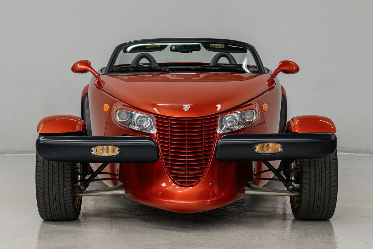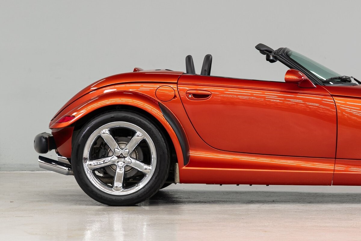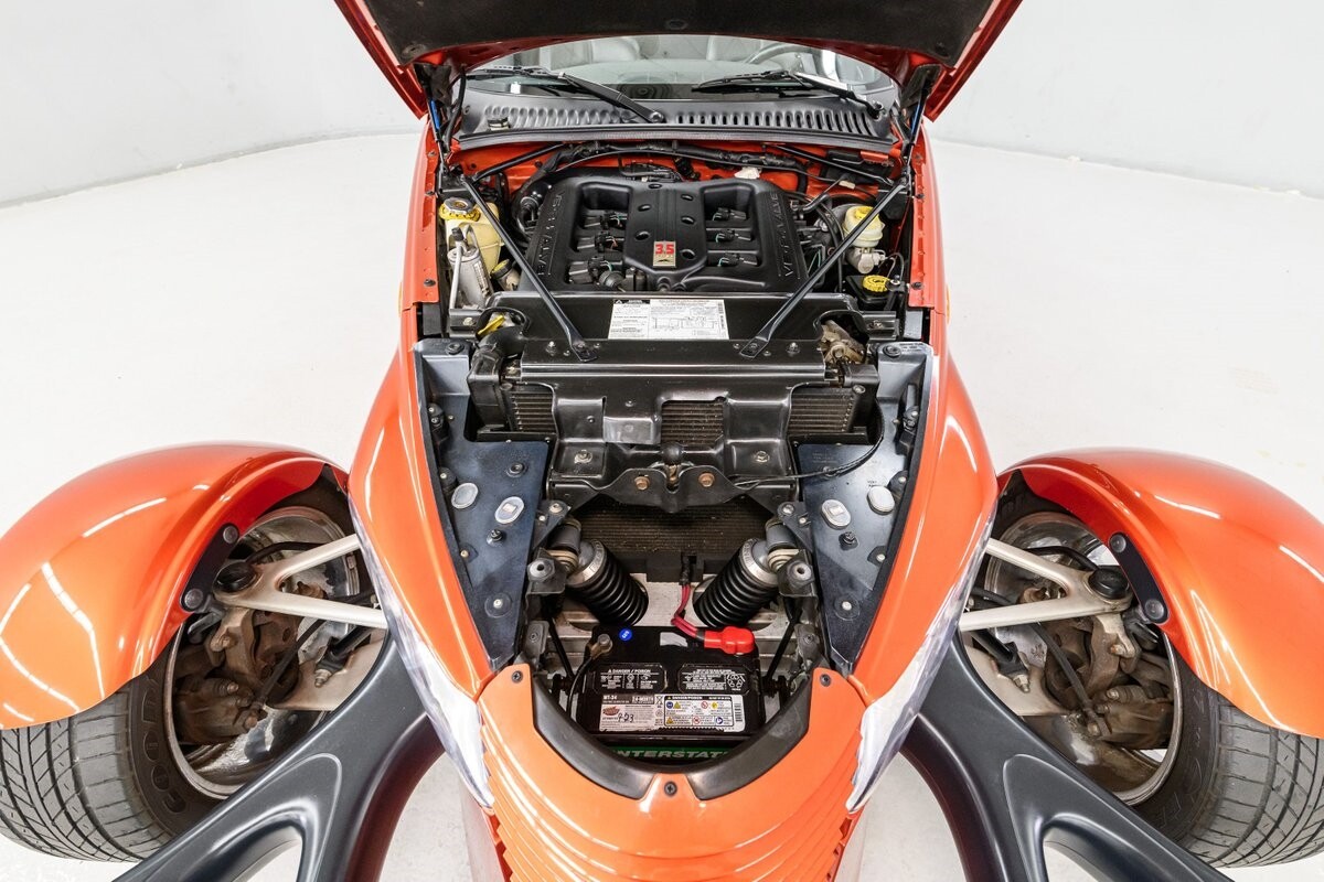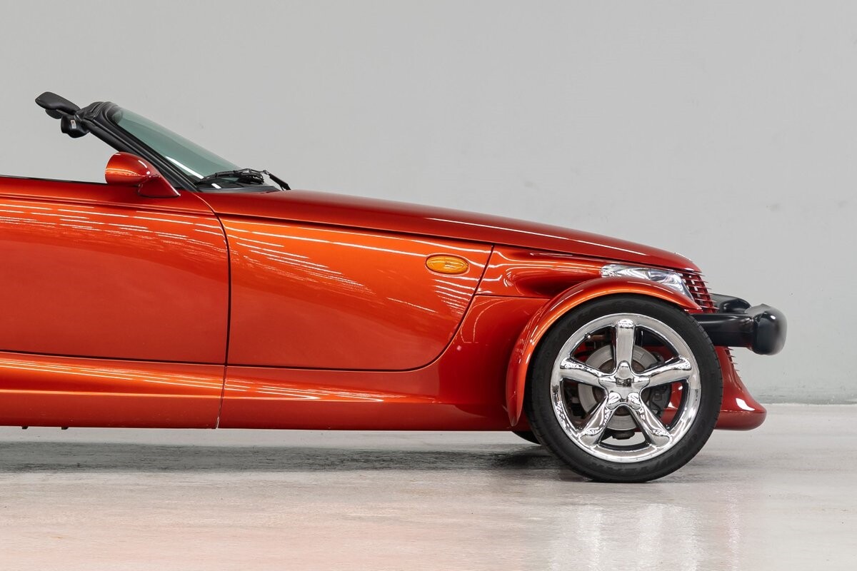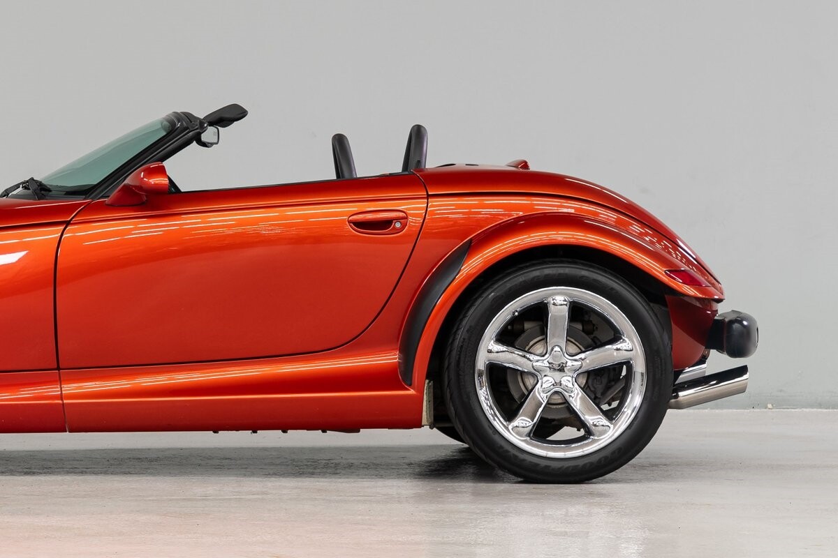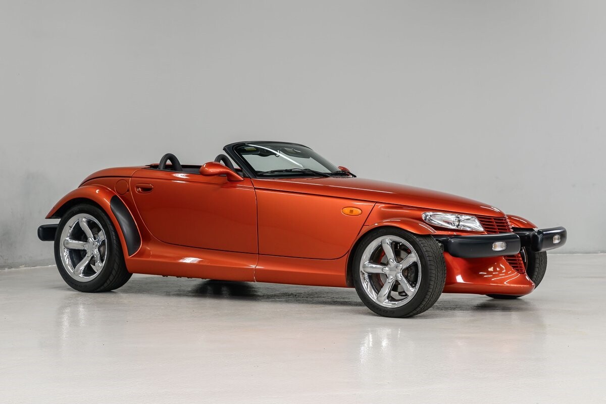 The Prowler was Chrysler's retro-styled production car based on the 1993 concept car of the same name. It was manufactured and marketed by Plymouth/Chrysler from 1997 until 2002. The Prowler's front-engine and rear-transaxle configuration facilitated an almost perfect 50-50 front-rear weight distribution. Originally conceived and designed as a coupe by car designer Chip Foose, it was modified to be a roadster for production. Featuring predominately aluminum construction, Prowlers were assembled by hand at Chrysler's CAAP Detroit facility. This unique performance car is powered by Chrysler's SOHC 3.5L 24-V fuel-injected engine. The aluminum V-6 produces 253bhp at 6400 RPM, more than enough to propel this lightweight roadster. Its semi-automatic 4-speed/OD 'Autostick' transaxle can be driven as an automatic or shifted manually. This 2001 Plymouth Prowler has been with its current owner for the last eight years and has been carefully maintained. The Sunset Orange exterior is in outstanding condition with factory alloy-spoke wheels sport Goodyear performance radials. The Black leather interior and manually operated fabric convertible top (w/glass window) are also in very good condition. Features include A/C, power tinted windows, power locks, tilt wheel and premium AM/FM/cassette sound system. The roadster's strong, lightweight aluminum chassis is equipped with power steering and 4-wheel power disc brakes. The Plymouth Prowler is a modern-day 'deuce roadster' that is comfortable, fun to drive and dependable. ALL VEHICLES SOLD "AS IS."