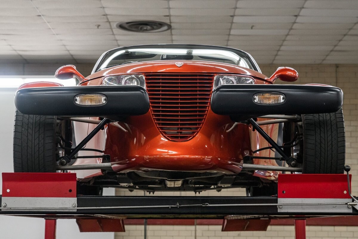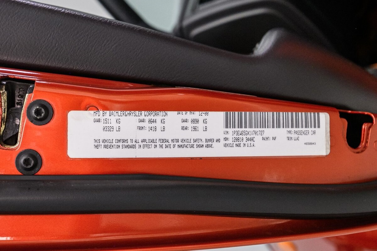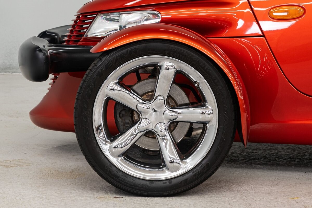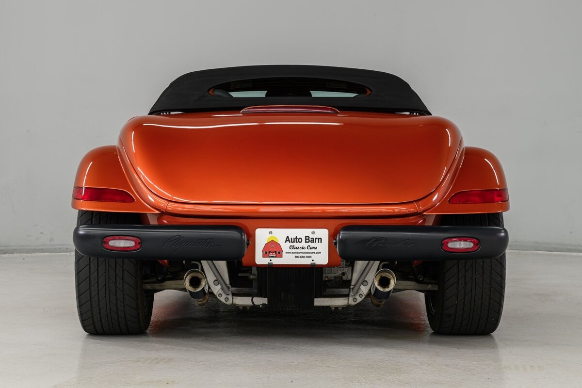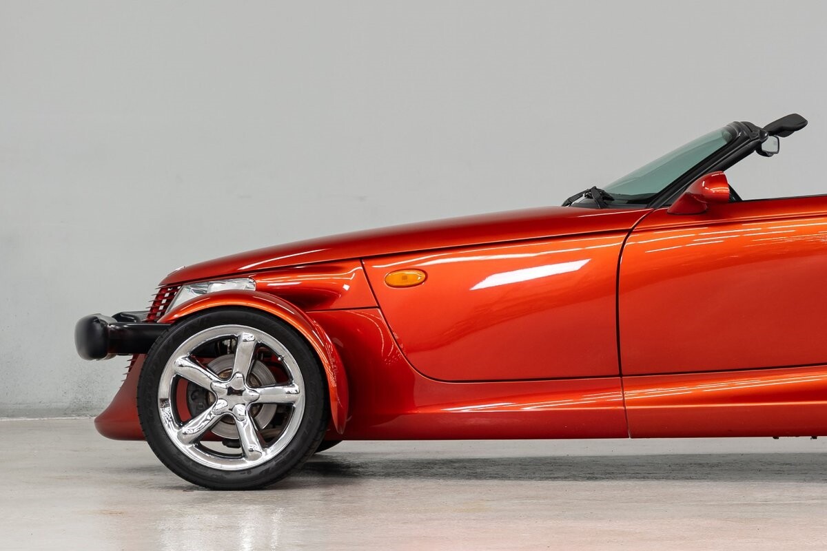 The Prowler was Chrysler's retro-styled production car based on the 1993 concept car of the same name. It was manufactured and marketed by Plymouth/Chrysler from 1997 until 2002. The Prowler's front-engine and rear-transaxle configuration facilitated an almost perfect 50-50 front-rear weight distribution. Originally conceived and designed as a coupe by car designer Chip Foose, it was modified to be a roadster for production. Featuring predominately aluminum construction, Prowlers were assembled by hand at Chrysler's CAAP Detroit facility. This unique performance car is powered by Chrysler's SOHC 3.5L 24-V fuel-injected engine. The aluminum V-6 produces 253bhp at 6400 RPM, more than enough to propel this lightweight roadster. Its semi-automatic 4-speed/OD 'Autostick' transaxle can be driven as an automatic or shifted manually. This 2001 Plymouth Prowler has been with its current owner for the last eight years and has been carefully maintained. The Sunset Orange exterior is in outstanding condition with factory alloy-spoke wheels sport Goodyear performance radials. The Black leather interior and manually operated fabric convertible top (w/glass window) are also in very good condition. Features include A/C, power tinted windows, power locks, tilt wheel and premium AM/FM/cassette sound system. The roadster's strong, lightweight aluminum chassis is equipped with power steering and 4-wheel power disc brakes. The Plymouth Prowler is a modern-day 'deuce roadster' that is comfortable, fun to drive and dependable. ALL VEHICLES SOLD "AS IS."