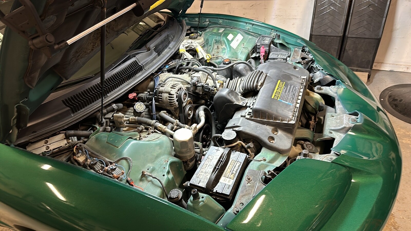 3.8 liter V6 the very reliable GM 3800 series. Automatic, power windows and locks. top is in good shape, runs and drives well with a great sounding new flow master exhaust. Also has new brake pads and rotors. Has hot heat and cold ac but could definitely use a charge, everything is in working order. Leaves small drops on garage floor , think it’s a trans pan gasket but fluid level is not low. Great running car that turns heads wherever it goes.