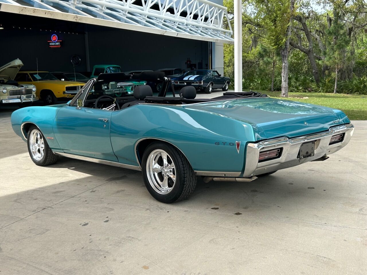 1968 Pontiac GTO Muscle Car Why This Car Is Special This is a true 242 VIN Code 1968 GTO Convertible we have here at Skyway Classics, it has a YS 400 cubic inch 350 horse modified engine. It is a rare GTO because only 9,980 convertible GTO's were produced in 1968 out of 87,684 total production. General Motors redesigned it's a-body for 1968, with a unique feature that was the body-color Endura front bumper. It was designed to absorb impact without permanent deformation at low speeds. Pontiac touted this feature heavily in advertising, showing hammering at the bumper to no discernible effect. Our GTO Convertible is loaded with options such as the Enduro Bumper, Hideaway headlights, Power steering, Wilwood disc brakes, Hurst His/Hers Dual Gate automatic shifter, Hood tachometer, custom polished mag wheels, and a black convertible top. Features 1968 GTO YS 400 cubic inch 350 horse modified engine Polished finned air cleaner Edelbrock polished finned matching valve covers Aluminum intake Holley carb Headers and dual exhaust Complete and detailed engine compartment Hurst His/Hers Dual Gate automatic shifted automatic transmission 10-bolt rear end Power steering Wilwood disk brakes Air conditioning Black later model GTO emblazoned twin front bucket seats Black rear seat and door panels Wood-like paneling on the dash Factory radio Factory and accessory gauges Three-spoke wood Pontiac steering wheel Air conditioning Hurst shifter Center console Black carpeting with blue GTO floor mats Bold blue paint job Endura front bumper Hide-Away Headlights Hood Tac Dual Mirrors Chrome 5-spoke polished aftermarket mag wheels Black sidewall tires Black convertible top Mechanical The engine is a YS 400 cubic inch which was rated at 350 horse from the factory but has been modified and has a polished finned air cleaner, Edelbrock polished finned matching valve covers, aluminum intake, Holley carb, headers and dual exhaust, and sits in the complete and detailed engine compartment. Hot Rod tested a 1968 GTO equipped with the standard engine and obtained a quarter mile reading of 14.7 seconds at 97 mph in pure stock form. Best of all, you have complete control over this V8 thanks to the Hurst His/Hers Dual Gate automatic shifted automatic transmission and 10-bolt rear end, power steering, Wilwood disk brakes, and even air conditioning. Interior Our GTO has a black later model GTO emblazoned twin front bucket seats with a black rear seat and door panels, interior that has all the right vintage details like the wood-like paneling on the dash, factory radio, factory and accessory gauges, three-spoke wood Pontiac steering wheel, air conditioning, Hurst shifter, center console, and black carpeting with blue GTO floor mats. Exterior The GTO is the father of the muscle car, and nothing showcases a muscle car better than a bold paint job like the blue GTO we have. It has the Endura front bumper (exclusive to real-deal GTOs in '68), Hide-Away Headlights, Hood Tac, Dual Mirrors, and rides on custom chrome 5-spoke polished aftermarket mag wheels and black sidewall tires with great sounds coming out the dual chrome tips. Pontiac abandoned the familiar vertically stacked headlights in favor of a horizontal layout, but made hidden headlights available at extra cost which ours has. The concealed headlights were a popular option. The signature hood scoop was replaced by dual scoops on either side of a prominent hood bulge extending rearward from the protruding nose. Conclusion You just don't find many GTO's like this stunning 1968 GTO Convertible we have at Skyway Classics. It looks, runs, and drives fantastic. The 1968 GTO won the Motor Trend Car of the Year Award and this one can be your car of the year for many years to come too. So give us a call at855-205-0486. Disclaimer Information found on the website is presented as given to us by the owner of the car, whether on consignment or from the owner we bought it from. Some Photos, materials