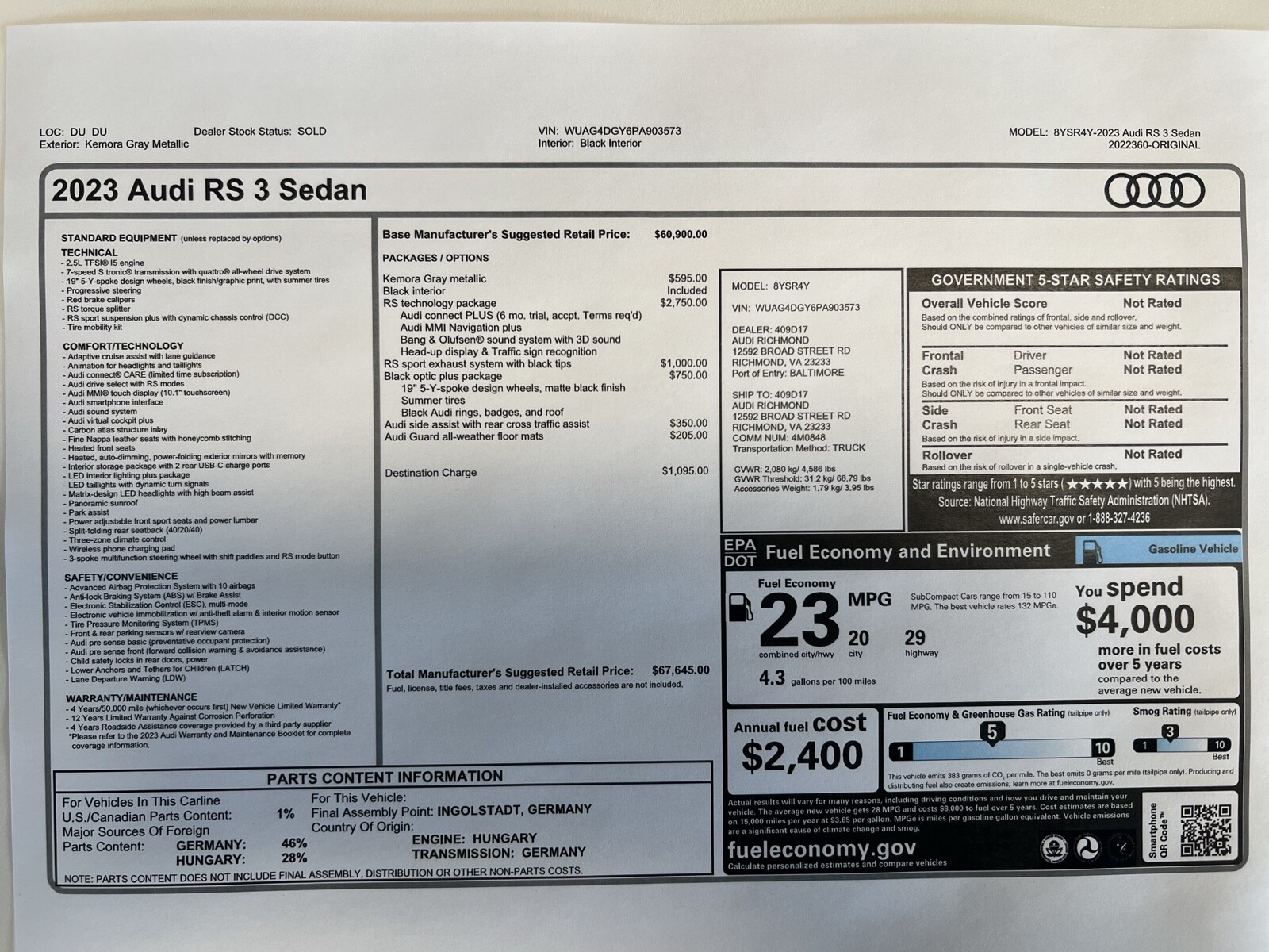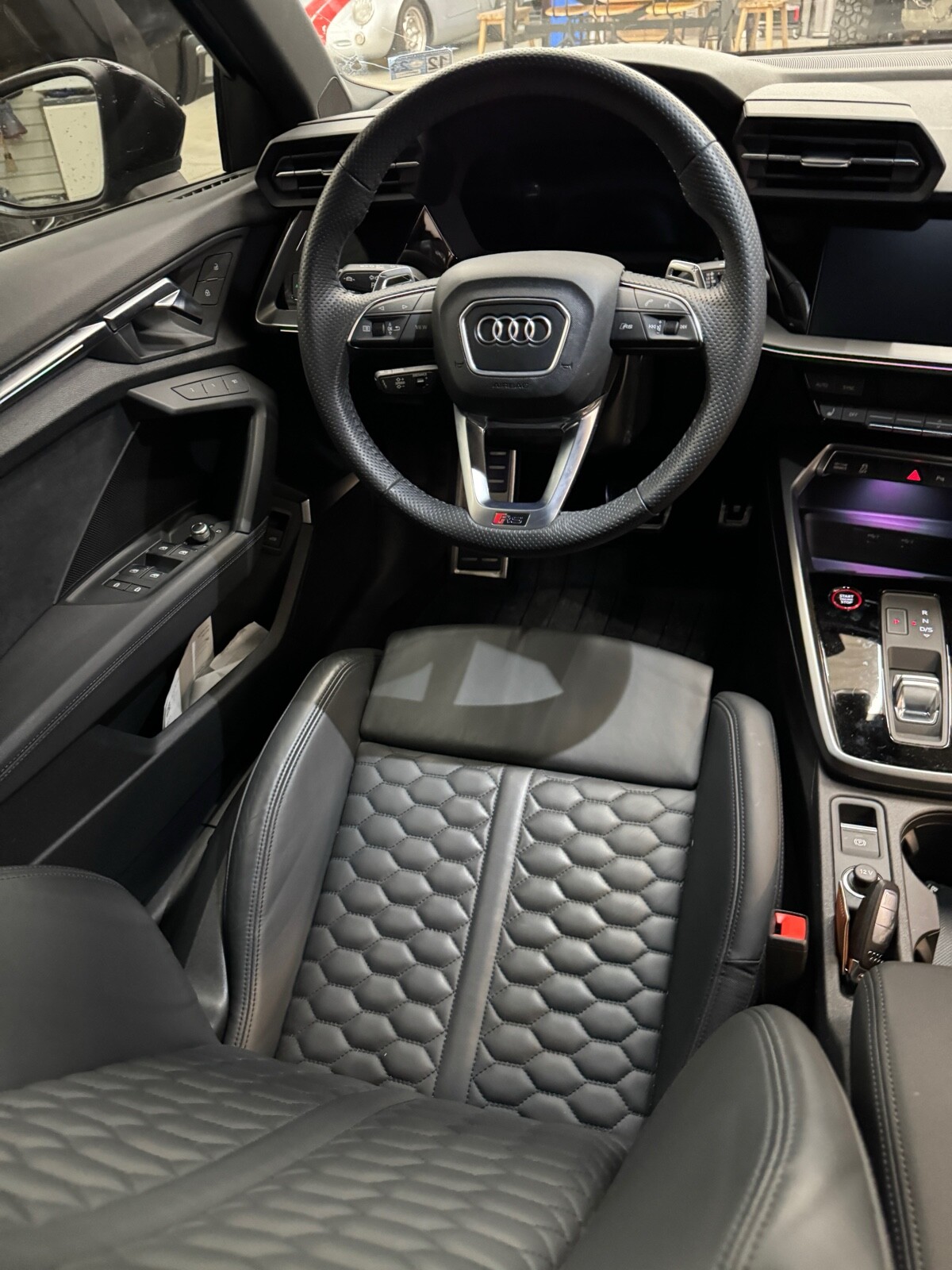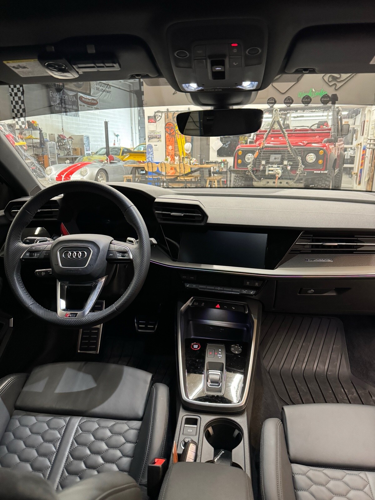 This 2023 Audi RS3 is a stunning vehicle that promises to deliver an exceptional driving experience. With a clean title and only 9970 miles on the odometer, it's clear that this car has been well-cared for. The sleek grey exterior is sure to turn heads while the powerful engine under the hood provides an exhilarating ride. The current owner has had this car for just one year and has used it as a daily driver. Despite the regular use, the car runs great and has been meticulously maintained. If you're looking for a high-performance vehicle that is both stylish and reliable, this Audi RS3 is an excellent choice.Hello, I am selling my 2023 Audi RS3 in Kemora Grey from my collection. The car is in great condition, here is a list: Bang & Olfsen sound system Technology Pack RS Design Pack Carbon Inlay Black Optics Full front PPF PPF Roof and side skirts Audi Care paid until 50,000 miles (stays with car) Just had full paint correction and ceramic coating Painted OEM wheels (Porsche satin Neodyme) Wheel stud conversion Wheel spacers AWE Track exhaust (OEM exhaust included) Ceramic tint Still under full warranty and serviced at my local dealership. Happy to do a PPI. There is no aftermarket tune for these YET. So it has never been flashed. IROZ is working on a new ecu for 150+ more hp., however it is not available yet. I’m a big Audi guy, I’ve had almost everything. This is by far the best handling and best feeling Audi I’ve owned. The noise, the steering, the drive modes. It’s incredible.Vehicle Details