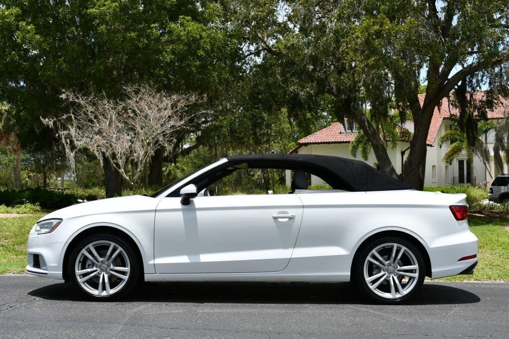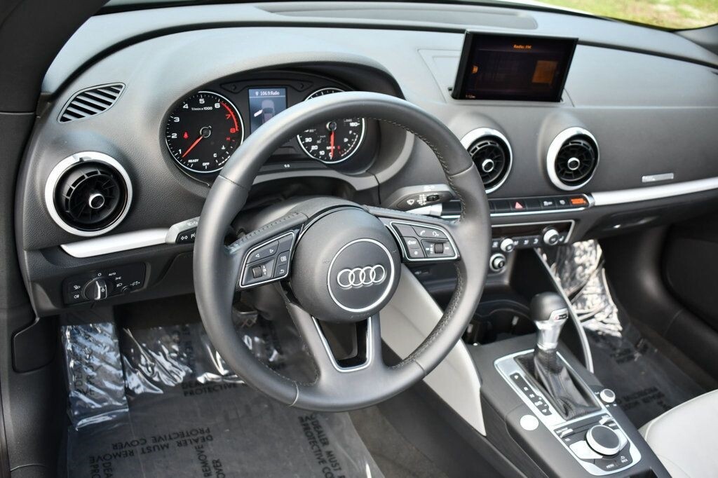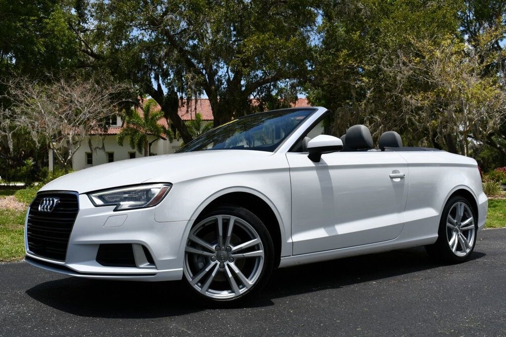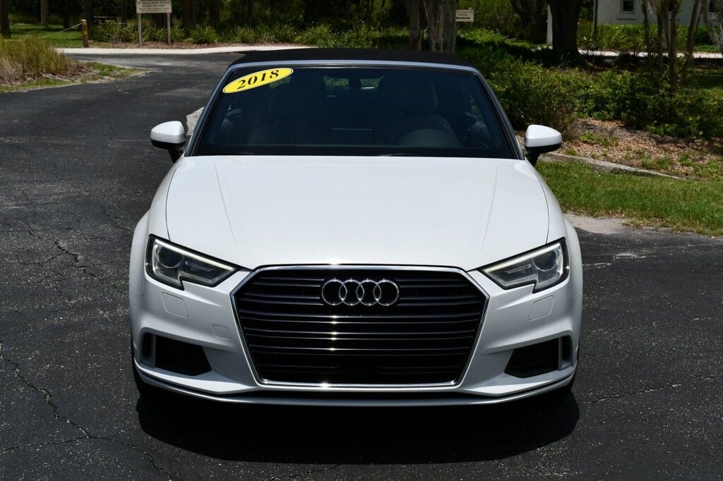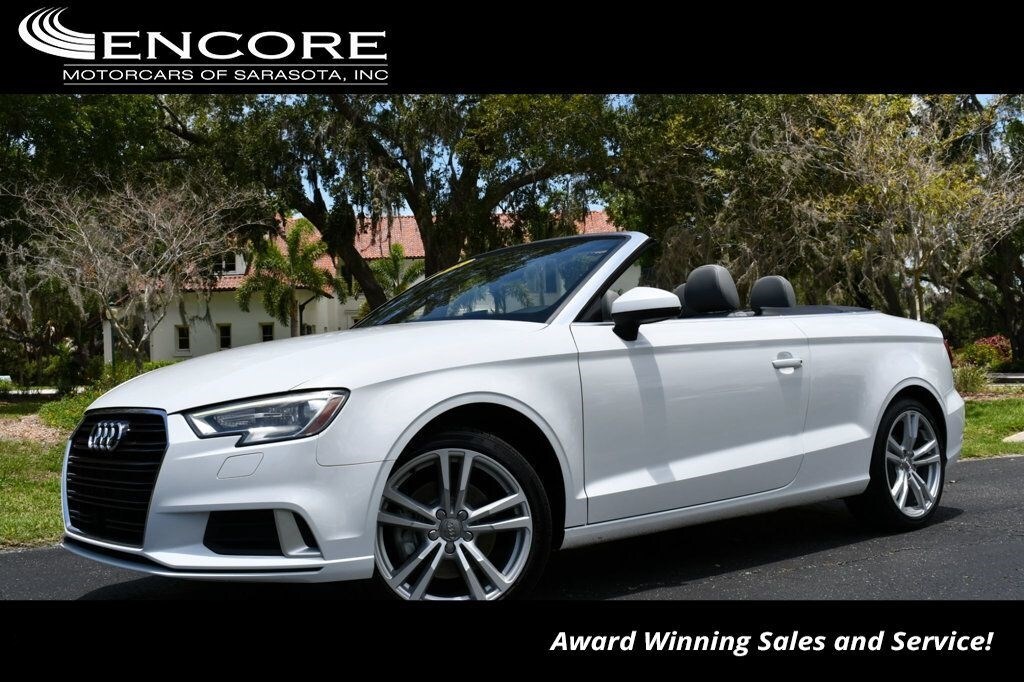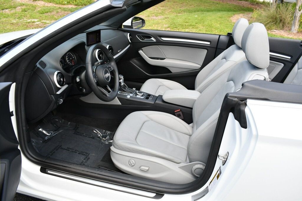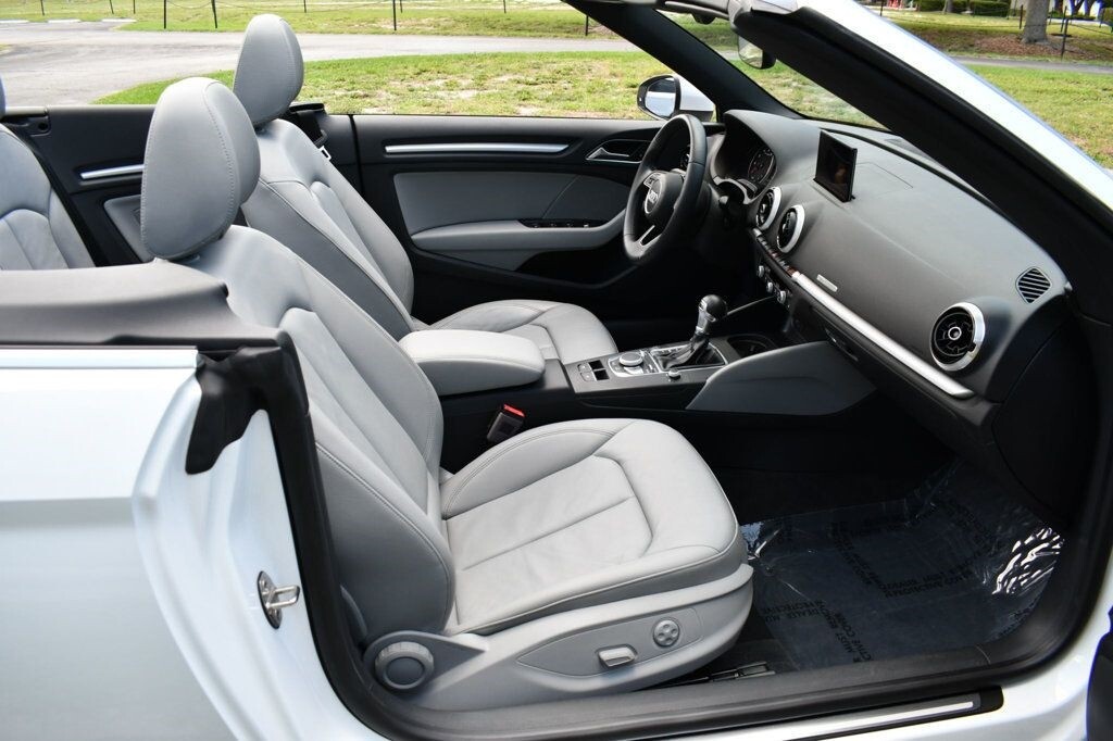 This 2018 Audi A3 Cabriolet 2dr 2.0 TFSI Premium FWD with Convenience Package features a 2.0L 4 CYLINDER 4cyl Gasoline engine. It is equipped with a 7 Speed Automatic transmission. The vehicle is Glacier White Metallic/Black Roof with a Rock Gray Leather interior. It is covered by a limited warranty. - Air Conditioning, Climate Control, Dual Zone Climate Control, Cruise Control, Power Steering, Power Windows, Power Door Locks, Power Mirrors, Leather Steering Wheel, Power Drivers Seat, Power Passenger Seat, Clock, Tachometer, Digital Info Center, Tilt Steering Wheel, Telescoping Steering Wheel, Steering Wheel Radio Controls, Driver Airbag, Passenger Airbag, Side Airbags, Keyless Entry, Security System, Traction Control, Rear Defogger, Intermittent Wipers, AM/FM, CD Player, Anti-Theft, Leather Interior Surface, Adaptive headlights, Android Auto, Apple CarPlay, Aux. Audio Input, Bluetooth, Carpeted Floor Mats, Center Arm Rest, Center Console, Child Proof Door Locks, Collision Avoidance System, Cup Holders, Daytime Running Lights, Front Heated Seats, Heated Mirrors, HID Headlamps, Power Brakes, Premium Alloy Wheels, Premium Sound, Rain Sensing Wipers, Rear Fog Lamps, Reverse Camera, Roll Stability Control, Tire Pressure Monitor, Vanity Mirrors -