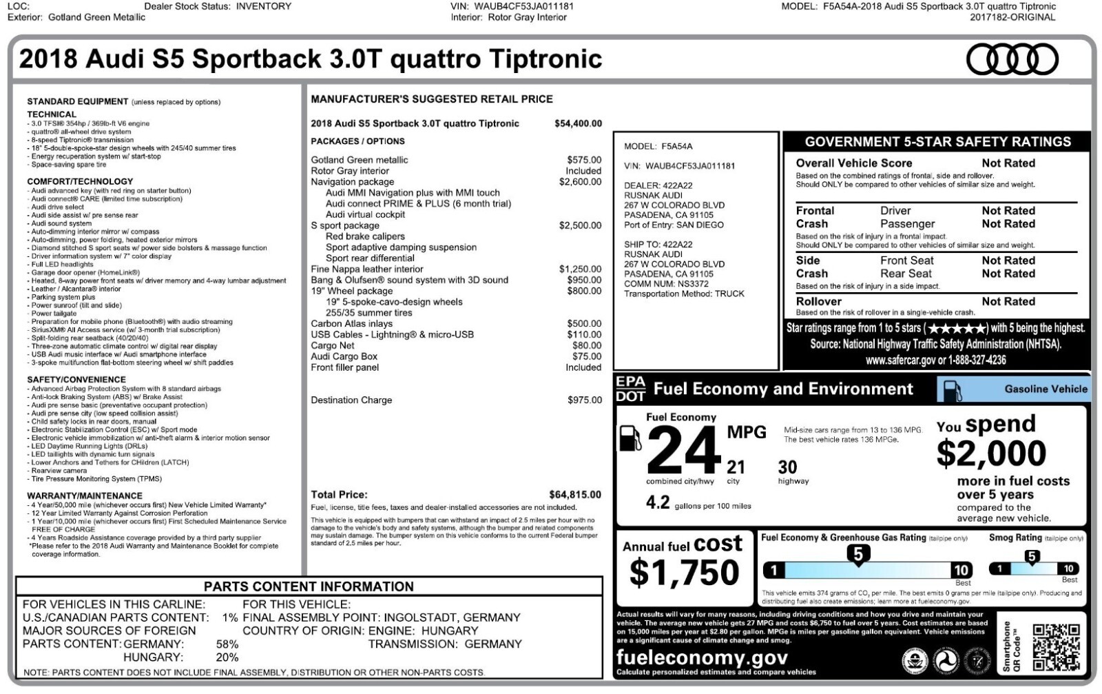 Rare color combo, Gotland green metallic, premium plus model, S sport package, upgraded bang & olufsen sound system, carbon fiber inlays, apple carplay, sport differential, adaptive damping suspension, virtual cockpit etc $64,815 MSRP When New. 20 Inch Black RS Style wheels and tires are brand new and may be shown in pictures are available for an additional $2495, Factory silver wheels are included in the price. Carfax does show an accident it was minor to see more details on this Click on the True 360 report towards the bottom of the carfax, or the link below (Link coming soon)