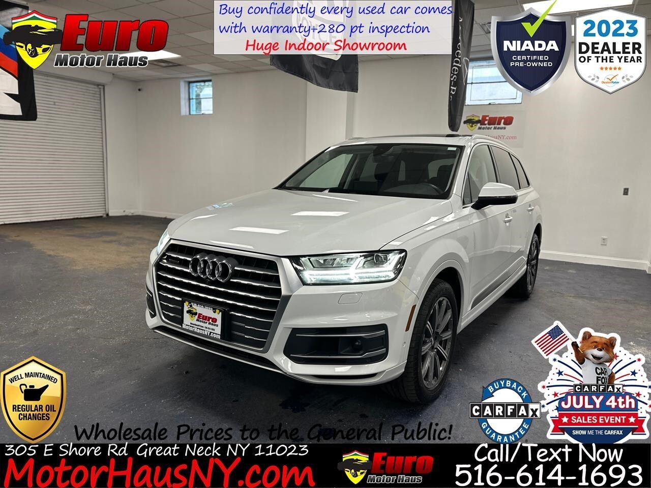 Introducing the 2019 Audi Q7 3.0 Premium Plus quattro, a remarkable vehicle with 41,664 miles that offers a superb driving experience. This stunning car boasts an elegant white exterior paired with a sleek black interior, exemplifying a timeless and classic color combination. With an original MSRP of $60,945, it delivers exceptional value for a luxury SUV. The Audi Q7 Premium Plus is known for its spacious and luxurious interior, featuring high-quality materials and advanced technology. The Premium Plus trim includes various impressive options, such as a panoramic sunroof, full LED headlights, Audi's virtual cockpit digital instrument cluster, a power-folding third-row seat, and a top-view camera system.Furthermore, the Audi Q7 is lauded for its responsive handling, smooth ride quality, and ample power from the 3.0-liter V6 engine. The quattro all-wheel-drive system provides excellent traction, making it a capable and versatile SUV that can handle various driving conditions.This Audi Q7 combines style, comfort, and performance, making it an excellent choice for those seeking a well-rounded and sophisticated SUV. Don't miss the opportunity to own this exceptional vehicle schedule a test drive today and experience its excellence for yourself! ? Call or Text 516-614-1693 prior to your visit for special internet pricing and quick answers to your questions ? Visit Euro Motor Haus online at to see more pictures of this vehicle or stop in person and view our large variety of certified pre owned luxury vehicles at 305 East Shore Road Great Neck NY 11023 or call/text us at516-614-1693 today to schedule your test drive. We are a FRANCHISE Affiliated Luxury Pre-Owned Car dealership connected to over 4 Franchise Dealerships. What that means for you is that we have ability to obtain you low rate financing through our major lending institutions. Wells Fargo TD Bank Capital One Bank Bank of America US Bank Exeter auto finance Chase Automotive Ally Financial Santander Key Bank all NY based credit unions and many more.The benefits of which are then transferred to our clientele. We are able to offer FRANCHISE finance rates up to 84 months. With our affiliation we are also permitted to sell New Car Service Contracts here with our CERTIFIED PRE-OWNED PROGRAM backed by SafeGuard and GWC and NIADA Warrantech . Come in and have our friendly and knowledgeable staff facilitate your needs. Euro Motor Haus Inc does not guarantee any ad disclaimer guarantees etc on any 3rd party website.Please note that the advertised price does not include sales tax registration DMV transportation of vehicle costs incurred by the dealer as for safety including but not limited to brakes tires and fluids and any additional fees required by law. Prices exclude any additional charges included with the cost of closing including any governmental charges and taxes any finance charges documentation preparation or warranty. The advertised price represents the vehicle in its current condition and subject to change depending on any additional costs incurred or market fluctuations. Inventory prices are liable to change without warning. Vehicles are offered on a first come first serve basis. Please call to inquire. Advertised price includes all dealer rebates and incentives but not inclusive of certification & dealer prep. We make every attempt to adequately represent the condition and features of all inventory including vehicle information pictures pricing and status but there may be inaccuracies. Updates may be delayed. Dealer assumes no responsibility for inaccuracies in online information. All internet special prices expire at 11:59 pm today. Must present offer prior to expiration.All of our vehicles go through a rigorous Safeguard/ GWC & NIADA certified and backed inspection. They Are pre certified. You work you drive!!! Instant financing available!!! We have great relationships with many lending institutions and we are the Home of the Guaranteed Approval.All finance deals are subject to primary lender approval. Challenged credit no credit no problem! PRICES MAY DIFFER WITH PAYMENT OPTIONS. **Many are 1 owner or off lease vehicles. **Free Vehicle History Reports **100% TOTALLY Indoor Facility **Nationwide Financing available **Extended Service Contracts available **Our cars under 100k miles all come with at least a 30 day warranty standard **Many are out of state clean cars **Trade ins welcomed **No Haggle Pricing!